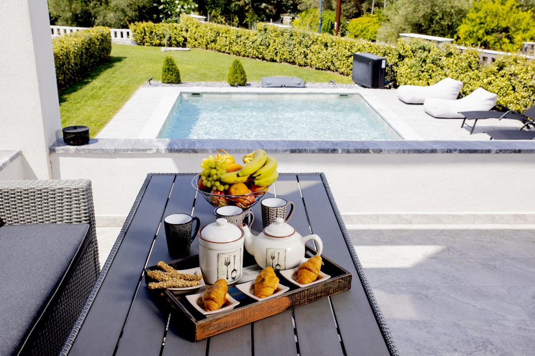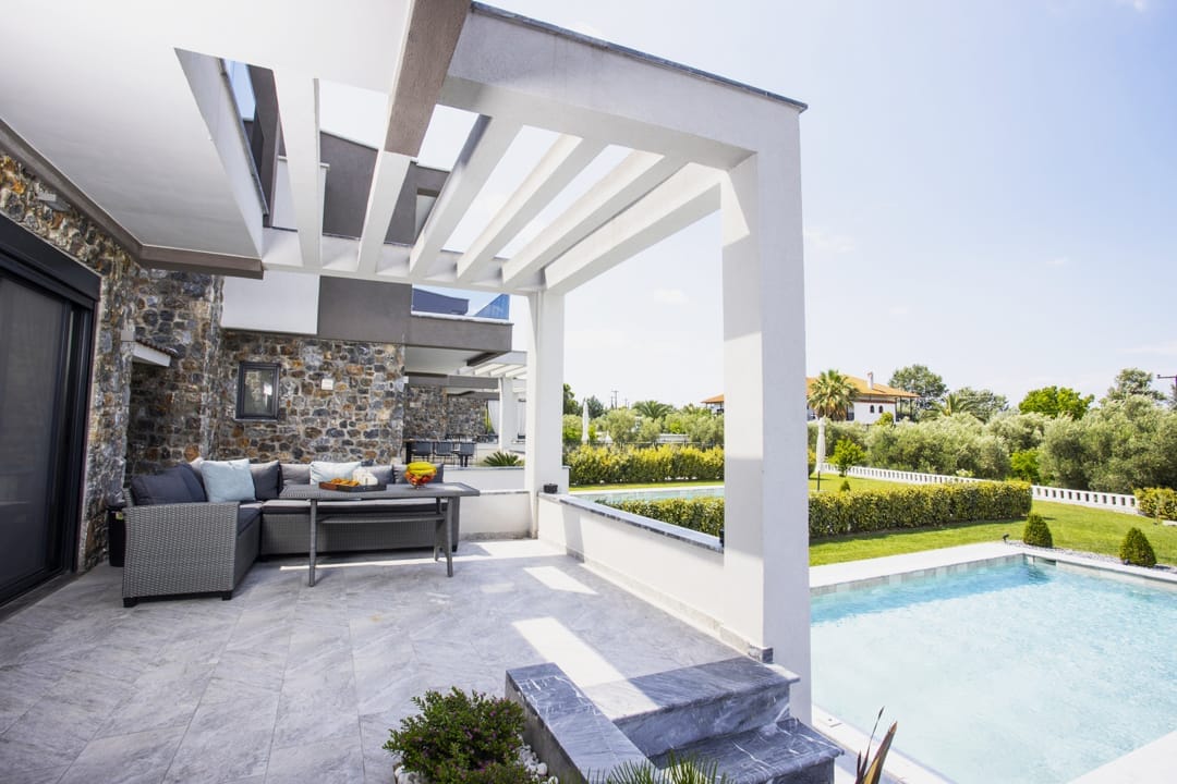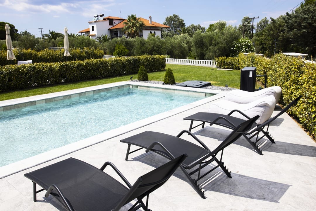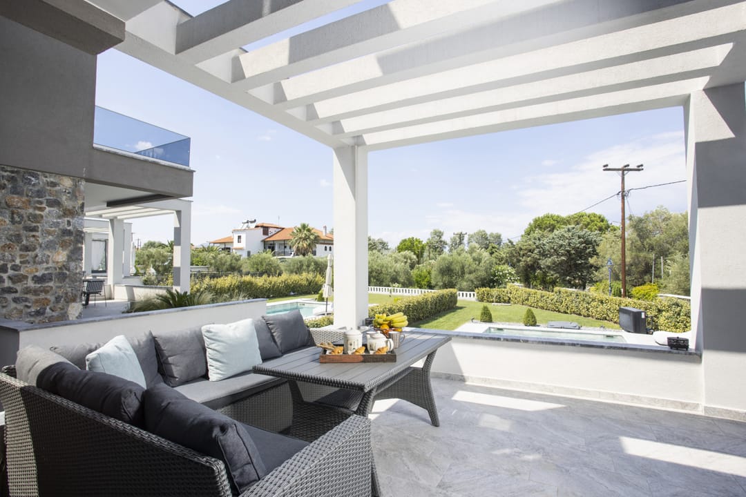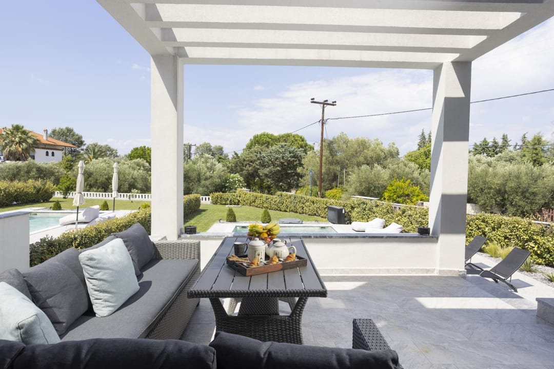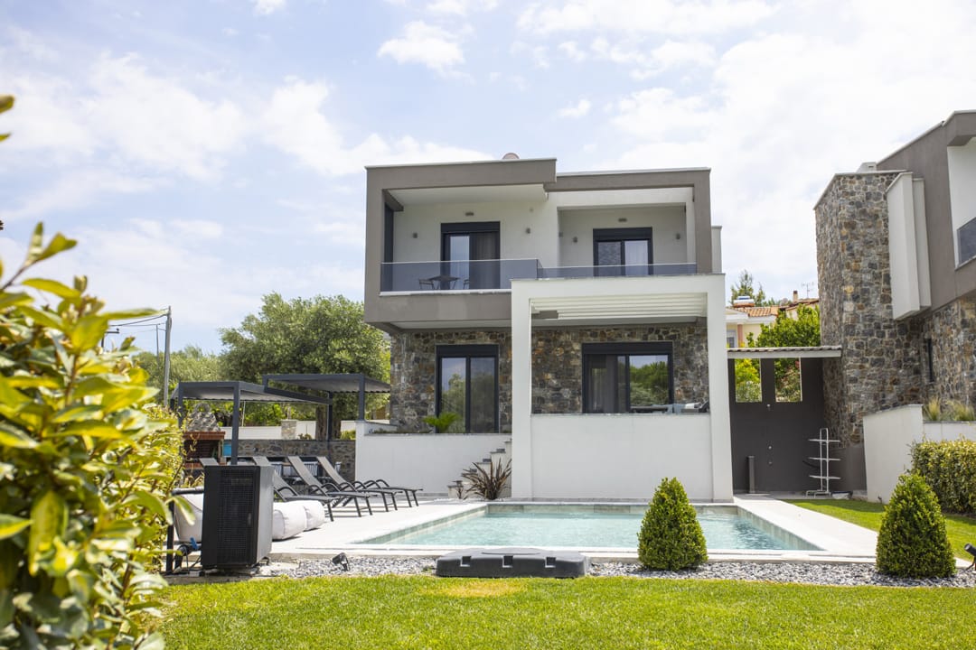 The new stylish villa Jasmin with 4 bedrooms and a private heated pool, located in the popular resort village of Hanioti, on the peninsula of Kassandra, Halkidiki, is for rent.