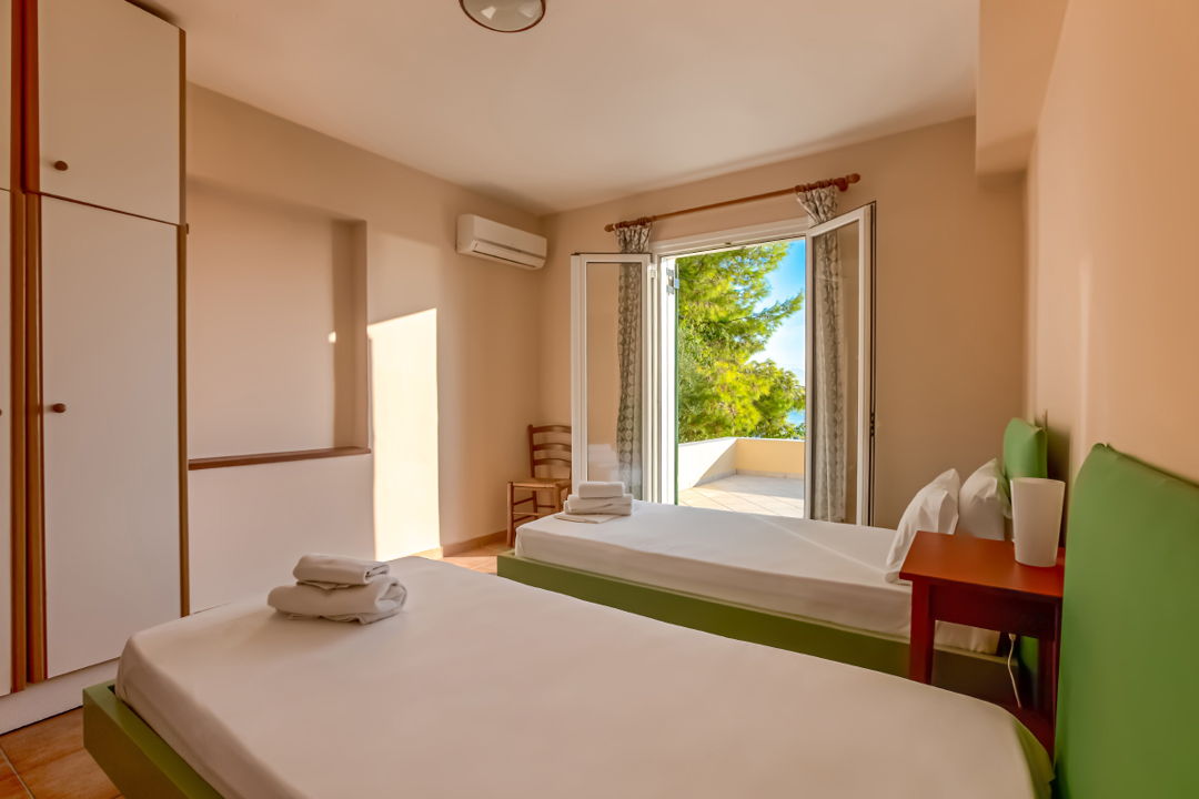 - 3rd bedroom with 2 single beds and access to the large veranda with sea view, garden furniture, and sunbeds