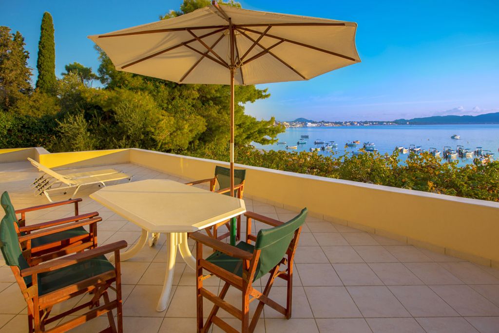 - Huge terrace with table, chairs, umbrella, sunbeds, and view to the sea