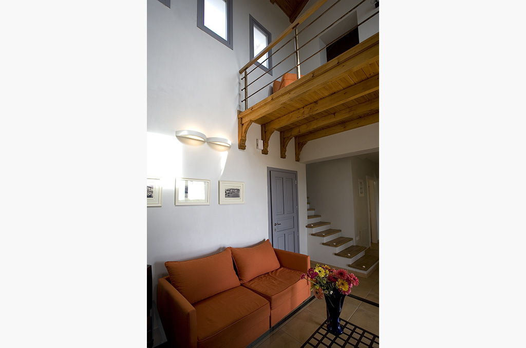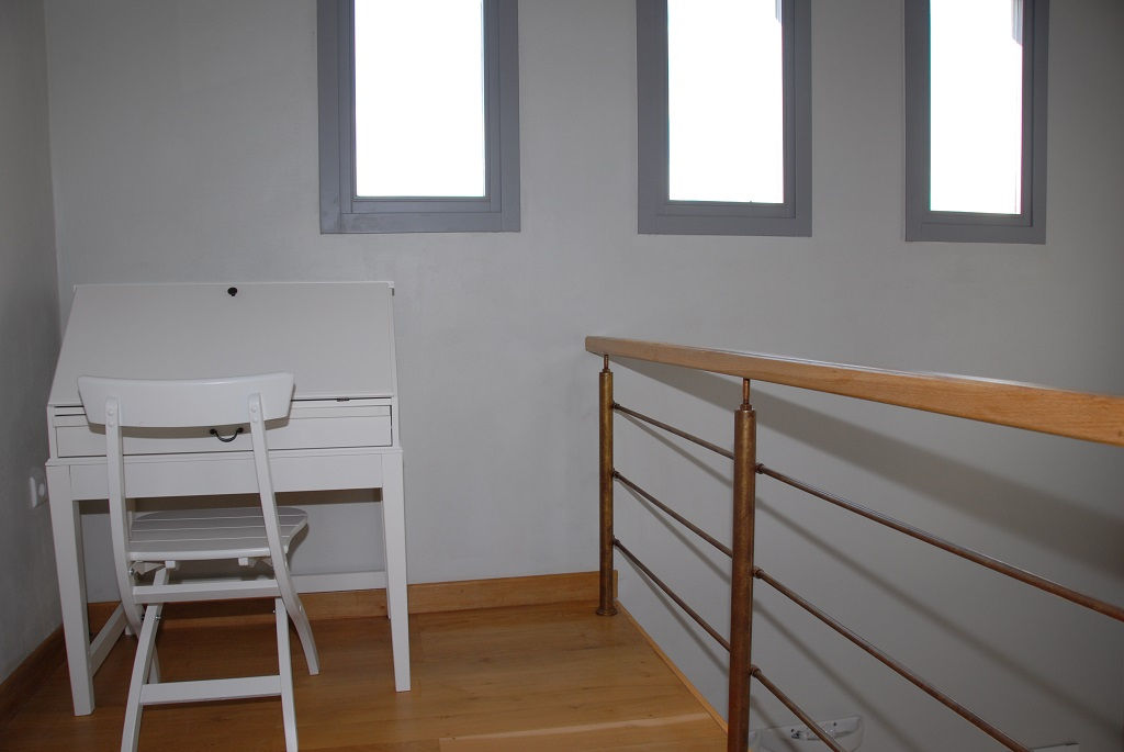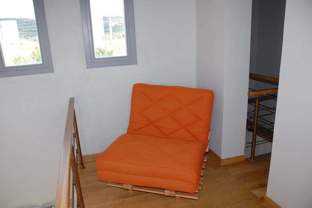 - Bright oaken attic with a desk and a sofa bed