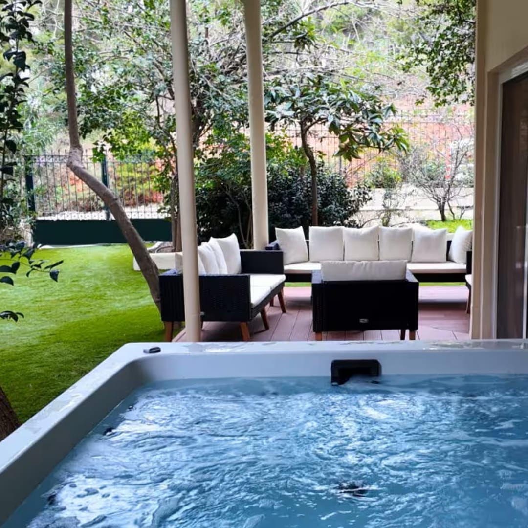A key highlight of this property is its private garden, offering a serene retreat with mature greenery and a comfortable outdoor lounge area — ideal for family gatherings, meals under the sun, or quiet relaxation. An outdoor jacuzzi adds an extra layer of luxury, perfect for day or evening use.