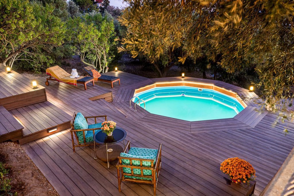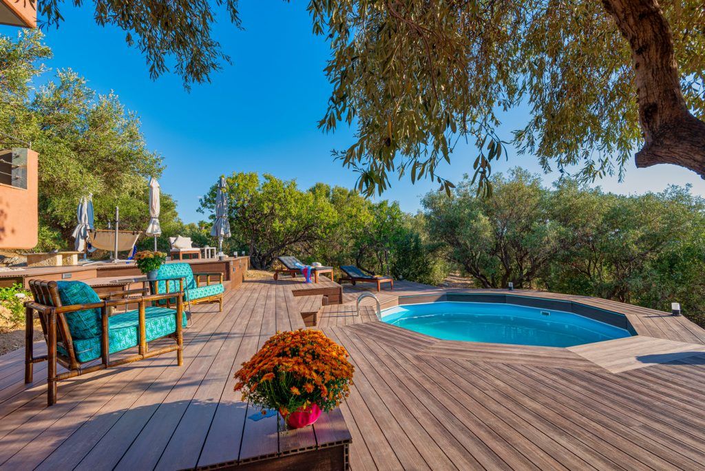 The villa is located within a 2-minute walk from the beach of Lagonissi with emerald blue waters and in the center of 5 acres of land, surrounded by olive and pine trees.