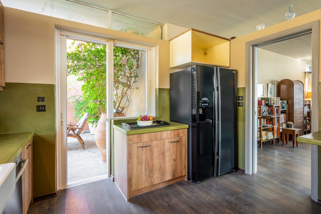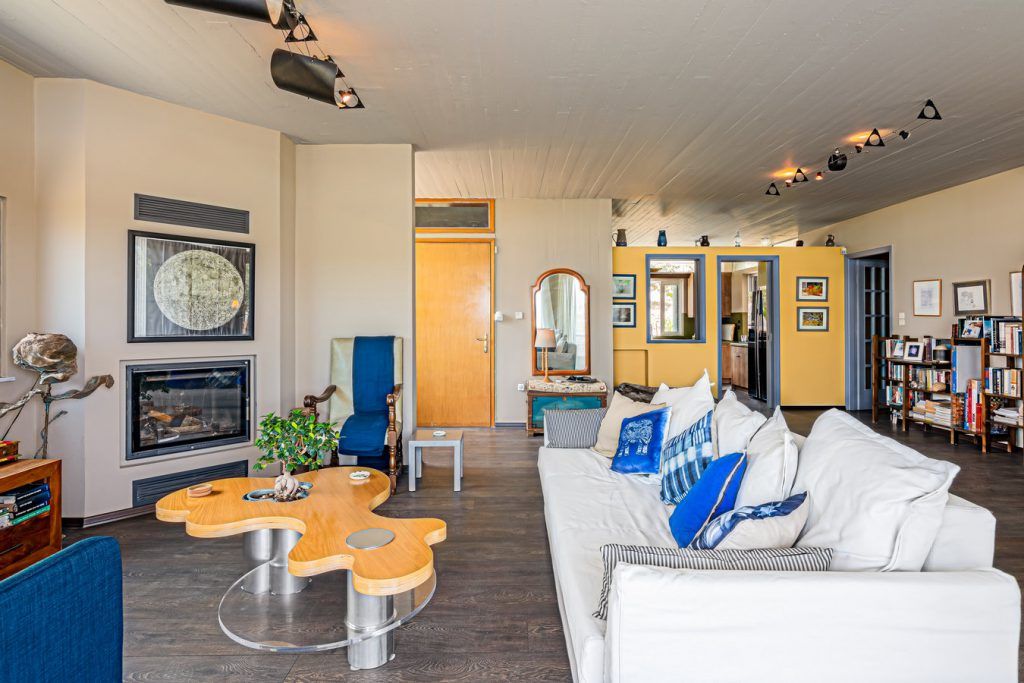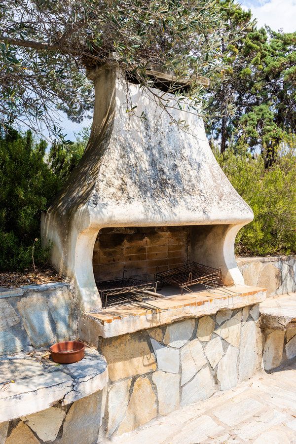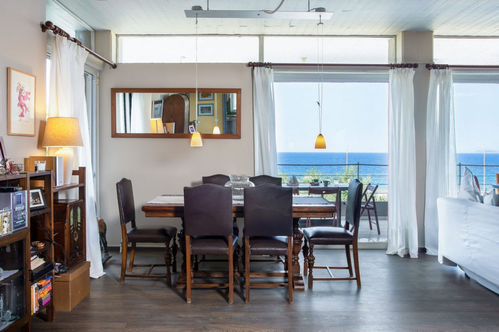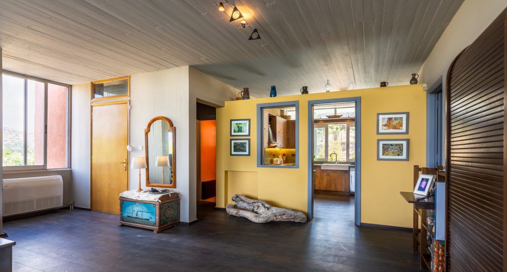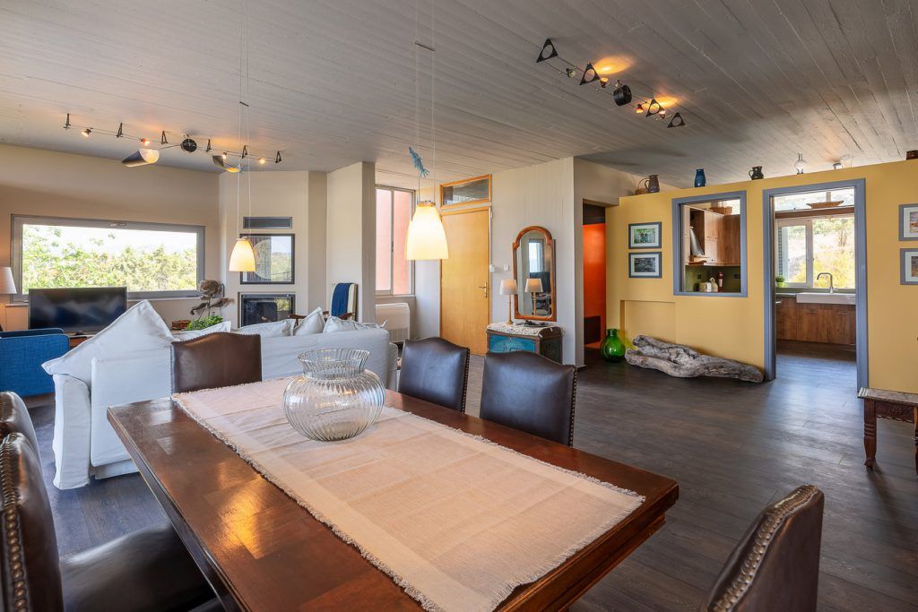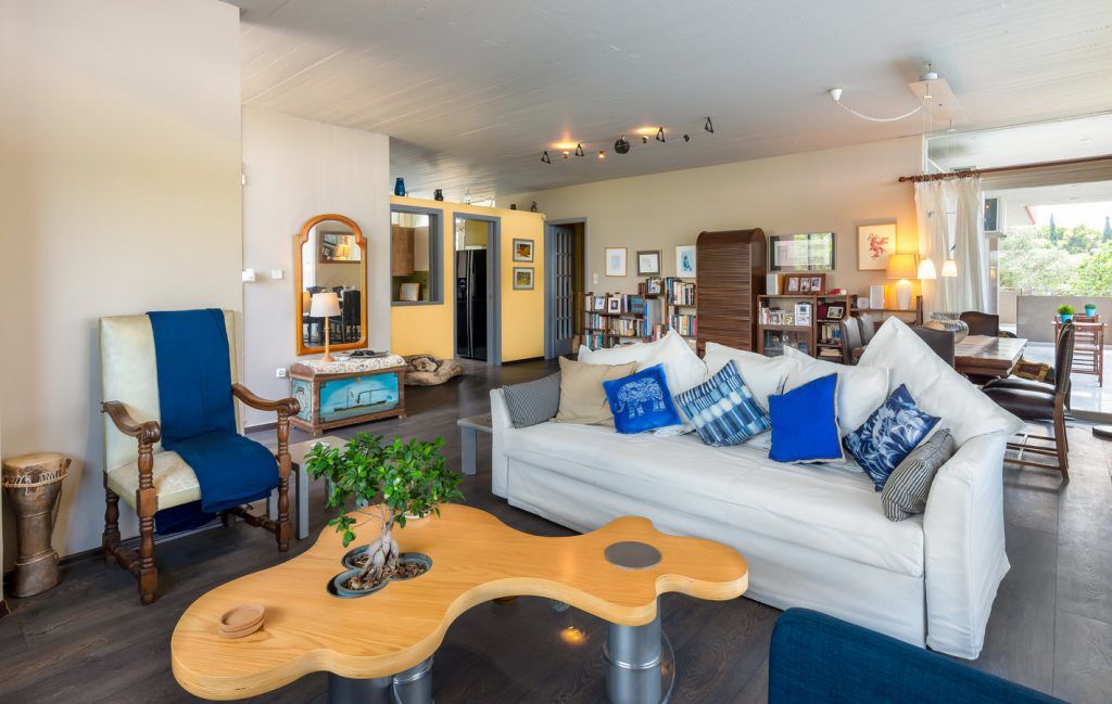 - A very spacious, comfortable and well-equipped living and dining area with a combination of antiques along with designed furniture by the architect owner is ready to welcome the guests. The living room has large openings with a view to the sea and the olive garden, almost unified to the front porch. The fireplace will be the focal point during wintertime. 3 sofa beds can be used as extra sleeping places.