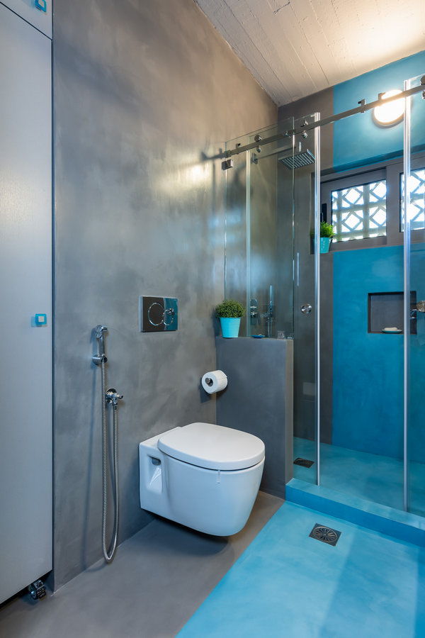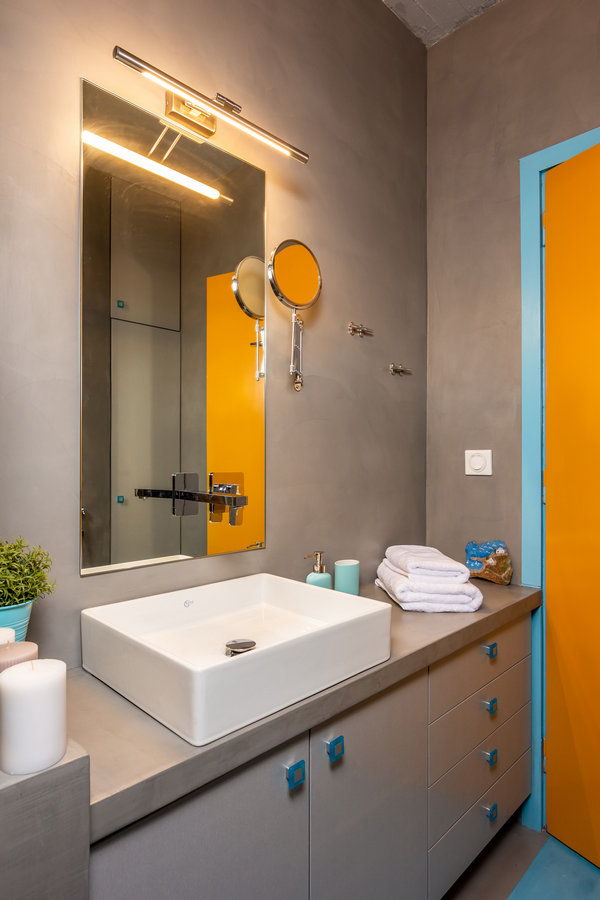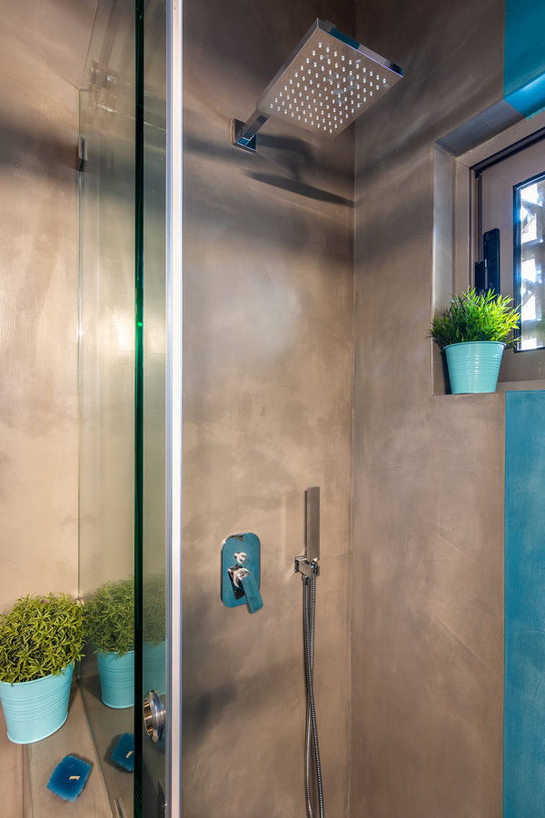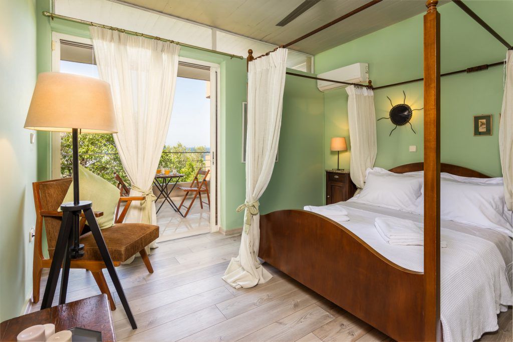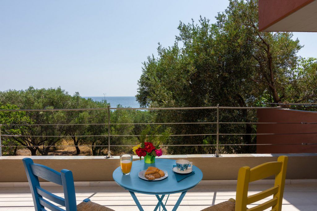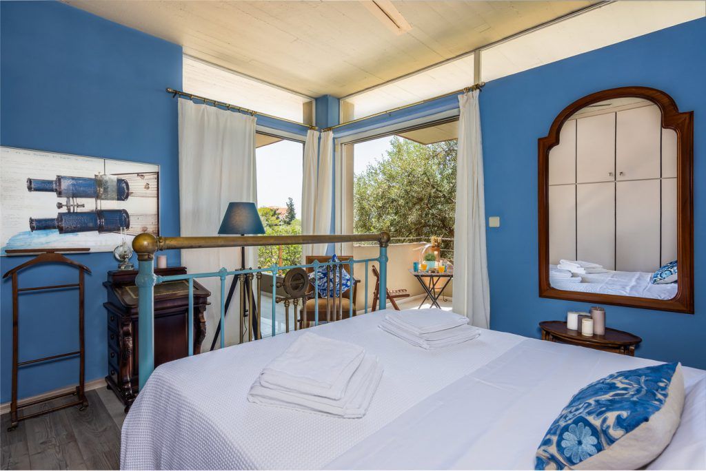 - 1st bedroom with two balcony doors, leading to a private veranda with the stunning 270 degrees view both to the olive trees garden and the sea. It is a modern bedroom with a double bed and a single bed in a warm ochre ambience.