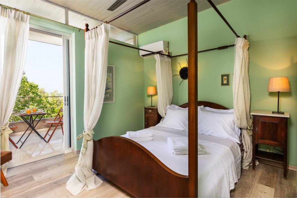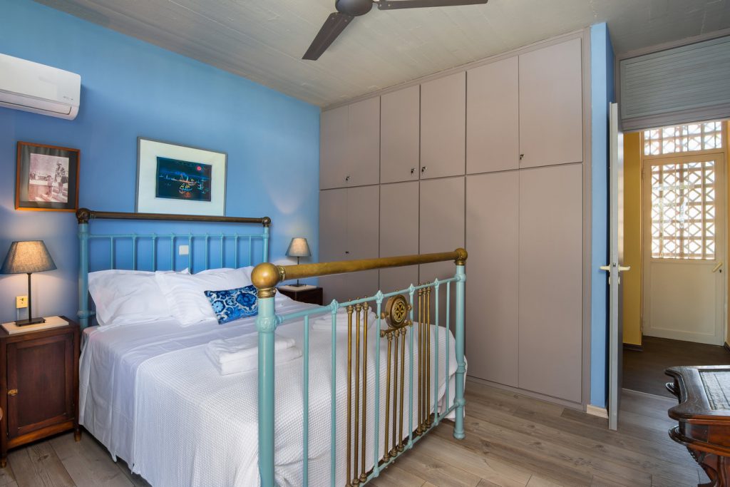 - 3rd bedroom with private balcony and view to the garden and the seaside, furnished with double bed and traditional wooden furniture.