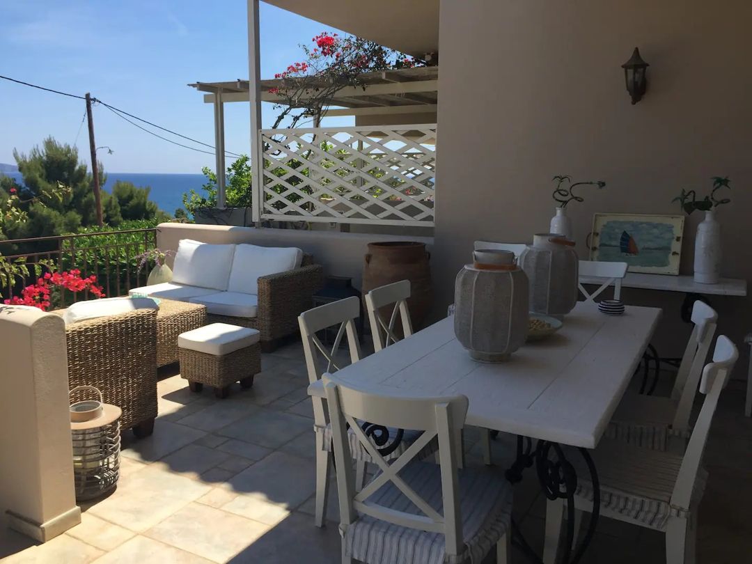 - On the veranda on the east side – a spacious dining area, two comfortable seating areas, a jacuzzi and a garden with breathtaking views of the sea and Dokos island
