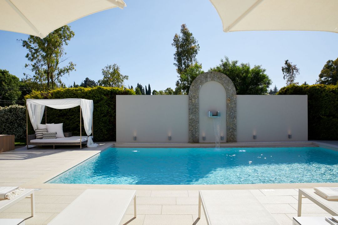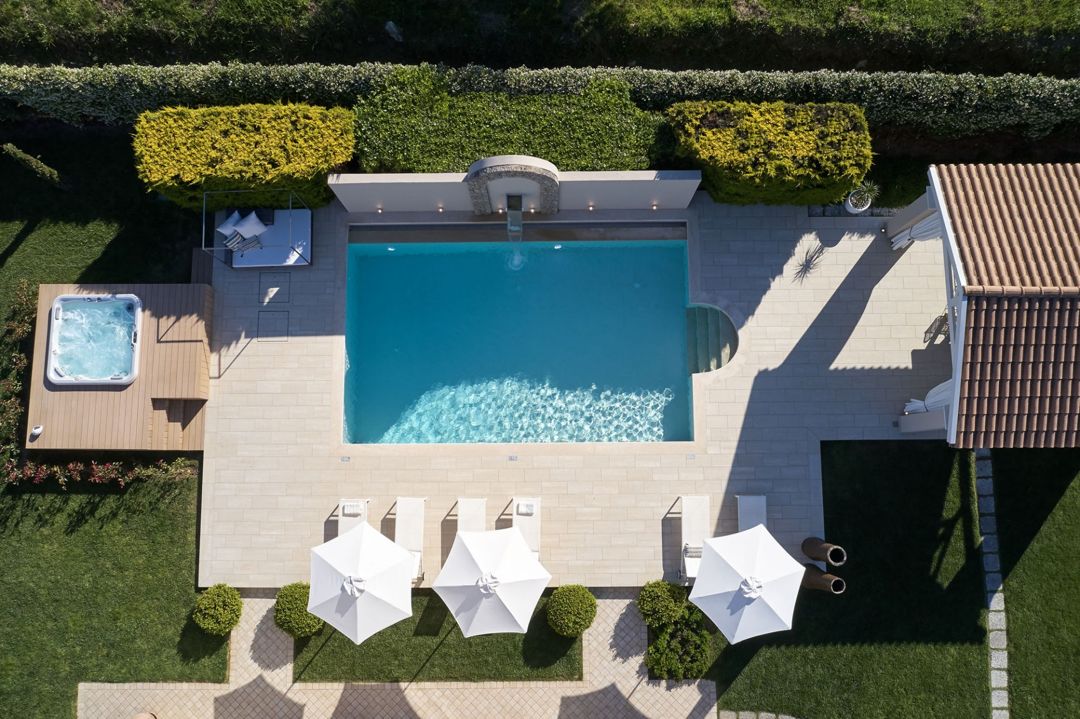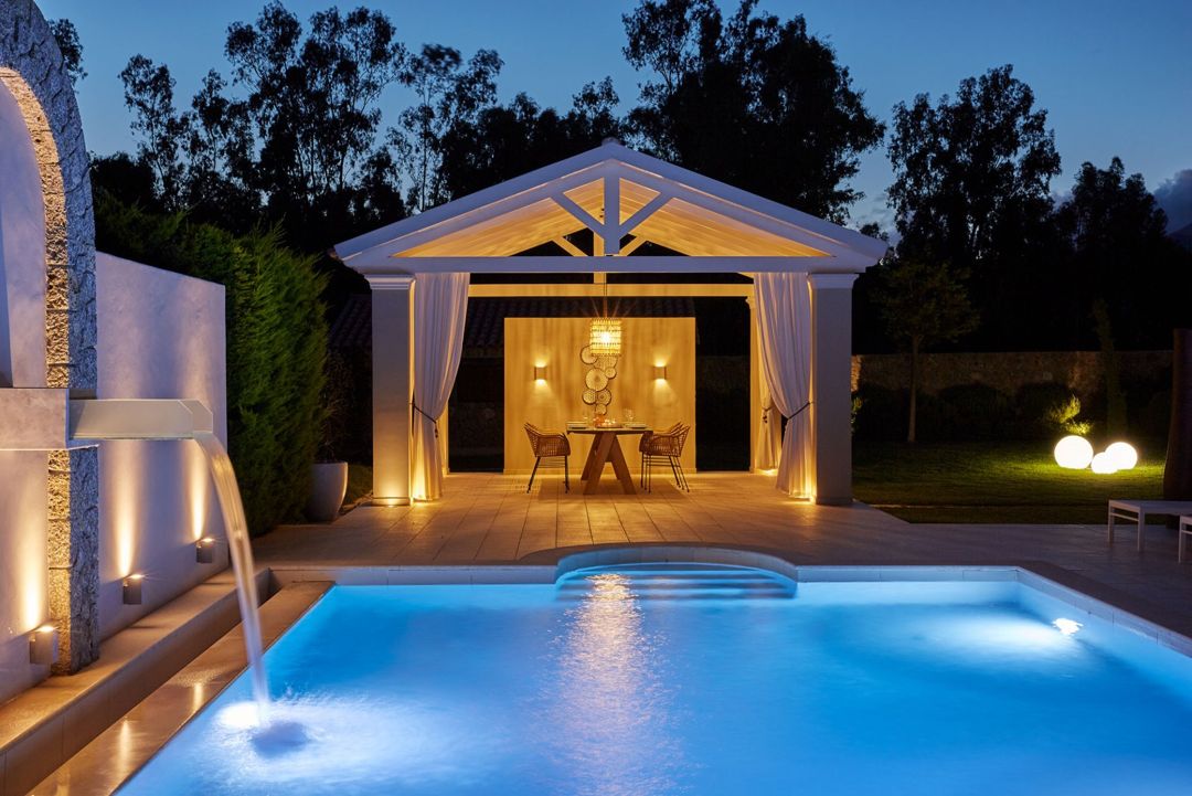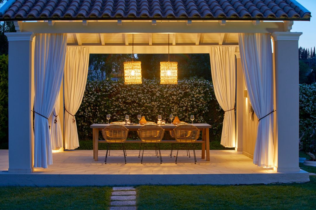 The villa is located in a complex of private villas and is ideal for a comfortable stay close to the beach and a relaxing vacation in Dassia village, one of the best locations in Corfu. A magnificent terrace gives access to the spacious garden with a gazebo, private swimming pool, and outdoor Jacuzzi.