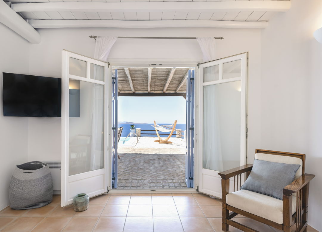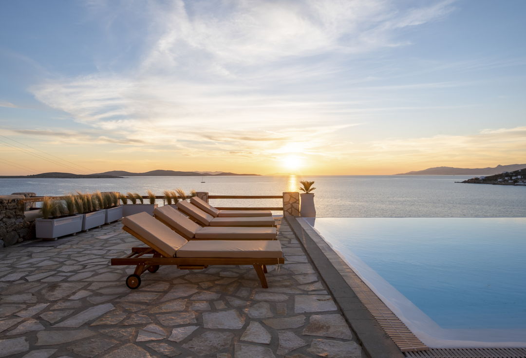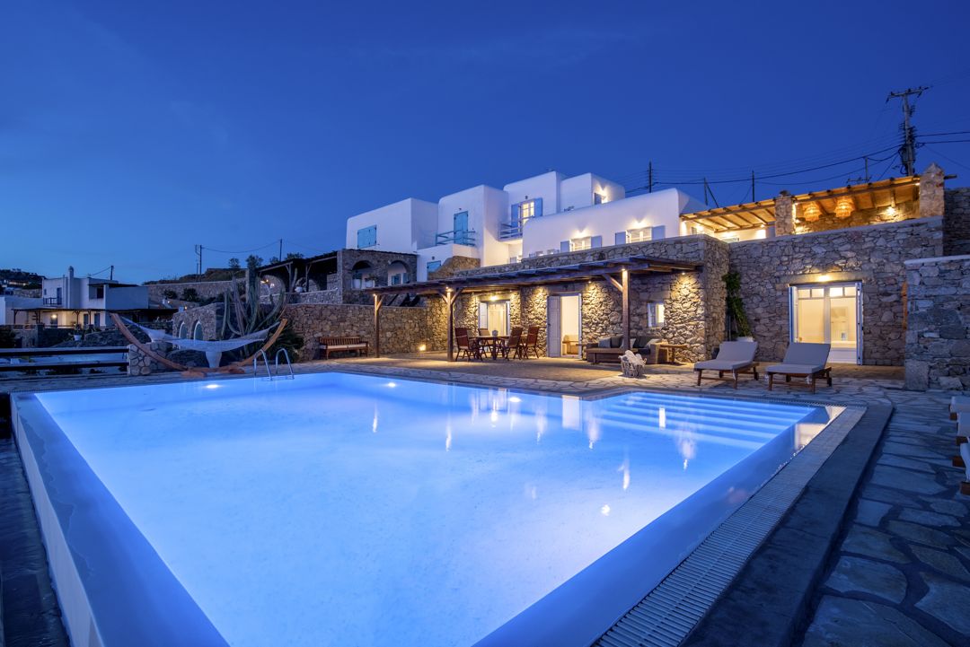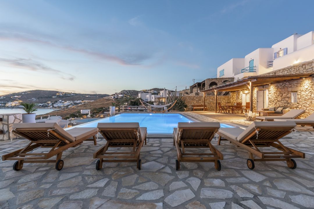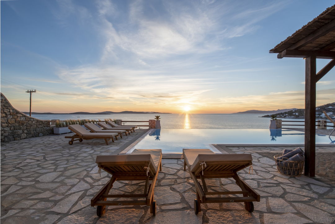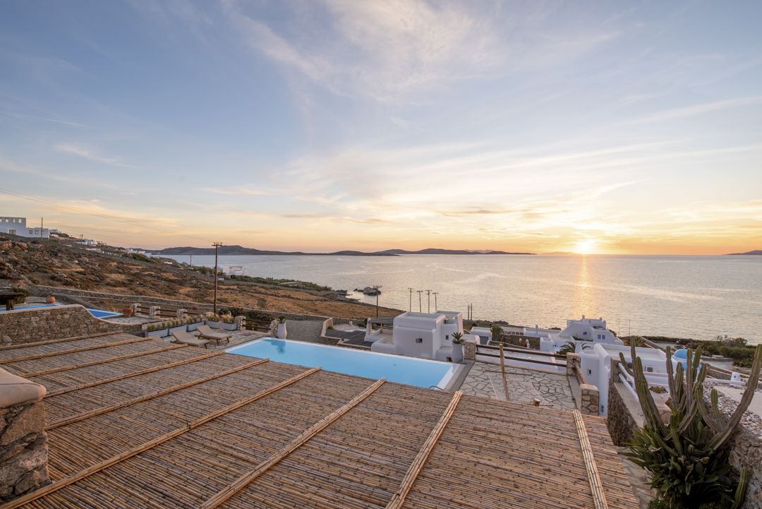 The Villa is part of a gated complex with independent villas, having access to a semi-private beach. Ornos and Agios Ioannis beaches are only a short ride away. This beautiful villa offers magnificent views, overlooking the Aegean Sea while facing the island of Delos and its colourful Mykonos sunset.