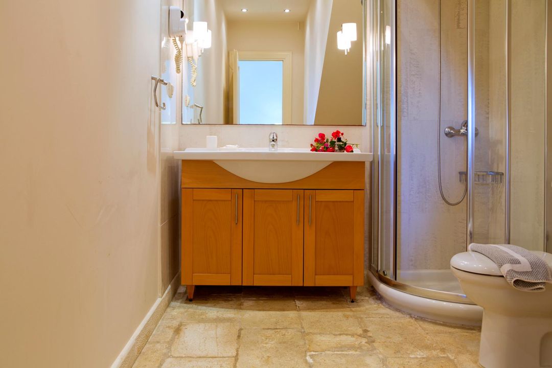 Cane-shade covers the large patio covered with marble and it’s ideal for dining outside in the summer breeze. Around the patio, there is a lawn garden and a few old olive trees and an almond tree that was saved by the owners. The terraces and first-floor balcony look directly onto the beach providing an ideal spot to contemplate the stunning sea views with a glass of local wine.