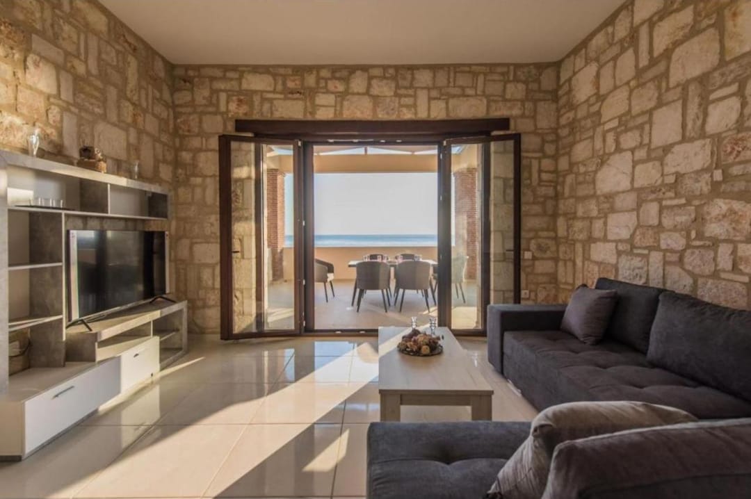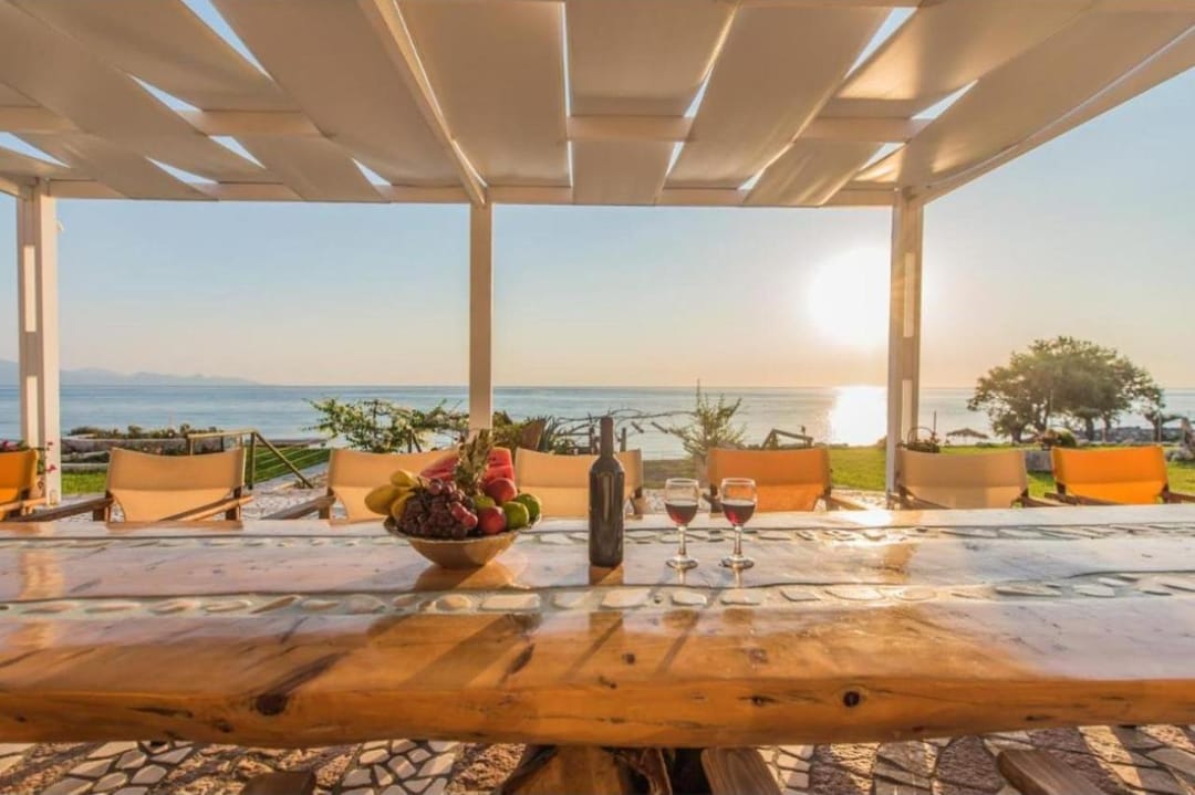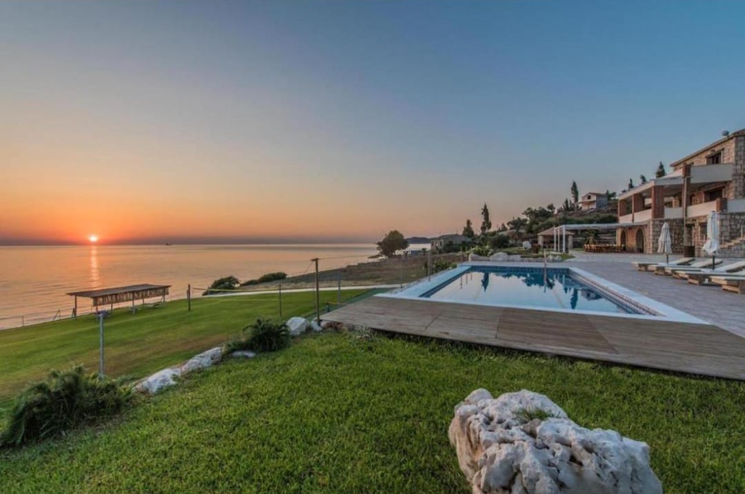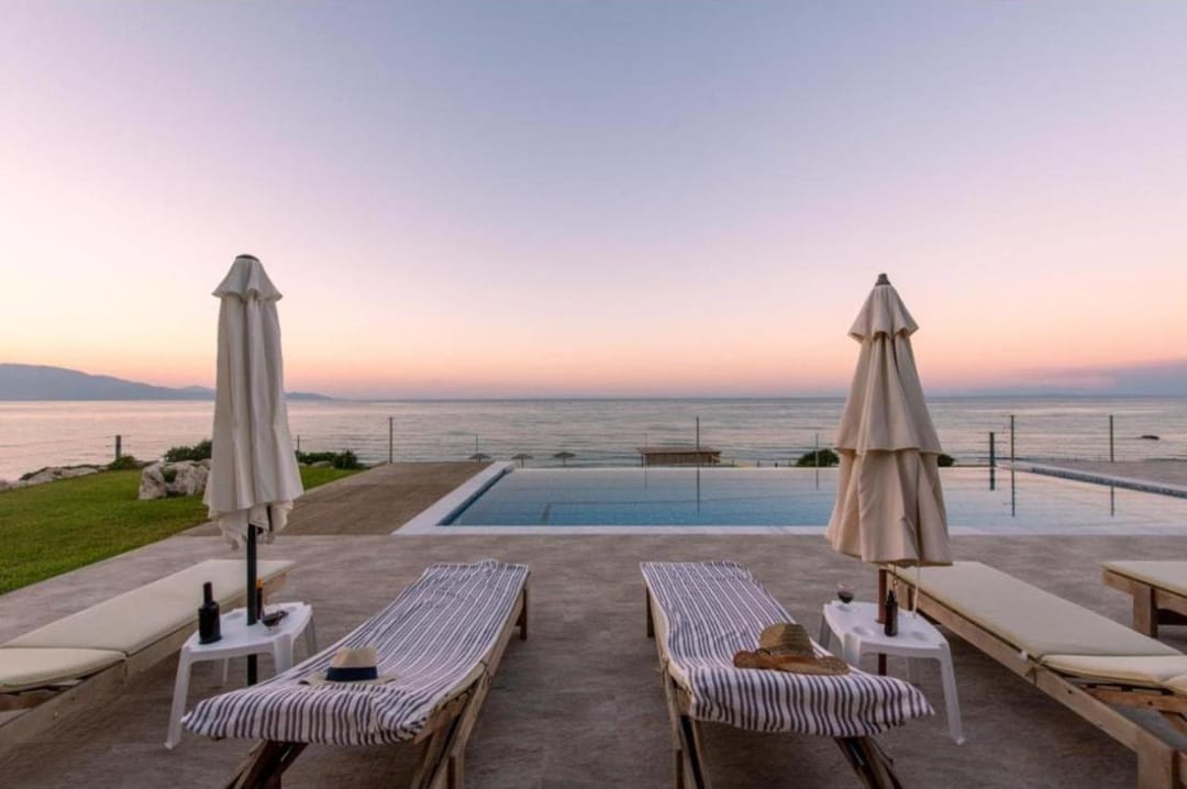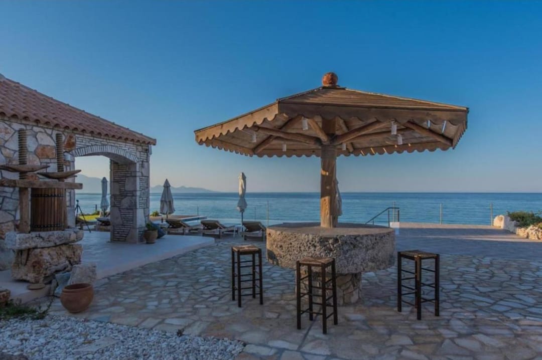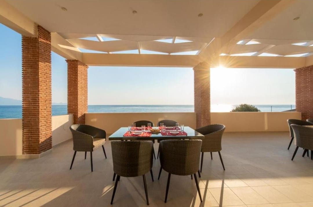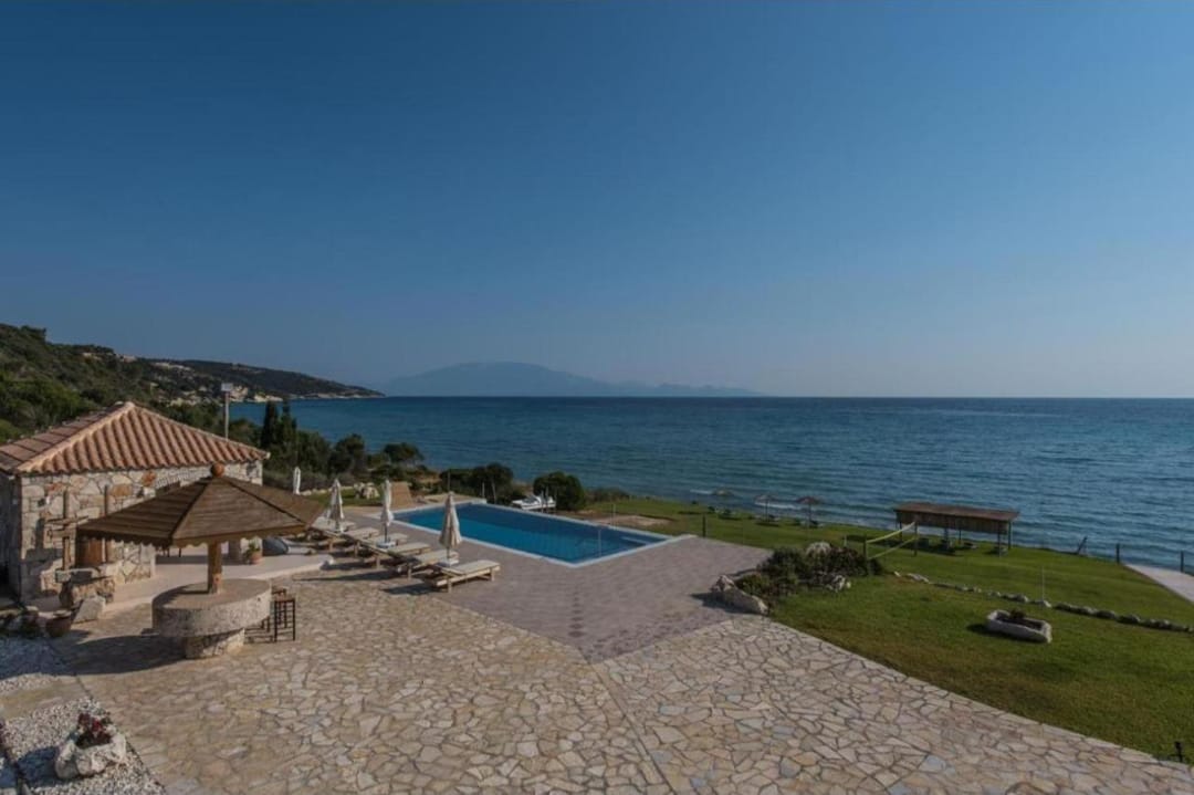 Beachfront spacious villa Margo with 6 bedrooms and a large private pool, located on the beach, near the village of Alykes, on the island of Zakynthos for rent.