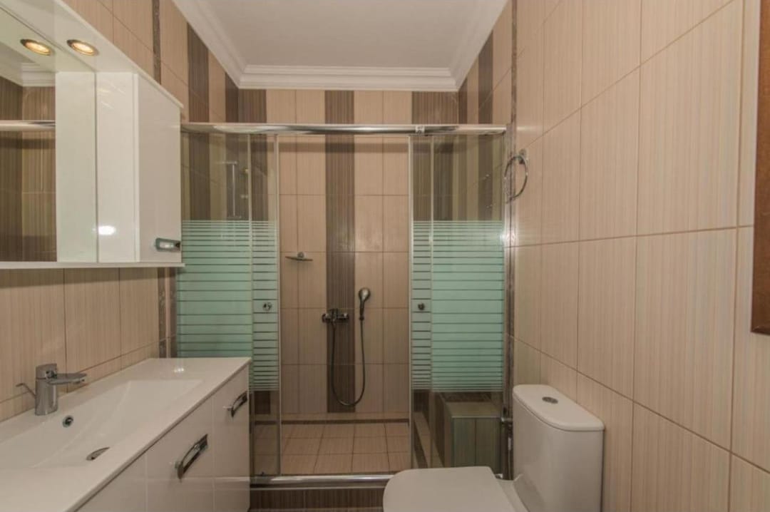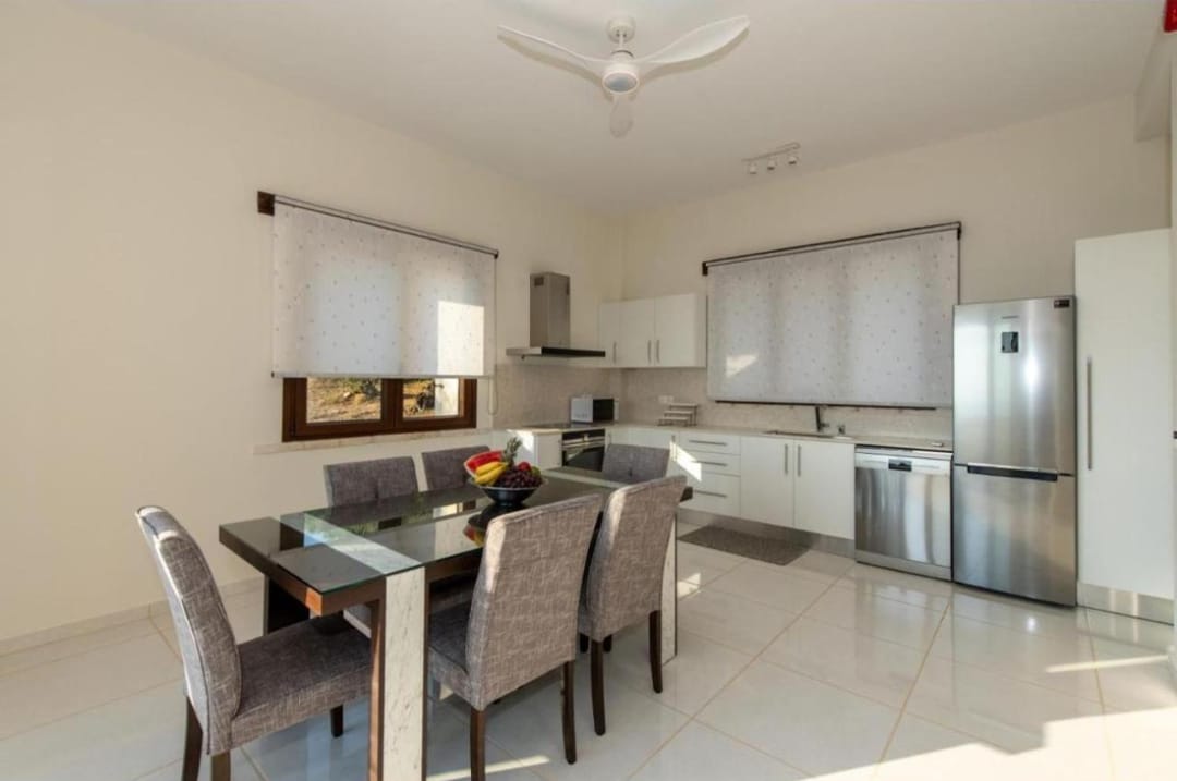The villa consists of three separate parts, each with its entrance, living room, kitchen, and 2 bedrooms with private bathrooms.