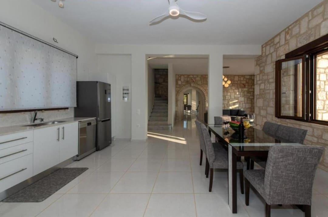 The villa is located in a quiet, secluded location, with a huge territory and an almost private beach. The amazing and unobstructed views offer guests the peace and tranquility they desire. It is the ideal setting to enjoy carefree private moments under the sun, take refreshing dives, and gaze at the sea and the landscape, which will help you to leave behind your everyday life and taste the Greek summer. The interior of the villa is spacious and bright, built in a traditional island style using natural stone.