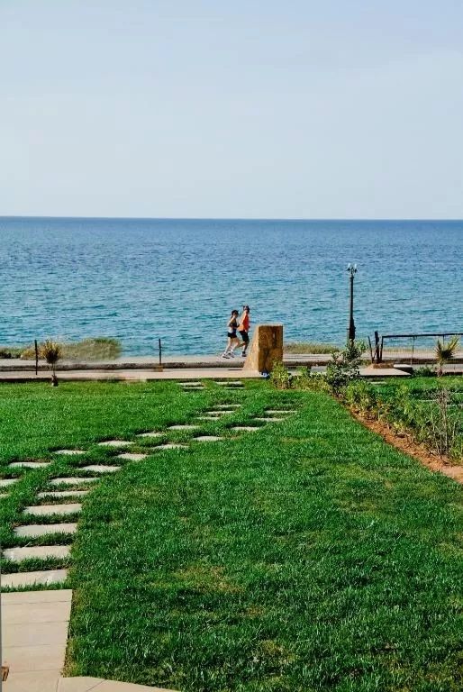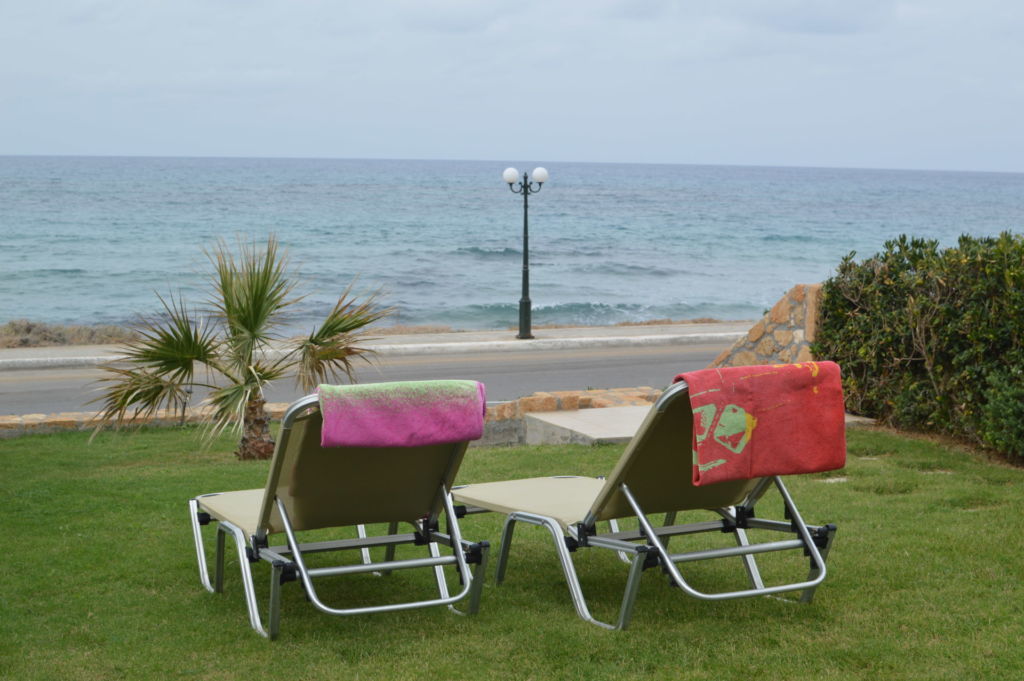 Seafront villa Maria with 3 bedrooms and a green lawn only 30 meters from the sandy beach in the popular resort village of Gouves, Crete Island for rent.
