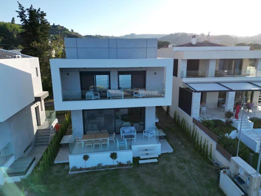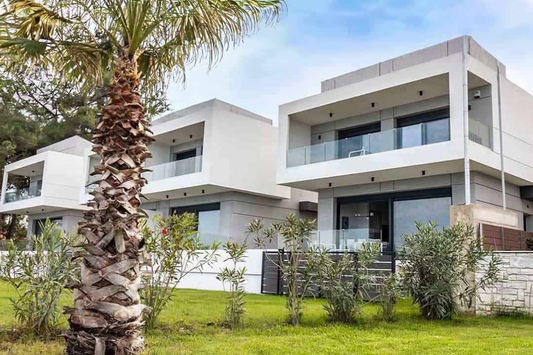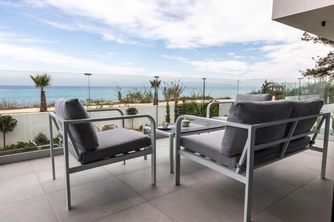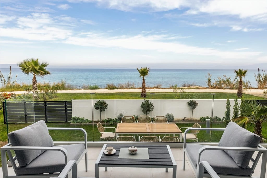 The luxurious beachfront villa Mario with 4 bedrooms and a beautiful view of the Aegean Sea, just 10 meters from the beach on the Kassandra Peninsula, Halkidiki, is available for rent.
