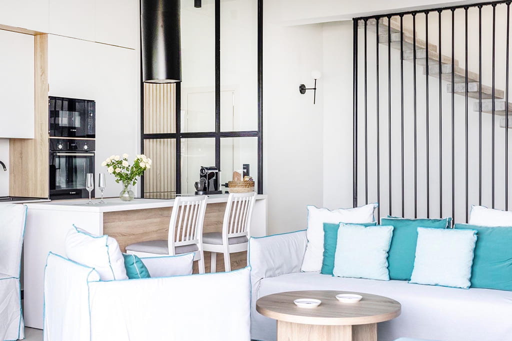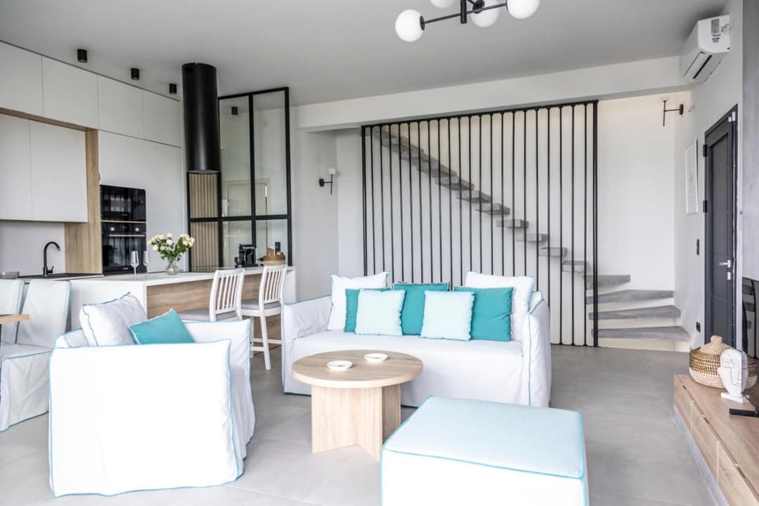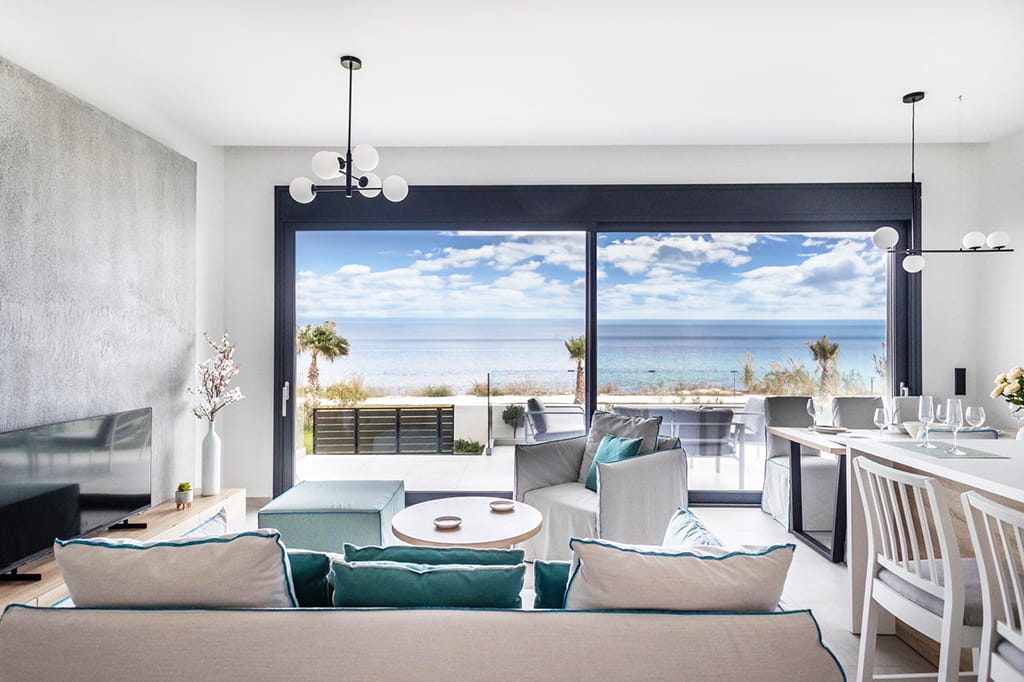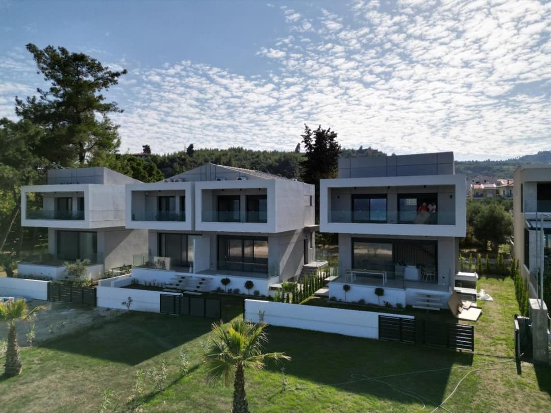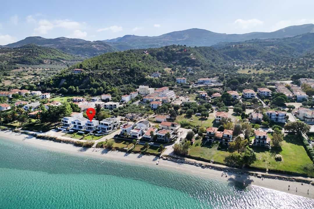 The luxurious beachfront villa Mario with 4 bedrooms and a beautiful view of the Aegean Sea, just 10 meters from the beach on the Kassandra Peninsula, Halkidiki, is available for rent.