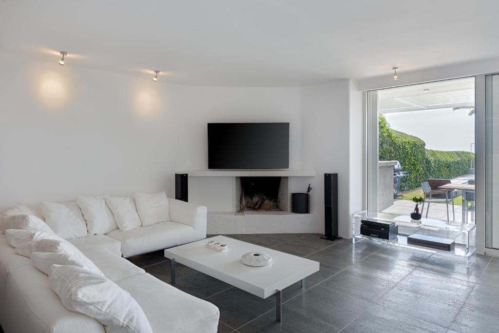- Large living-dining room with fireplace, floor-to-ceiling sliding doors leading to the terrace, and pool