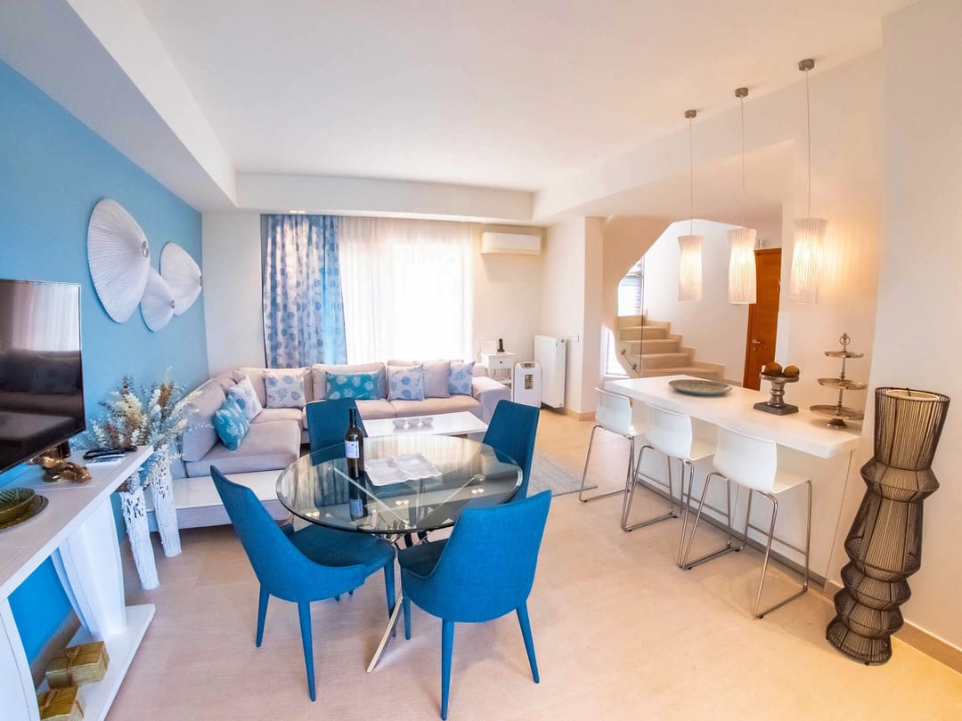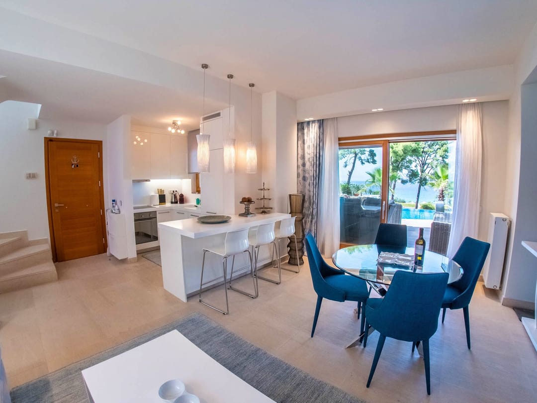 Beautiful stylish Merlin Villa with 4 bedrooms and a private pool, in Sani resort, on the Kassandra peninsula, Halkidiki for rent.