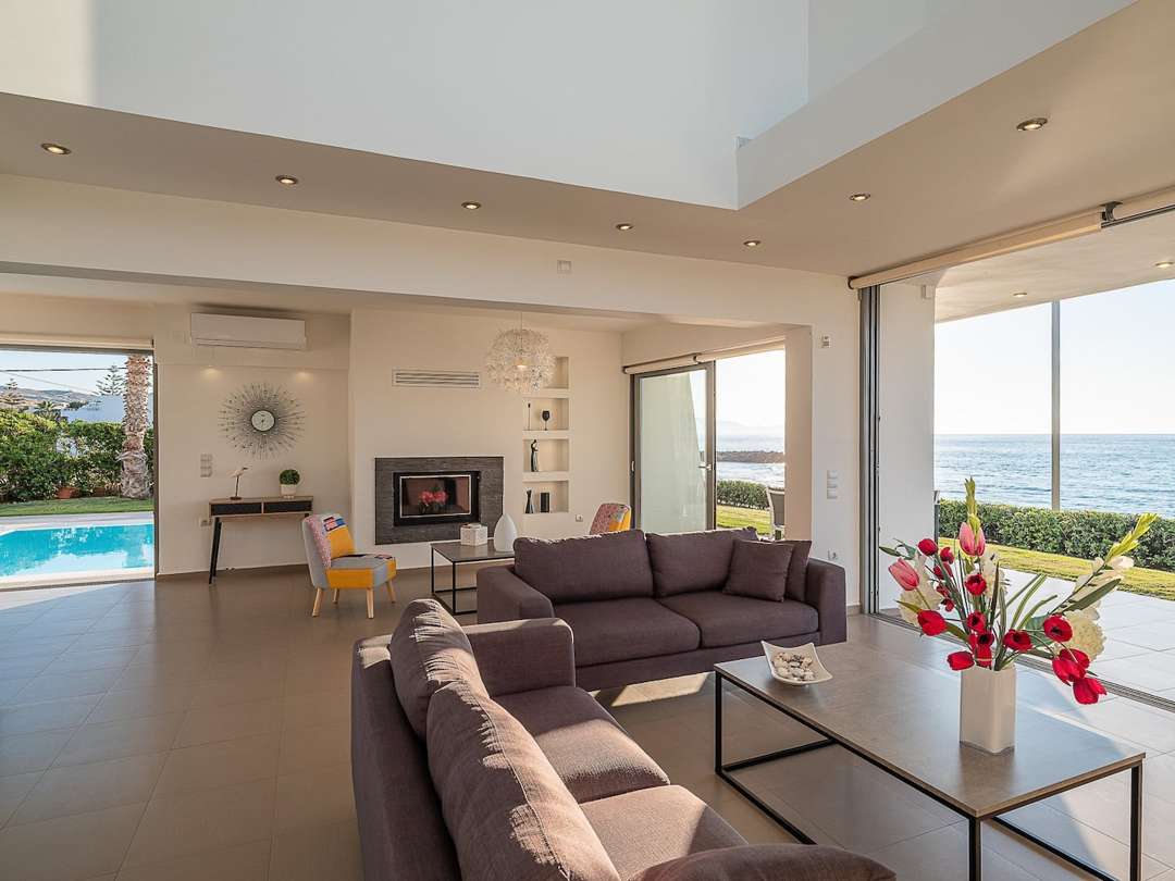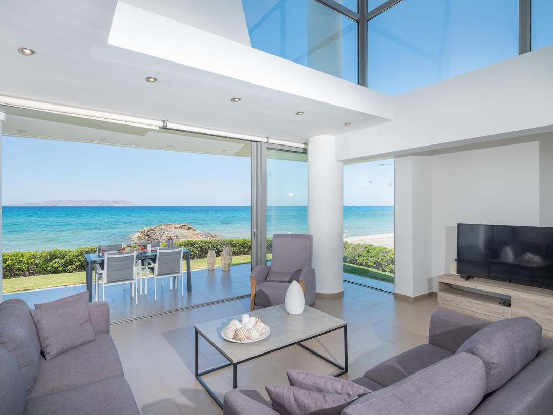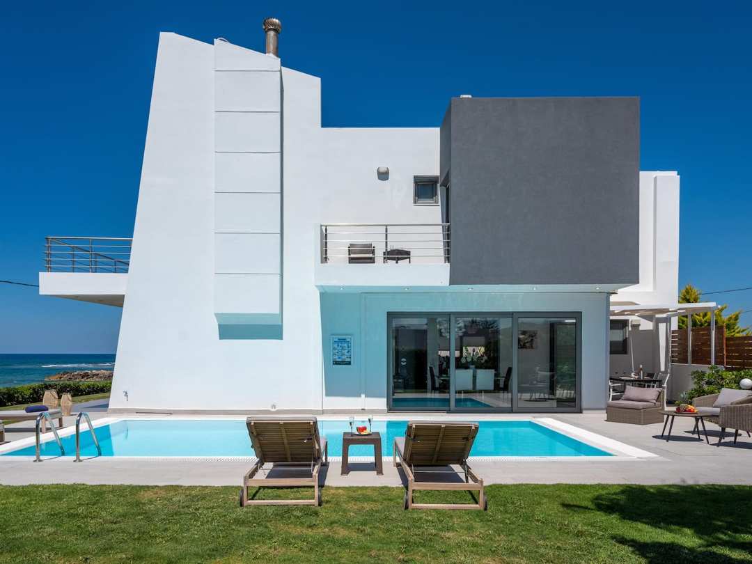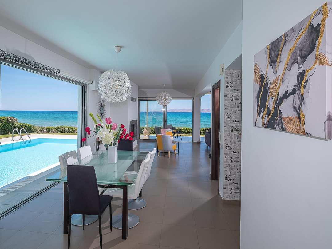 Beautiful Seafront Villa Mira villa with 3 bedrooms and a private pool, in the resort village of Gournes, on Crete Island, for rent.