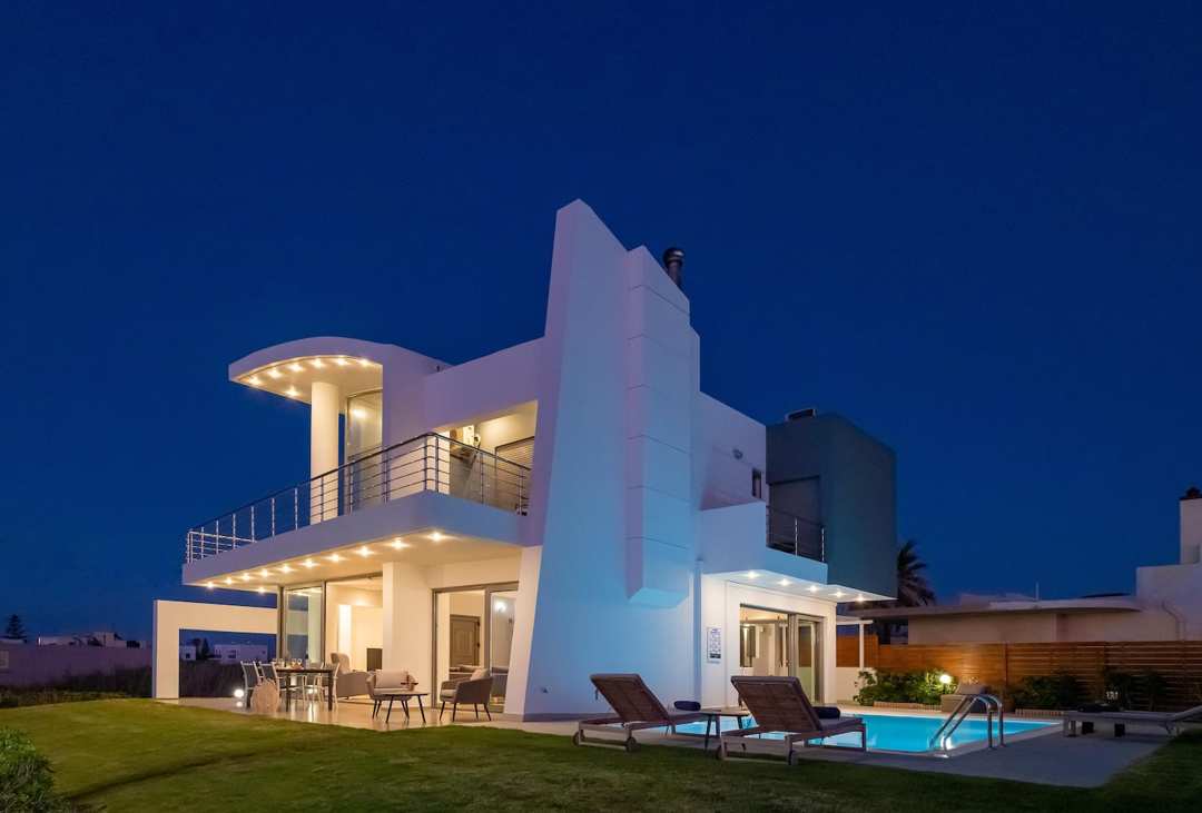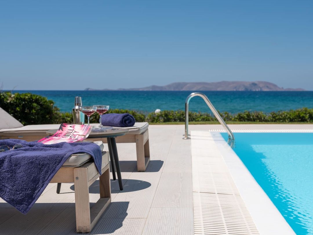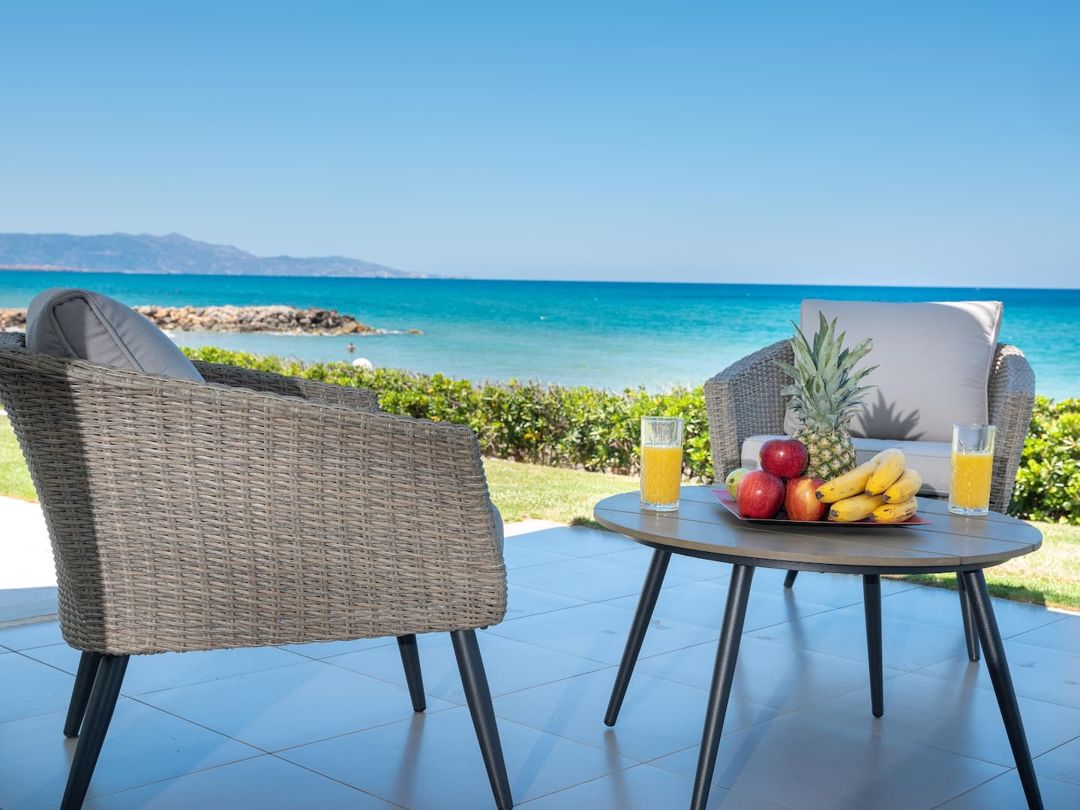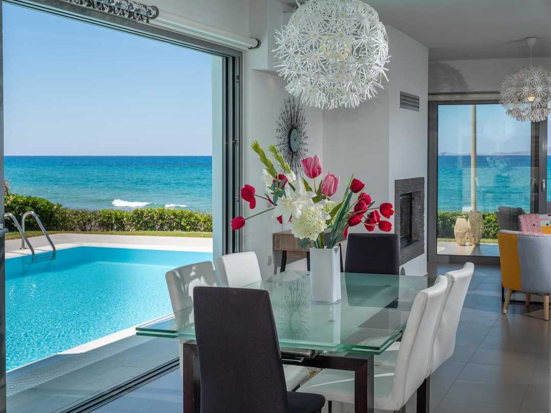 Beautiful Seafront Villa Mira villa with 3 bedrooms and a private pool, in the resort village of Gournes, on Crete Island, for rent.