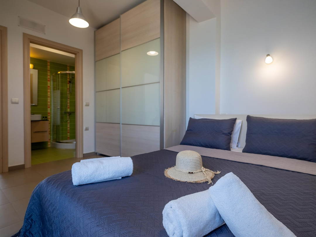- Bedroom 2: Double bed, en-suite bathroom with shower, private balcony with sea view