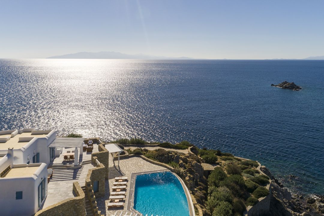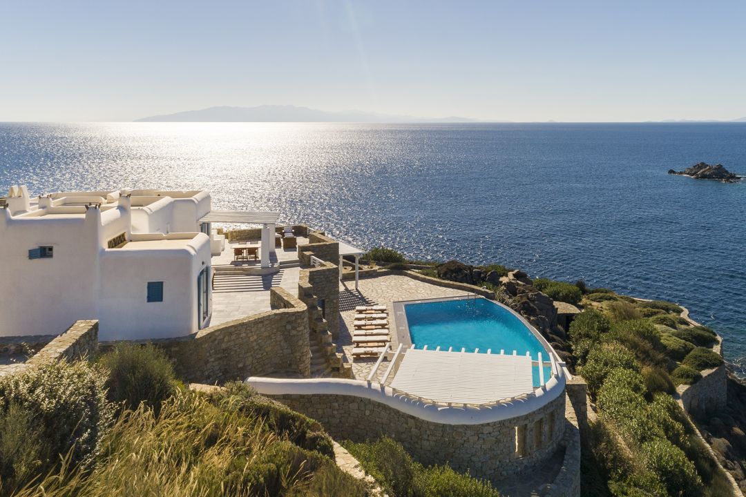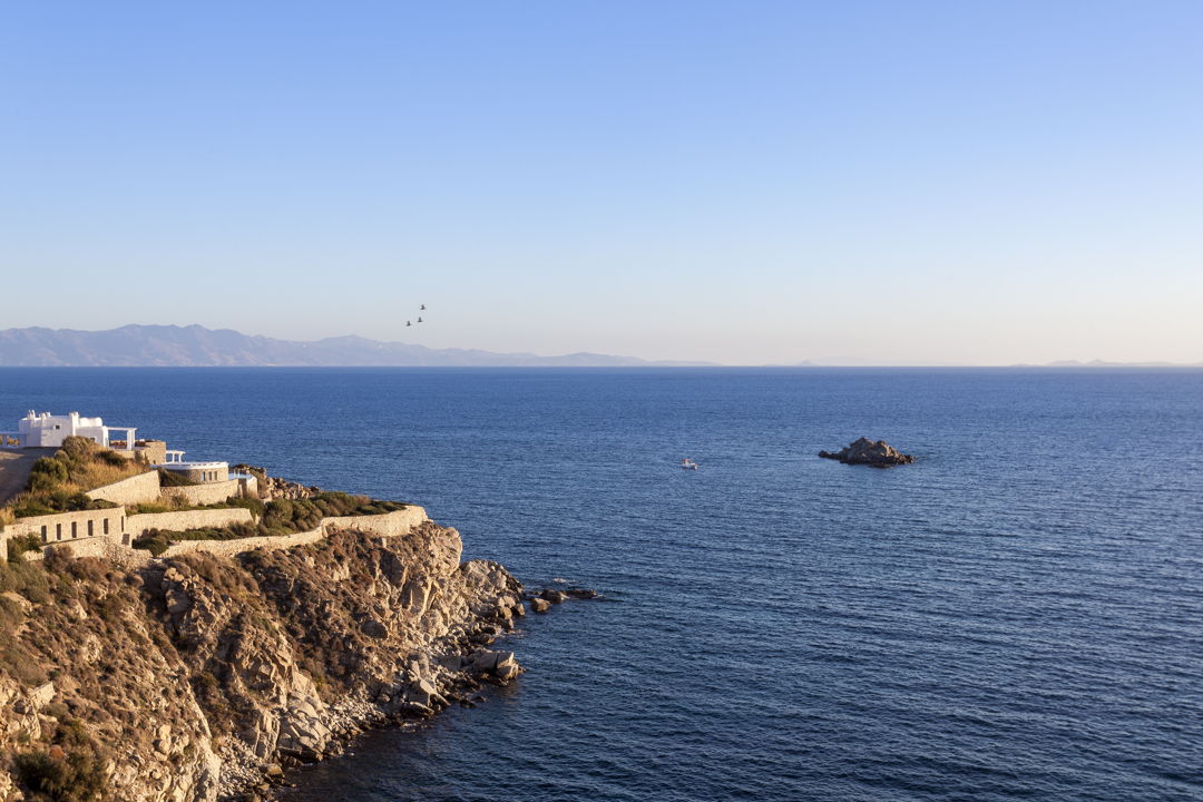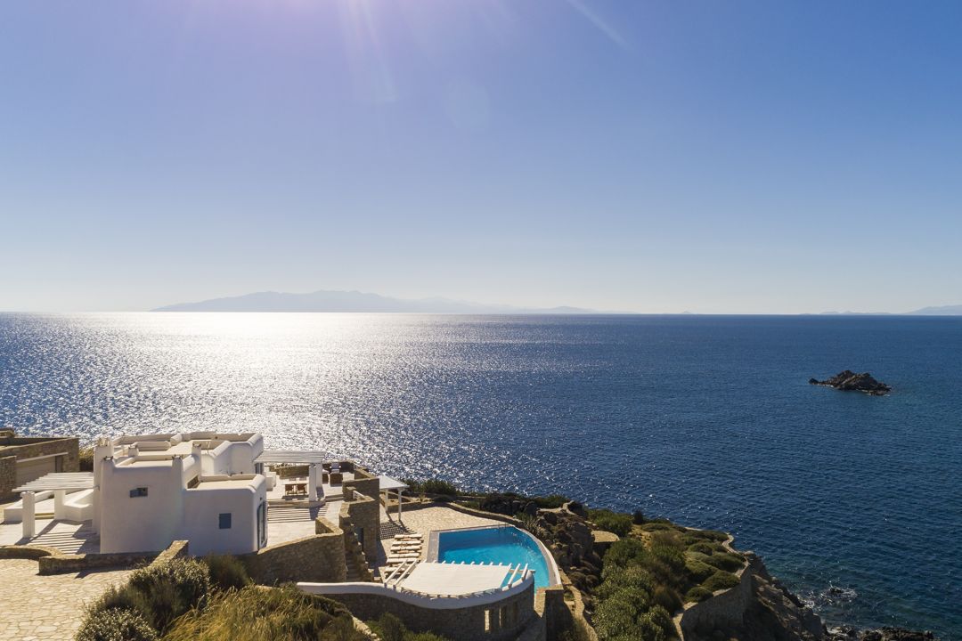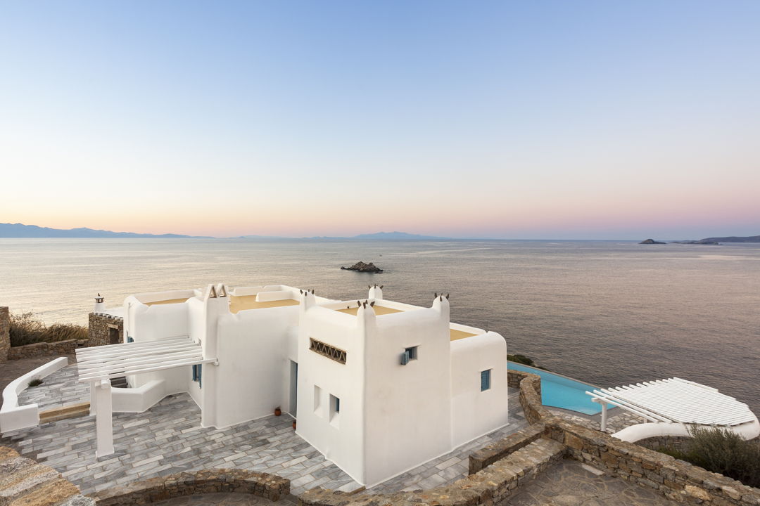 The brilliant white interiors and exteriors and the subtle tasteful ethnic decorations reflect and contrast the Mykonian-elegance the island is known for, so you can totally immerse yourself in the spirit of the island. The villa is perched at the edge of the private estate of 10 villas and enjoys an uninterrupted view of Delos and Rhenea islands over a majestic drop to the sea, offering the picture-perfect Mykonos sunset.