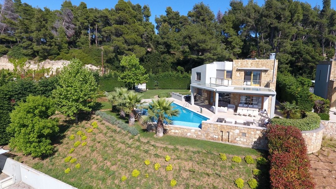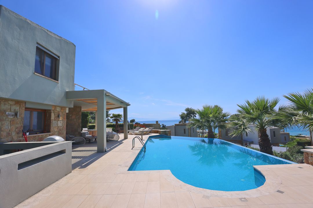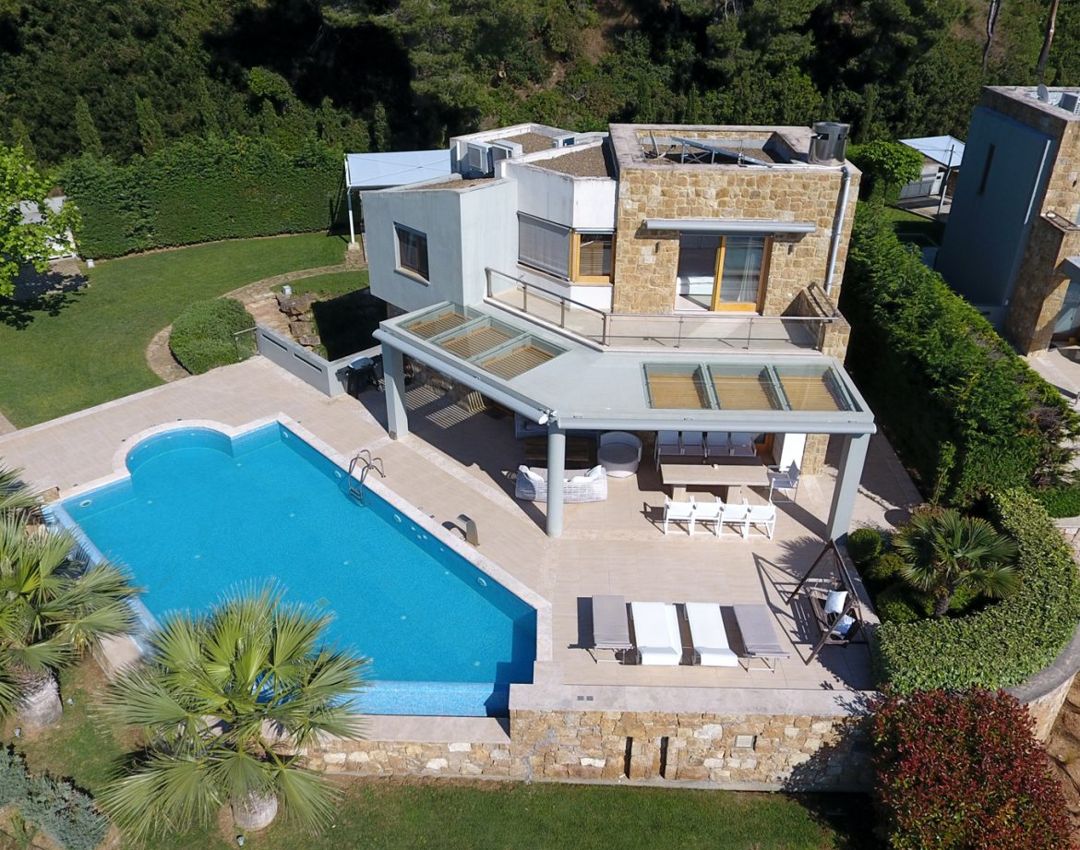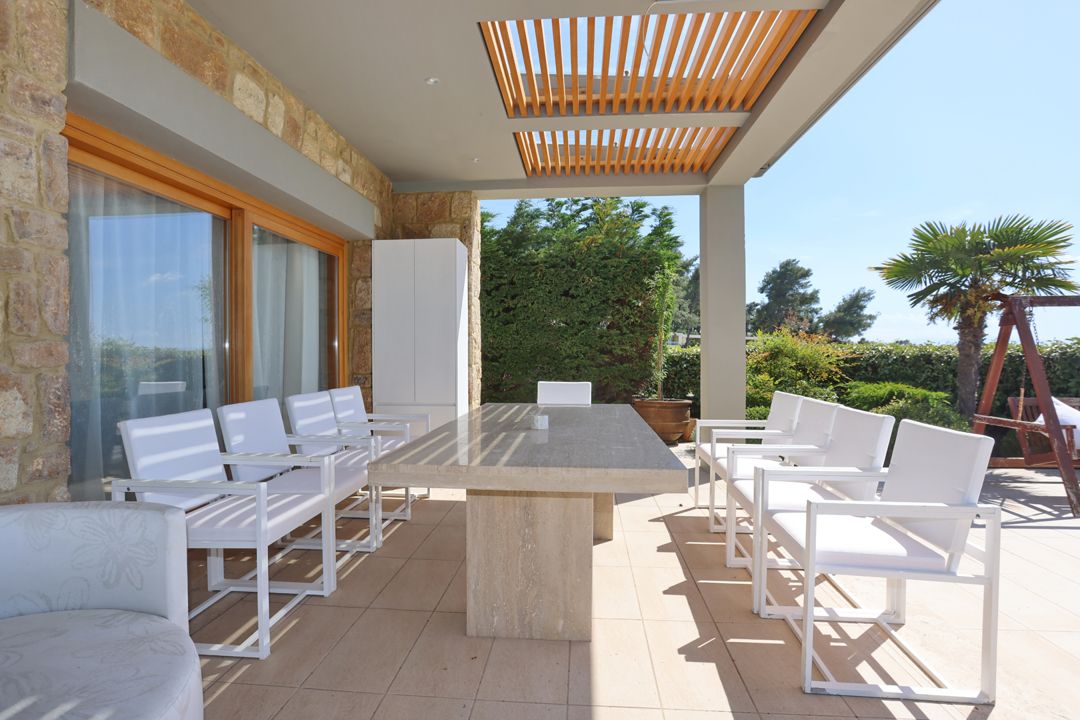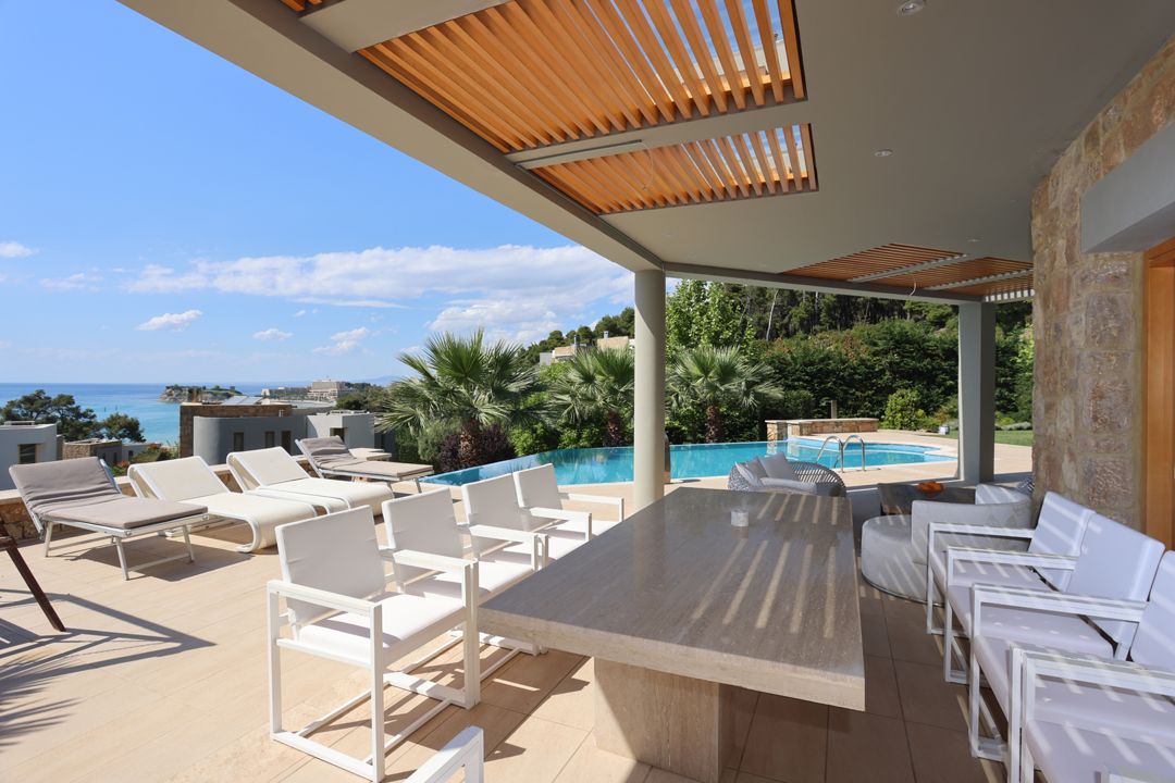 An elegant, luxurious Villa Nova with 5 bedrooms, a private pool, and magnificent panoramic sea views in the exclusive resort of Sani on the peninsula of Kassandra, Halkidiki for rent.