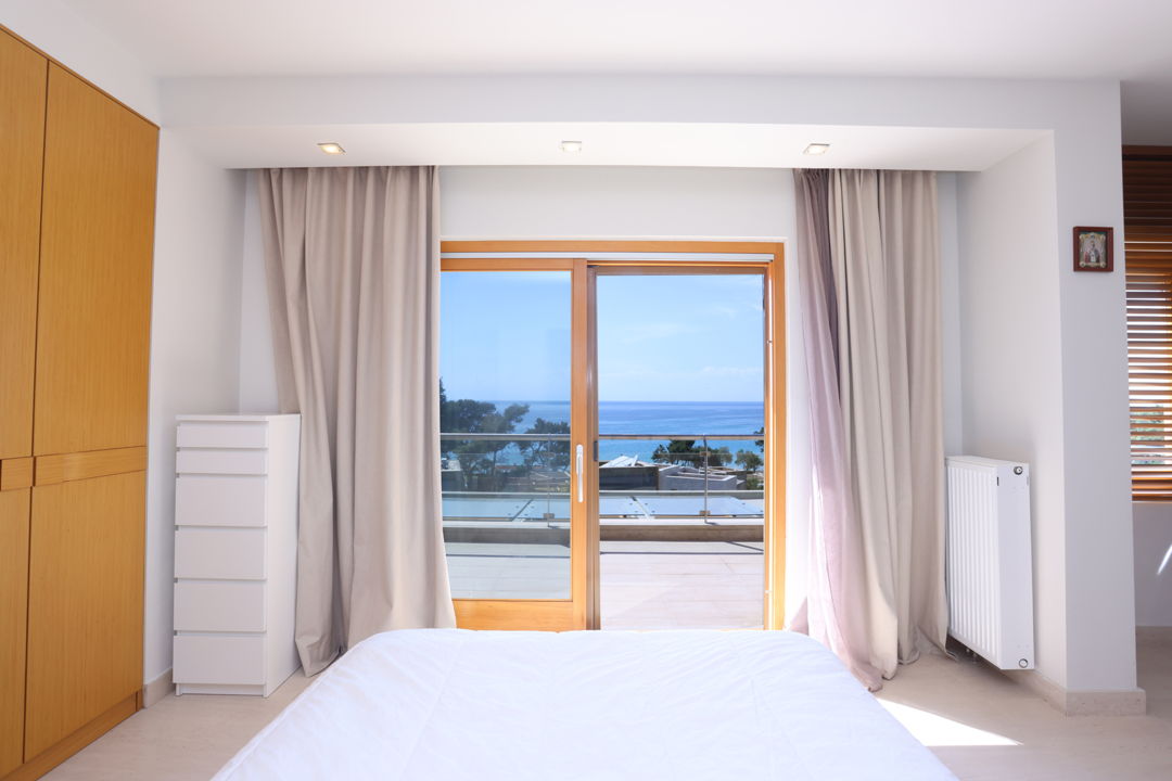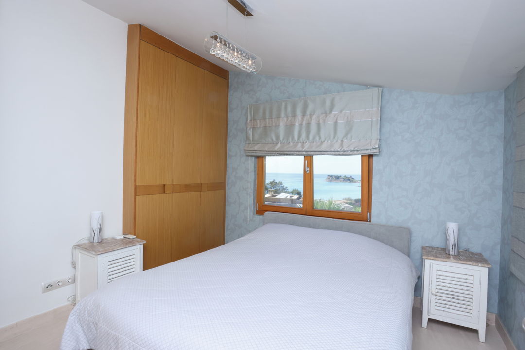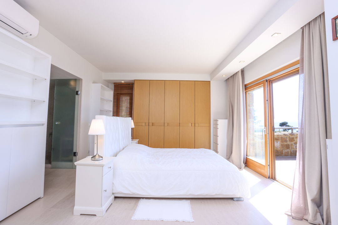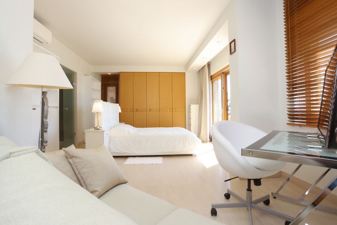 - 4th master bedroom with a double bed, private bathroom, furniture, TV, desk, and balcony with sea view
