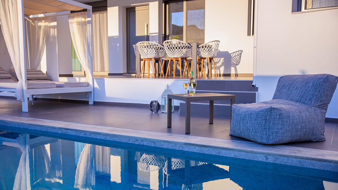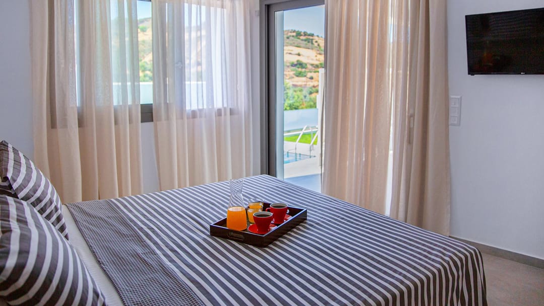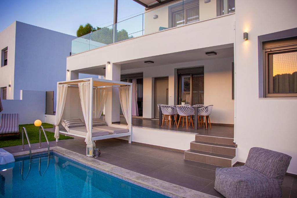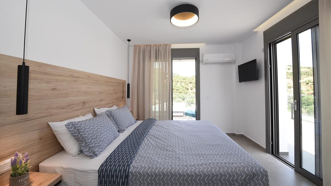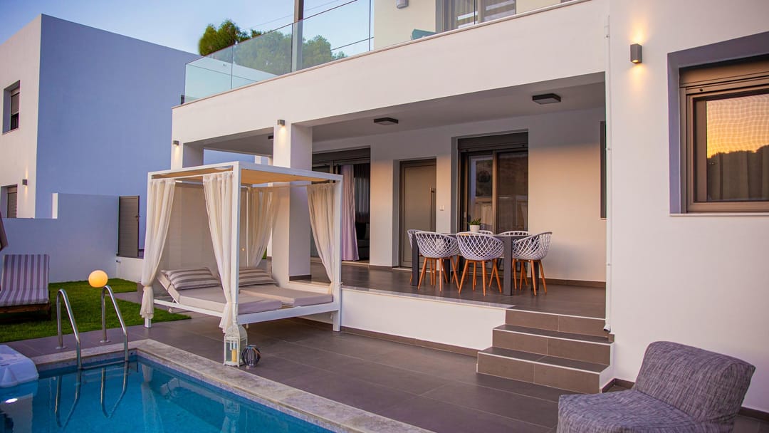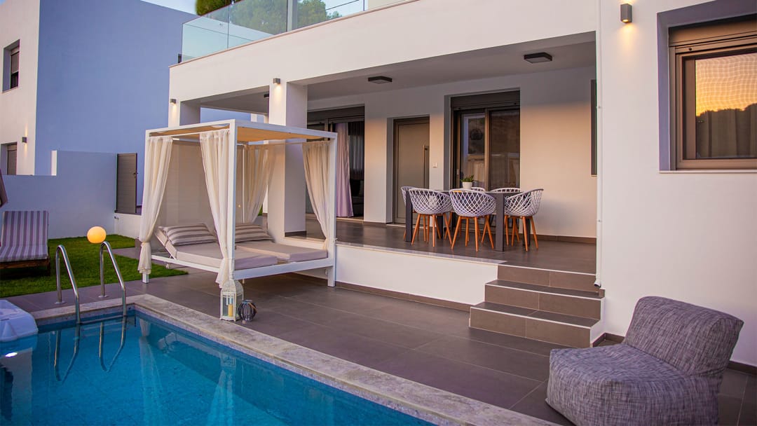 New stylish villa Odri with 3 bedrooms and a private pool just 300 meters from the beach in the resort village of Bali, near the city of Rethymno, on the island of Crete, for rent.