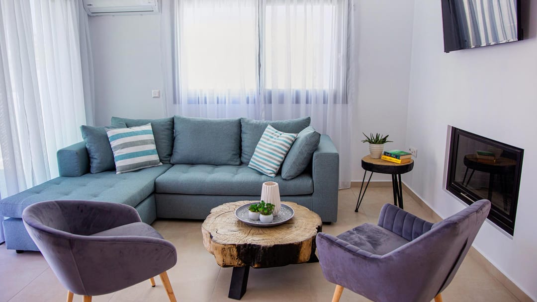 - Elegant living room with comfortable furniture, 42″ LCD smart TV with satellite channels, fireplace, air conditioning, Wi-Fi internet