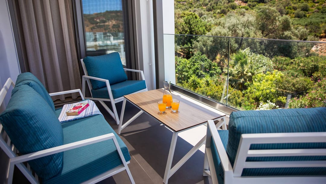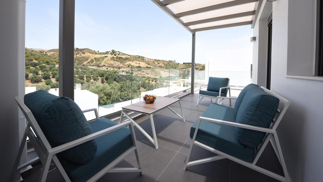- Spacious balcony overlooking the green garden, olive groves, and surrounding mountains.
