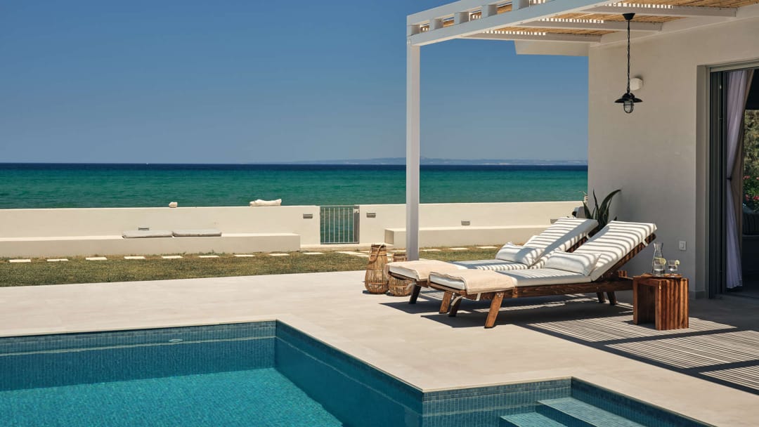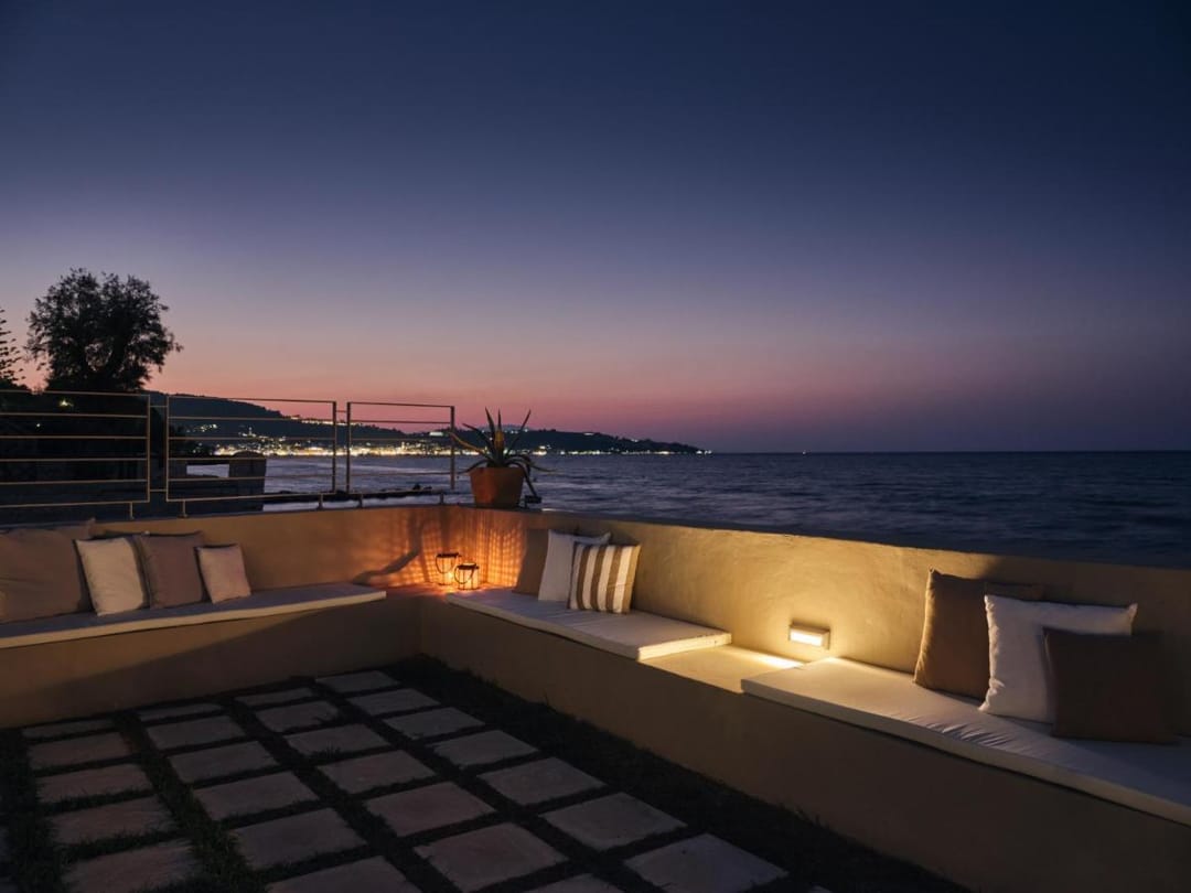 Amazing beachfront villa Okra with 3 bedrooms and a private swimming pool, located literally on the sea edge, in the popular resort of Argassi, Zakynthos Island, for rent.