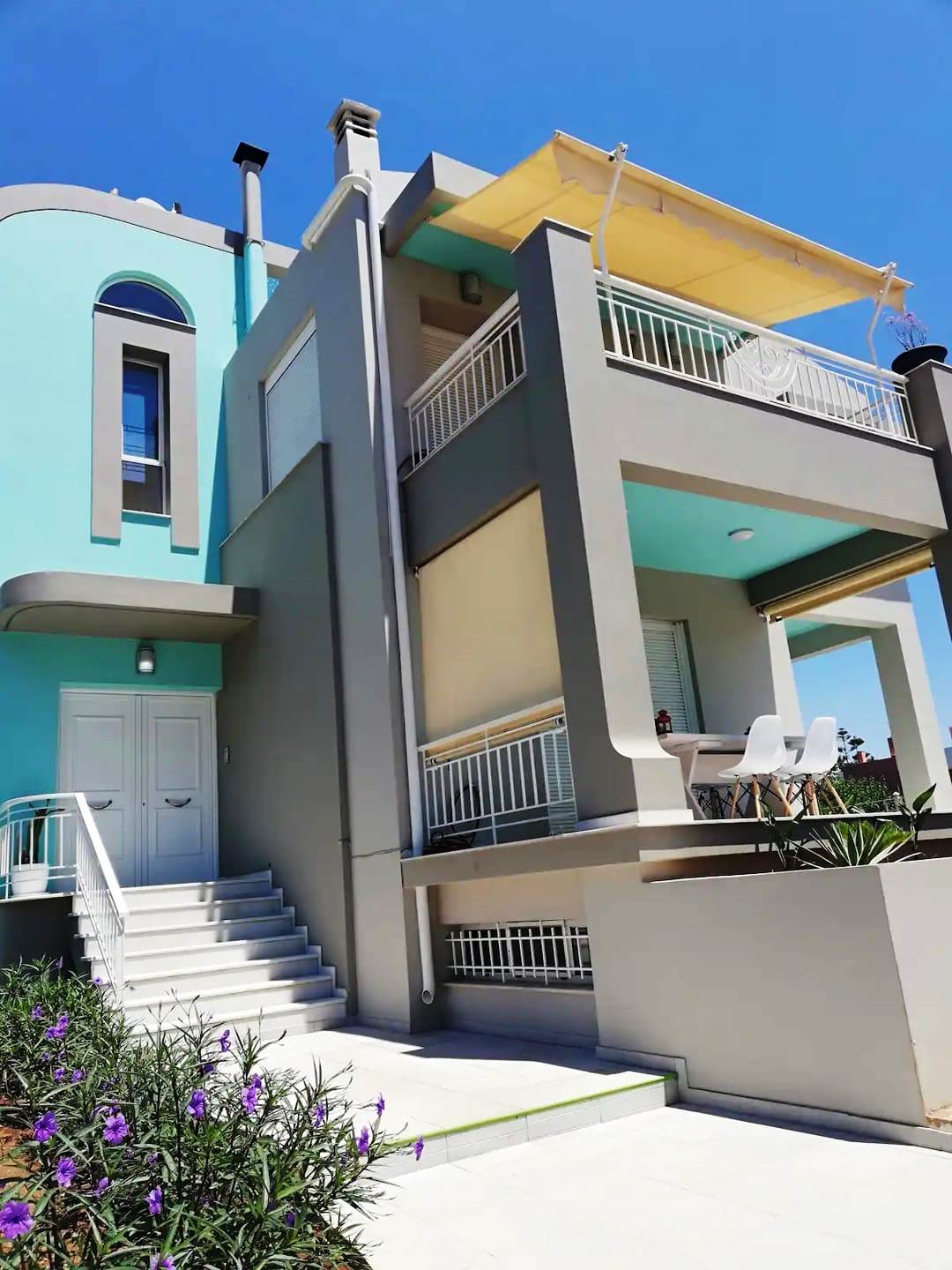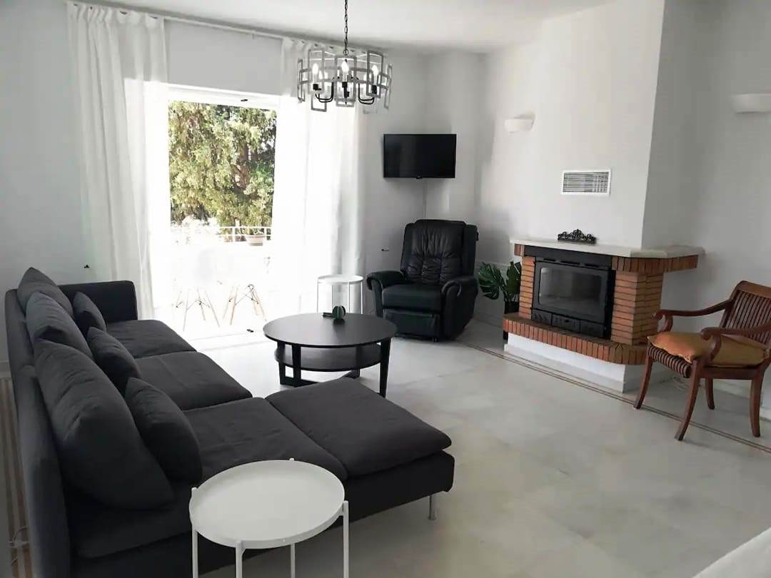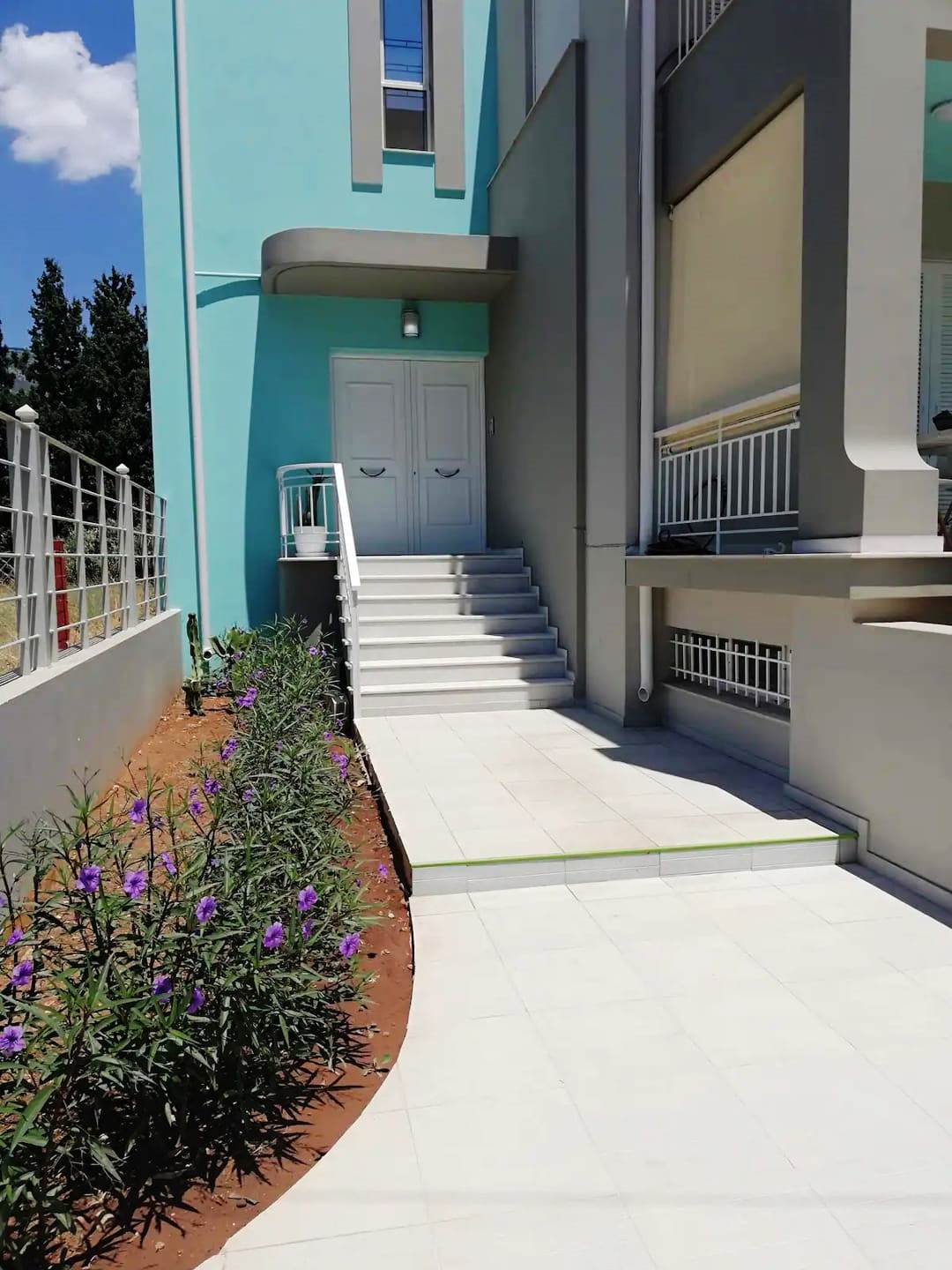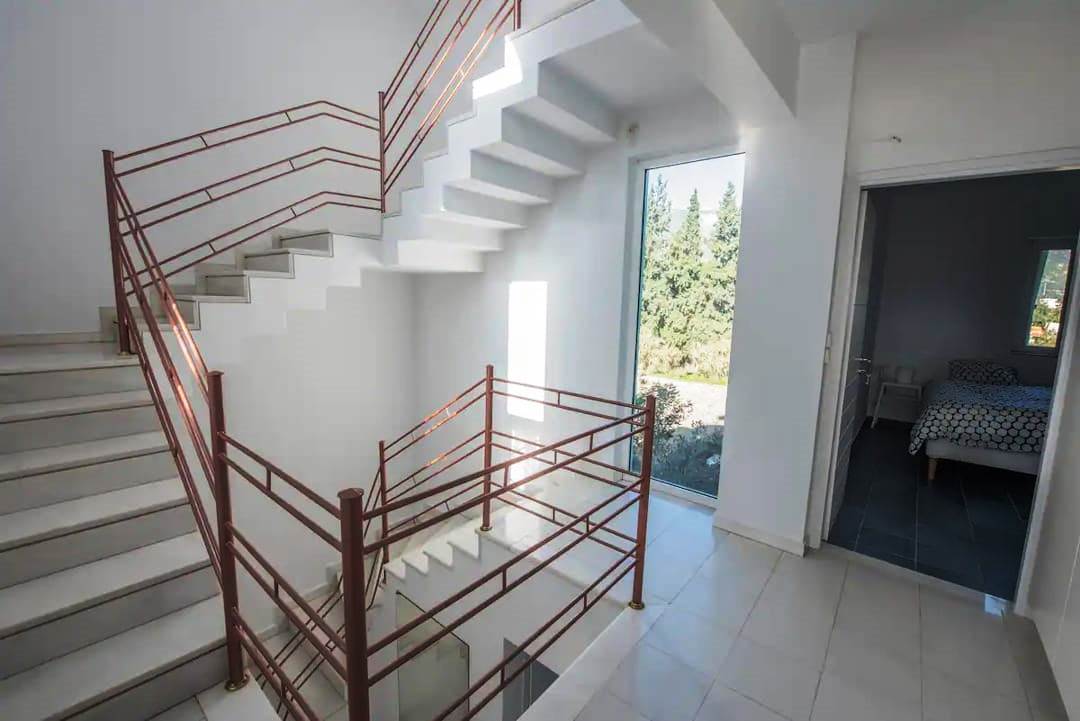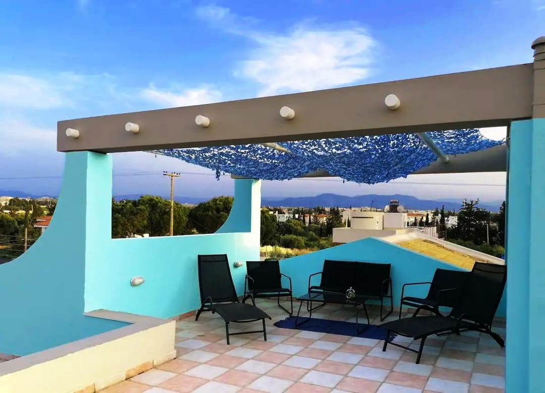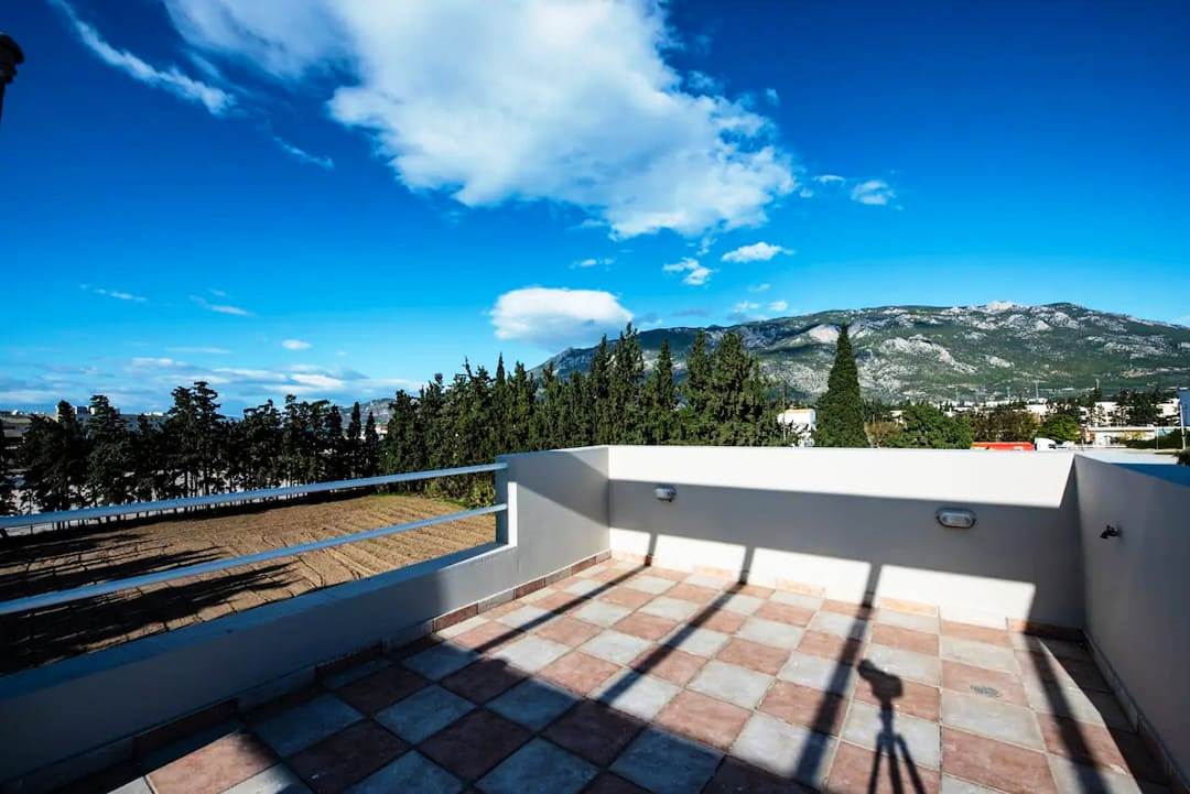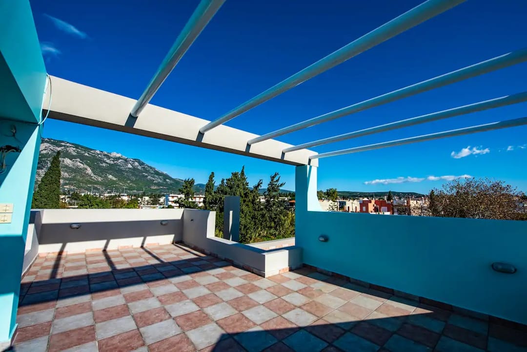 Two large furnished terraces and the rooftop terrace offer a personal space for relaxation with a view, eating, barbeque, or even sunbathing, with the background of the beautiful gardens and stunning views of Gerania mountains. The house was built with a lot of love, in a minimal, luxurious, and modern style, with colorful “touches” that complement its large, bright spaces.