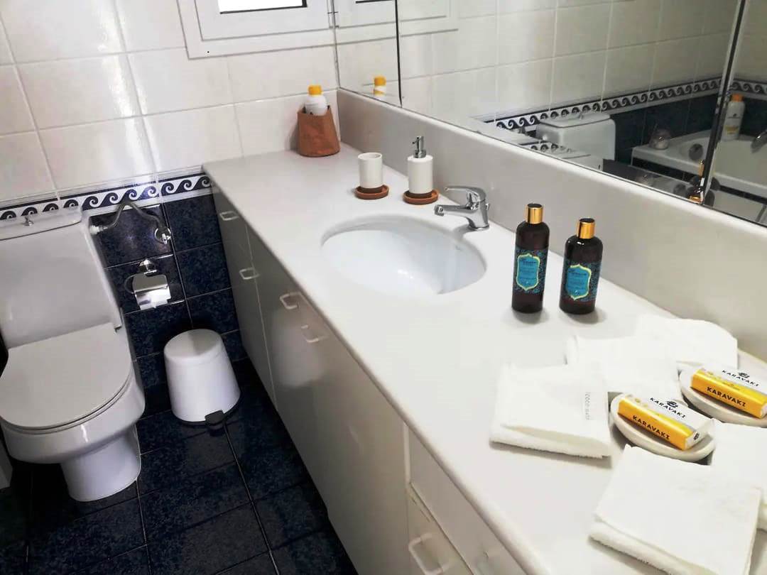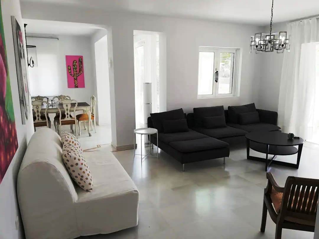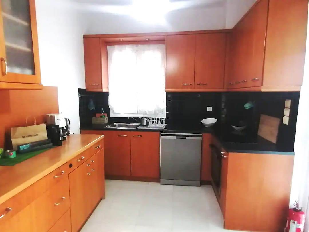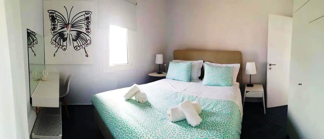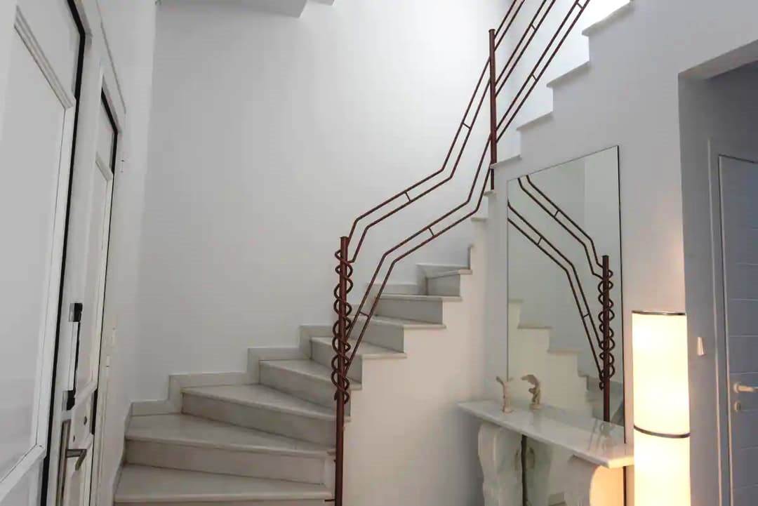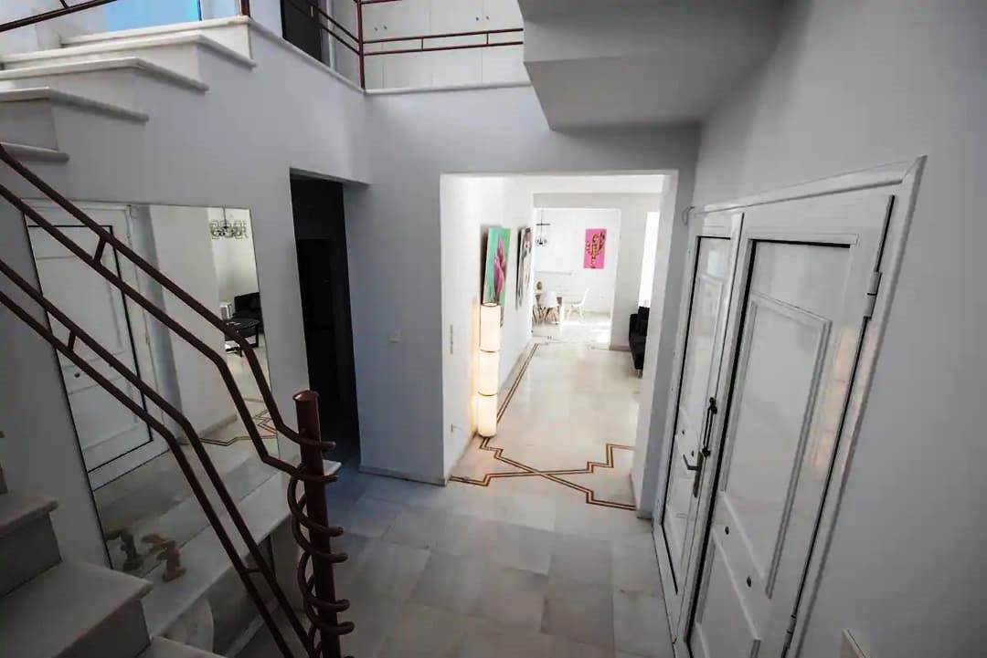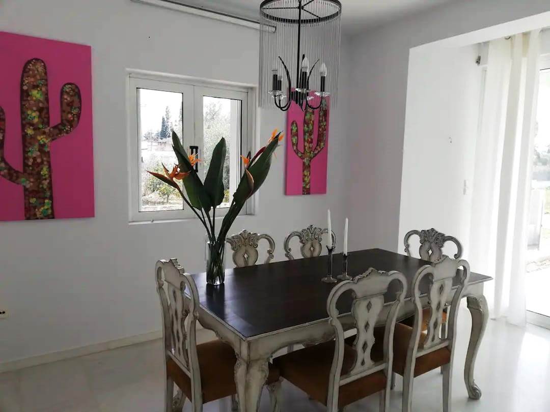 Two large furnished terraces and the rooftop terrace offer a personal space for relaxation with a view, eating, barbeque, or even sunbathing, with the background of the beautiful gardens and stunning views of Gerania mountains. The house was built with a lot of love, in a minimal, luxurious, and modern style, with colorful “touches” that complement its large, bright spaces.