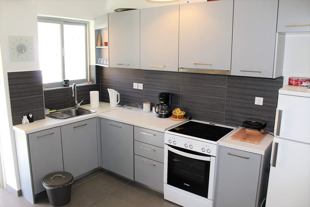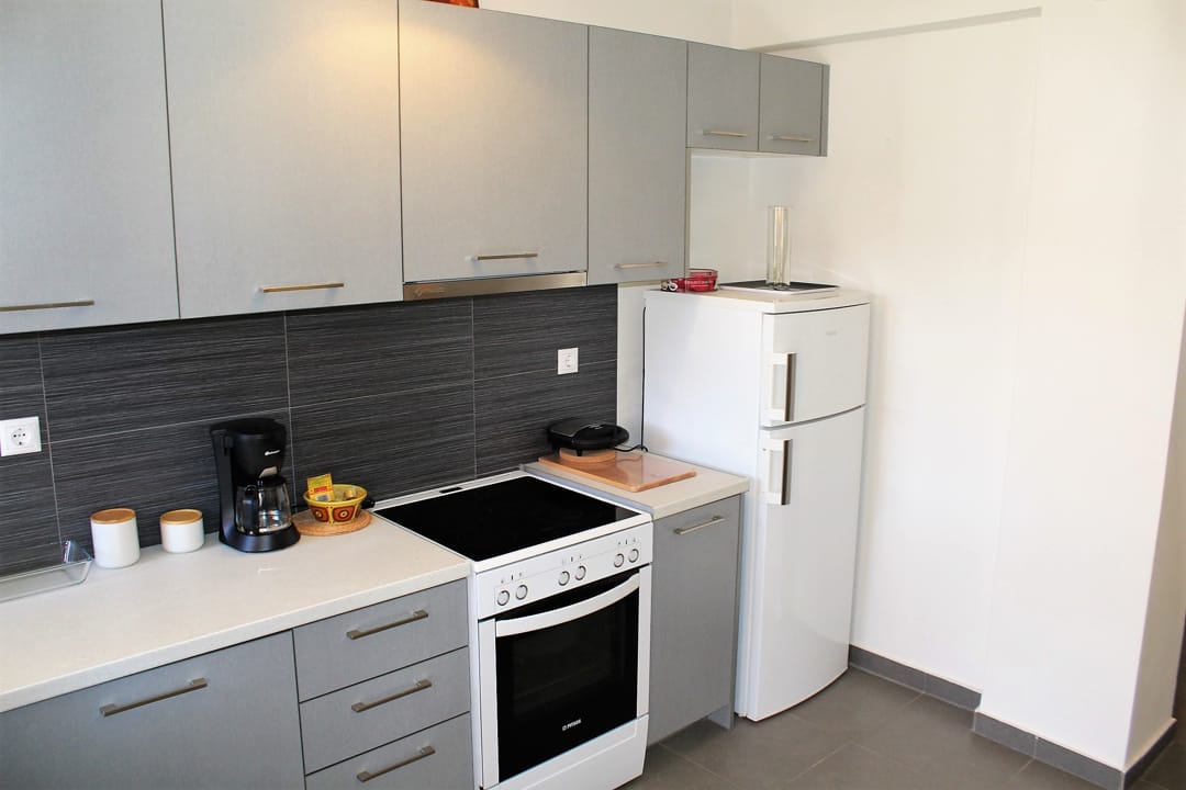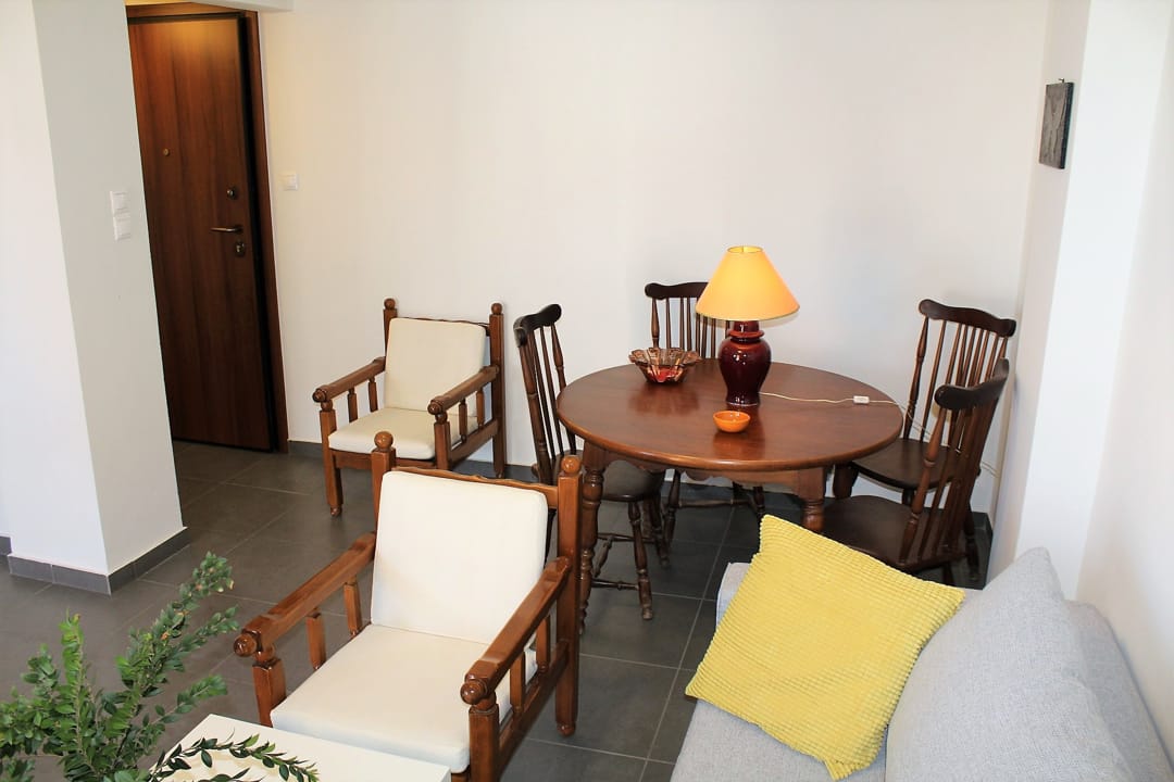 The apartment is located on the second floor of a seafront residential complex with a large garden, next to the well-developed tourist infrastructure, and 30 meters from the beach of Agia Marina. A beach bar with a swimming pool is 300 meters from the apartment.