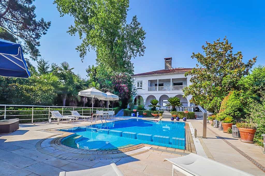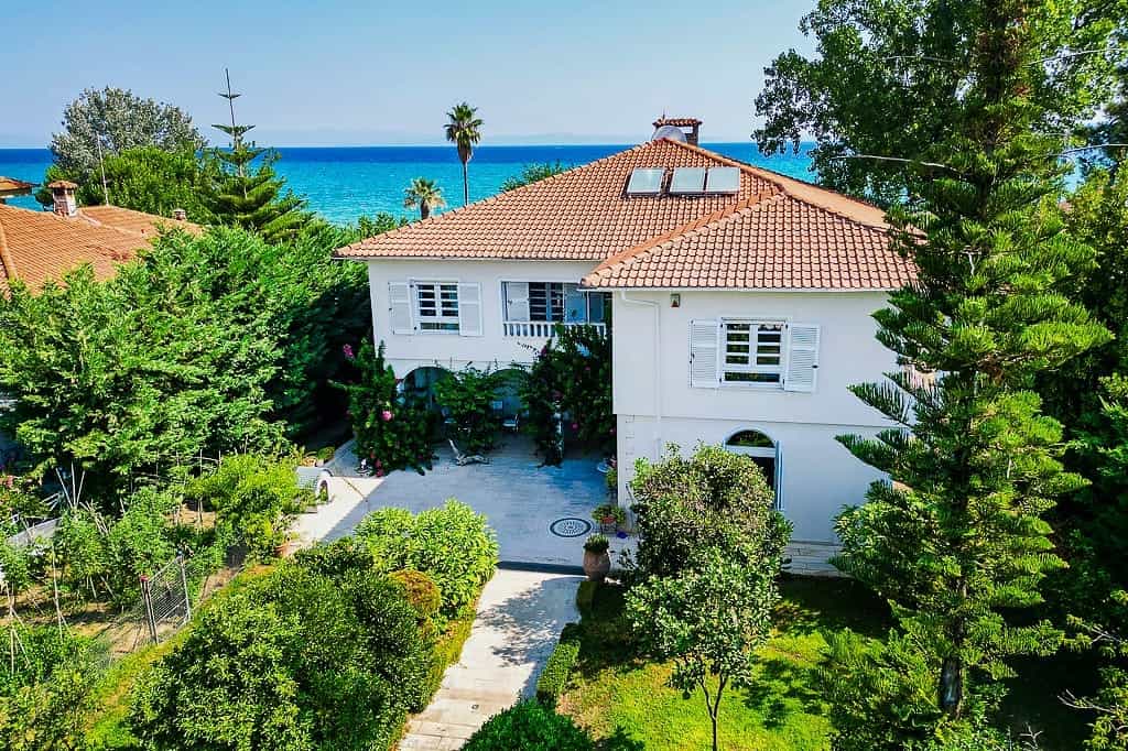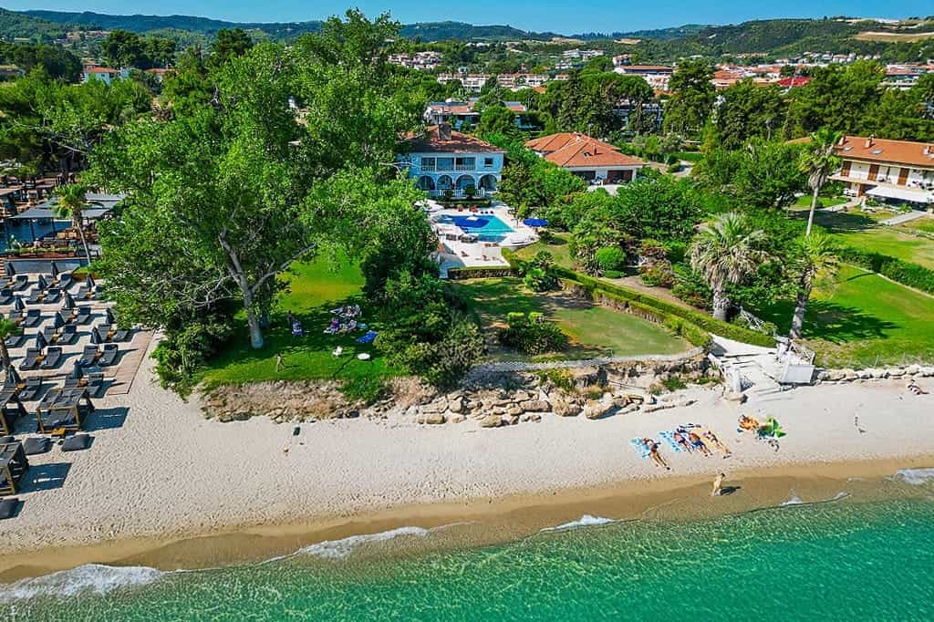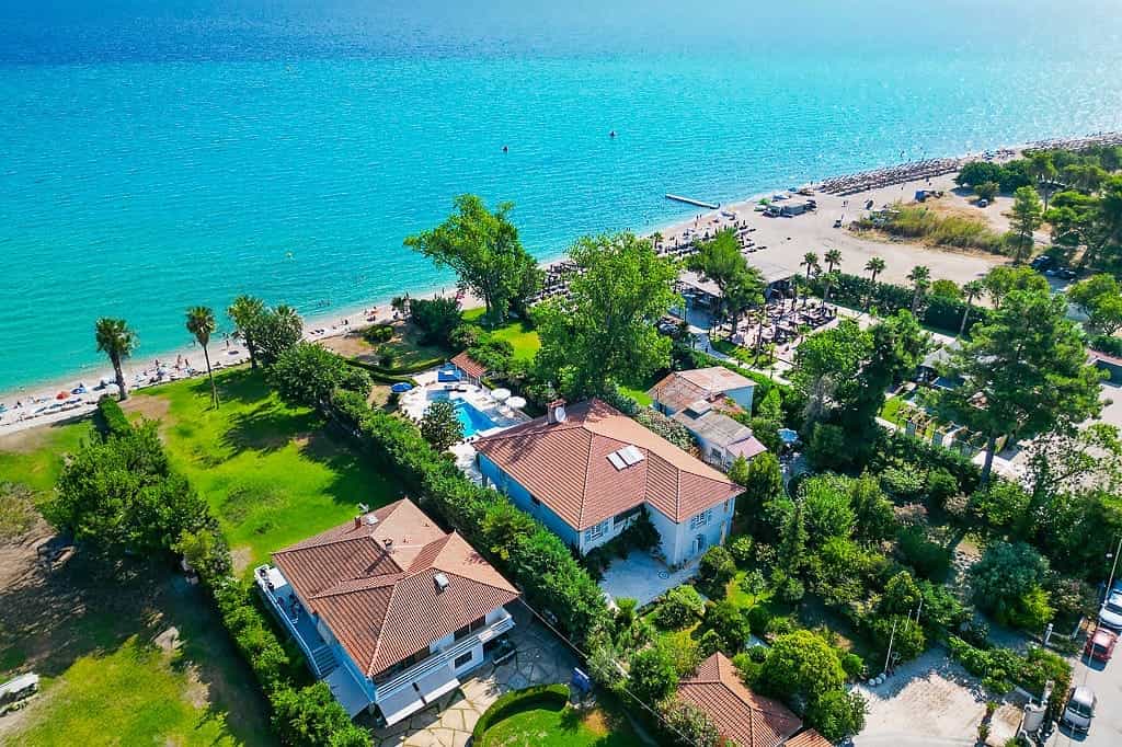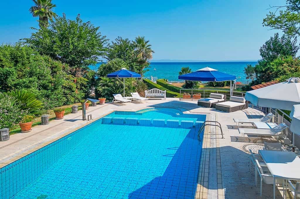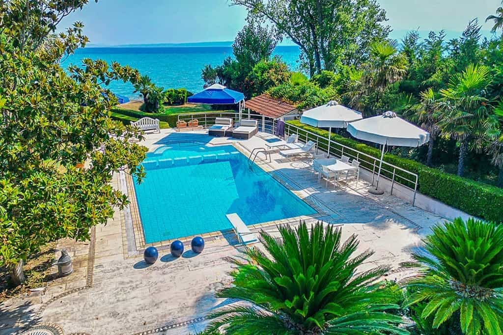 Luxury beachfront villa “Regina” with 5 bedrooms, a private pool, and a spacious garden is located in front of the sea, within walking distance of the center of the popular resort Hanioti, on the Kassandra Peninsula, Halkidiki and is available for rent.