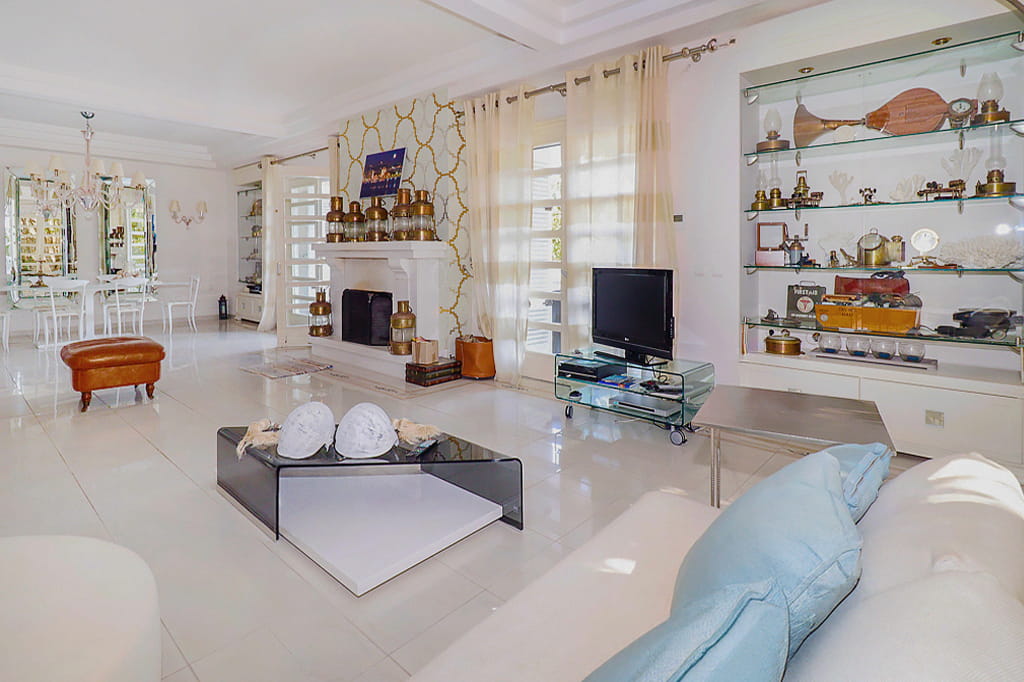 - Second living room with sofas, fireplace, and TV