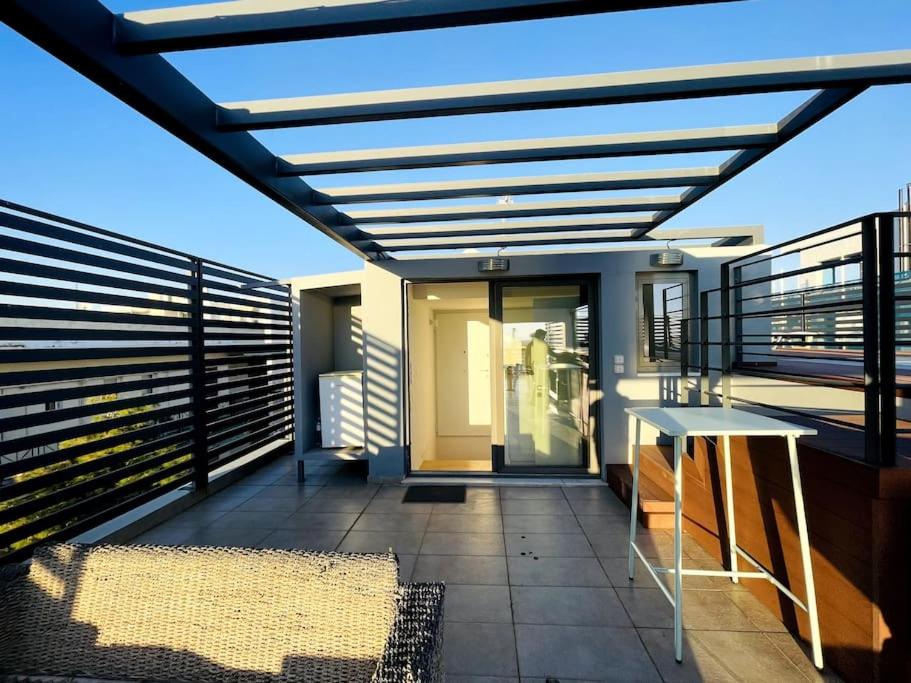 The outdoor rooftop terrace includes a private pool (3 x 10 meters) with sun loungers, a lounge area, a dining space, and a barbecue. The terrace offers stunning views of the sea and garden, making it the perfect spot to unwind and enjoy breathtaking sunsets.
