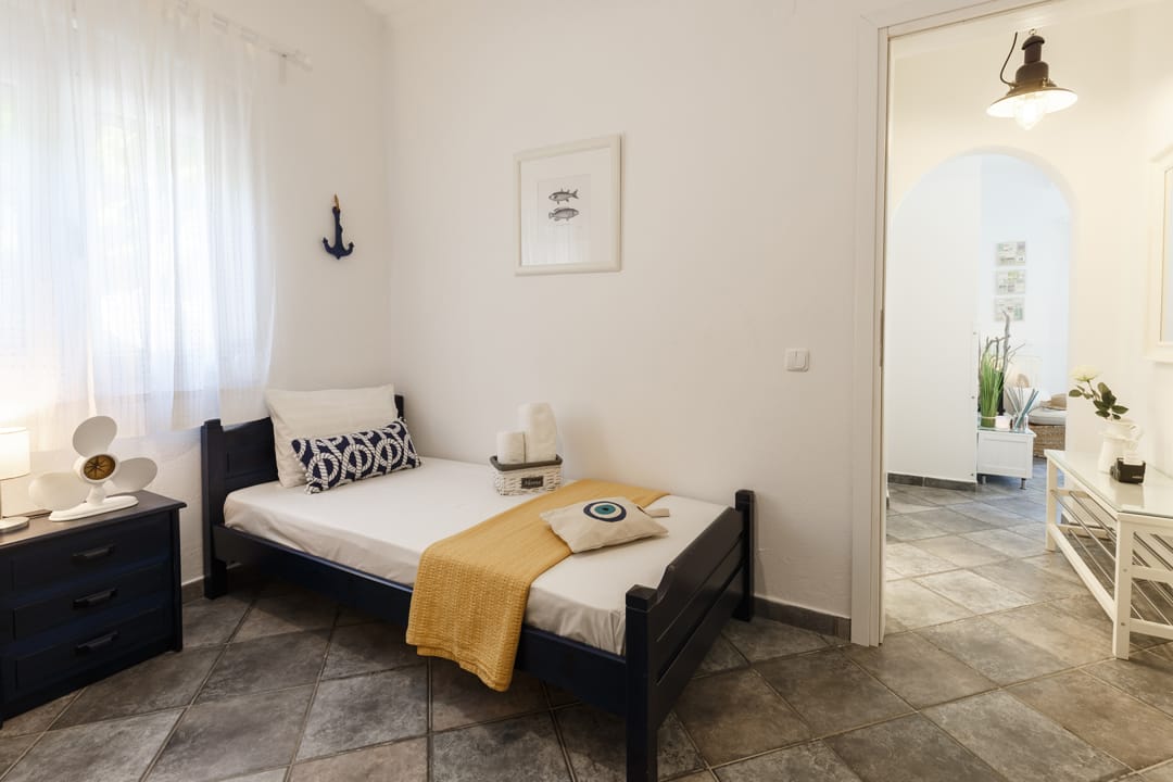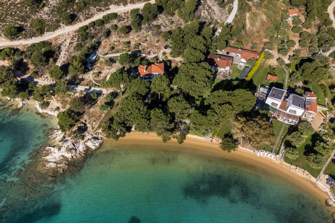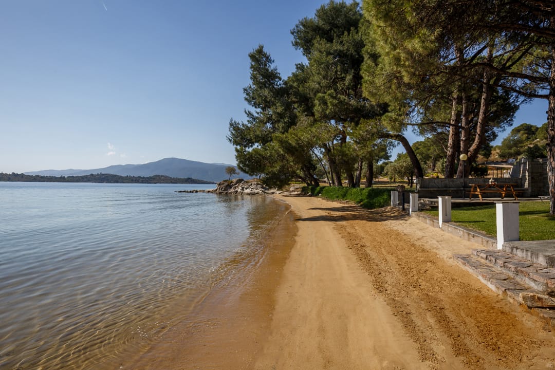 The house is surrounded by pines and olive trees, opposite the island of Diaporos. The place is conducive to a quiet relaxing holiday, away from the hustle and bustle of the big city. Literally, a stone’s throw away is a sandy beach, with a gentle entrance to the sea. There are wild bays nearby, where it is interesting to swim with a mask. By renting a car you can easily get to the most famous beaches and coves of Sithonia.