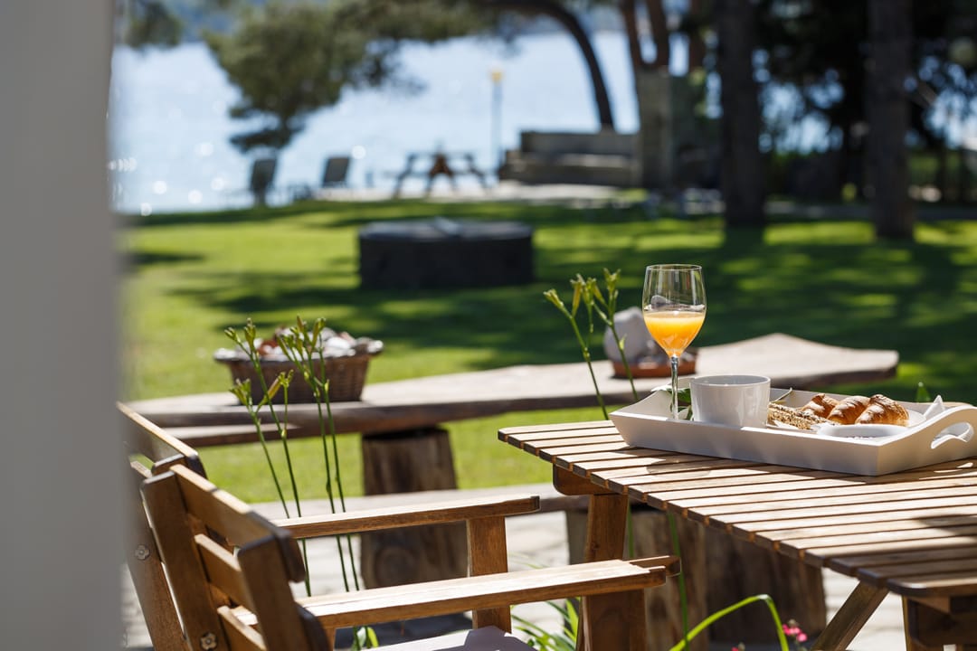- On the beach, there is a large wooden table and benches, an umbrella, and sun loungers