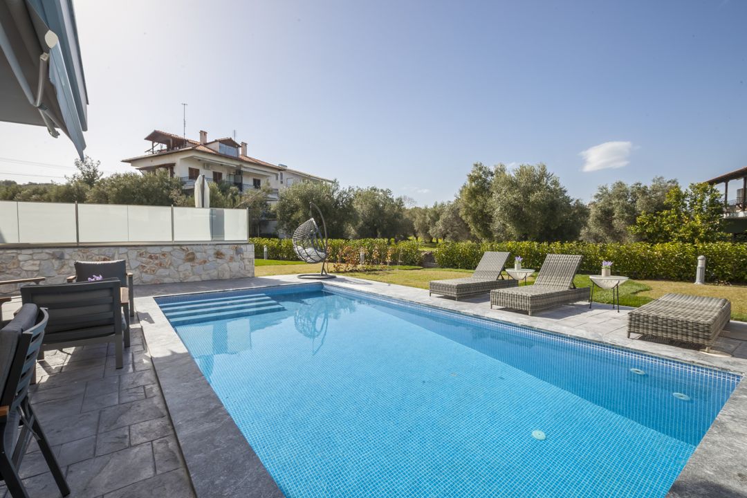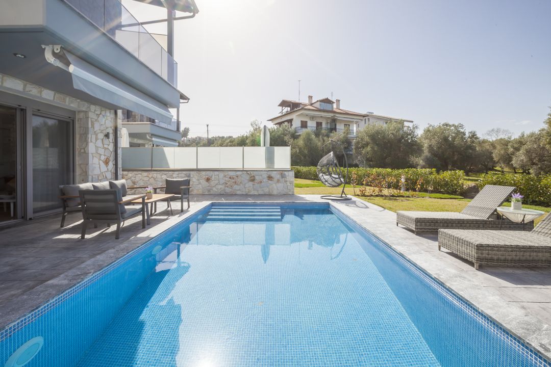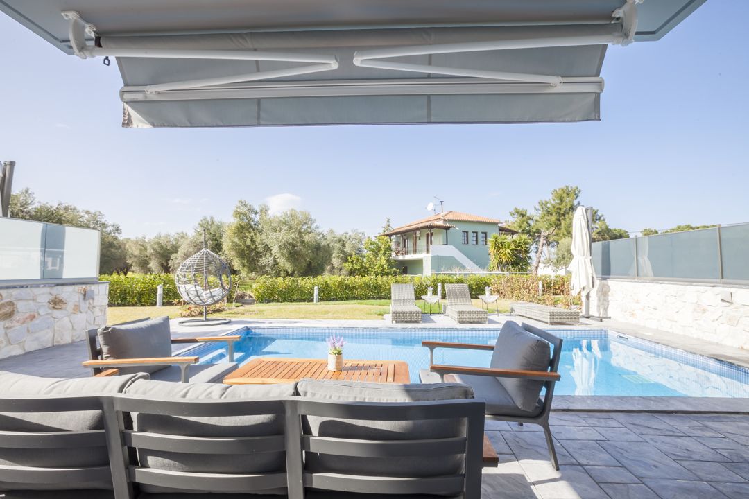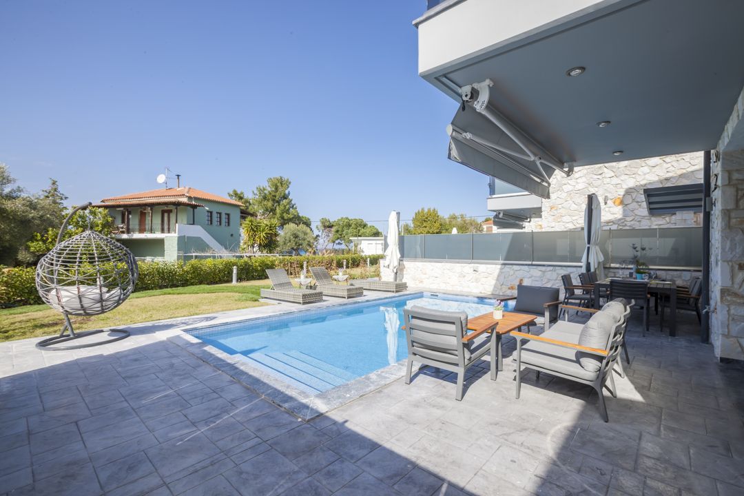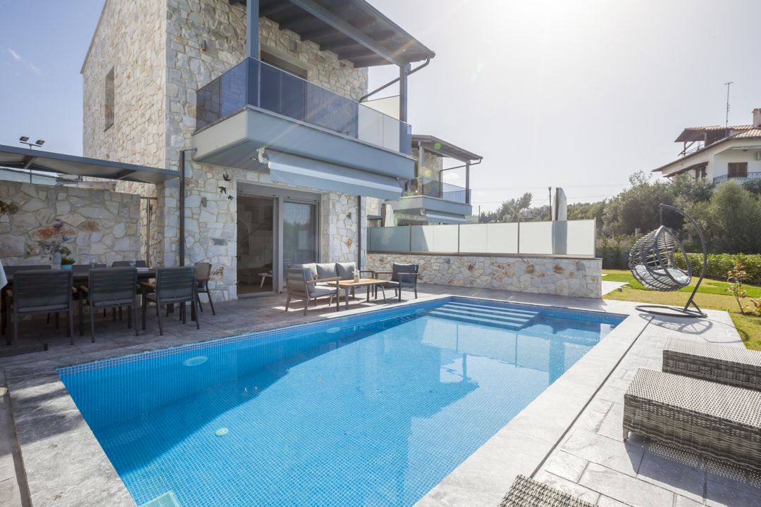 New luxury villa Ritria with 3 bedrooms and a private pool, 50 meters from the beach in the Hanioti area, on the Kassandra peninsula, Halkidiki, for rent.