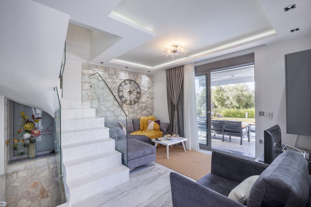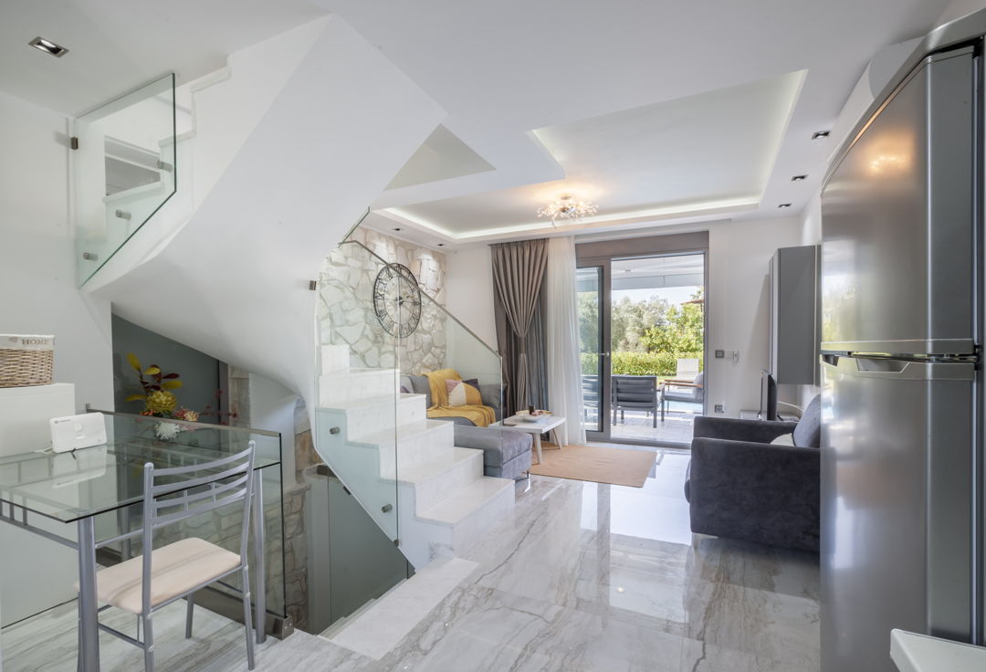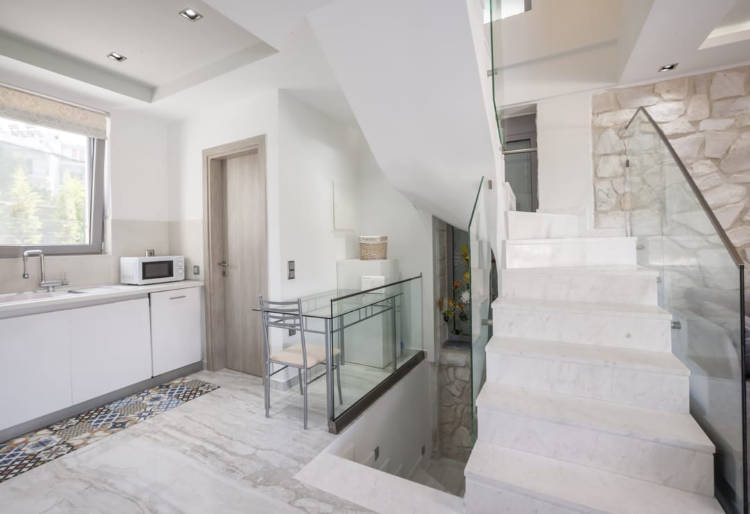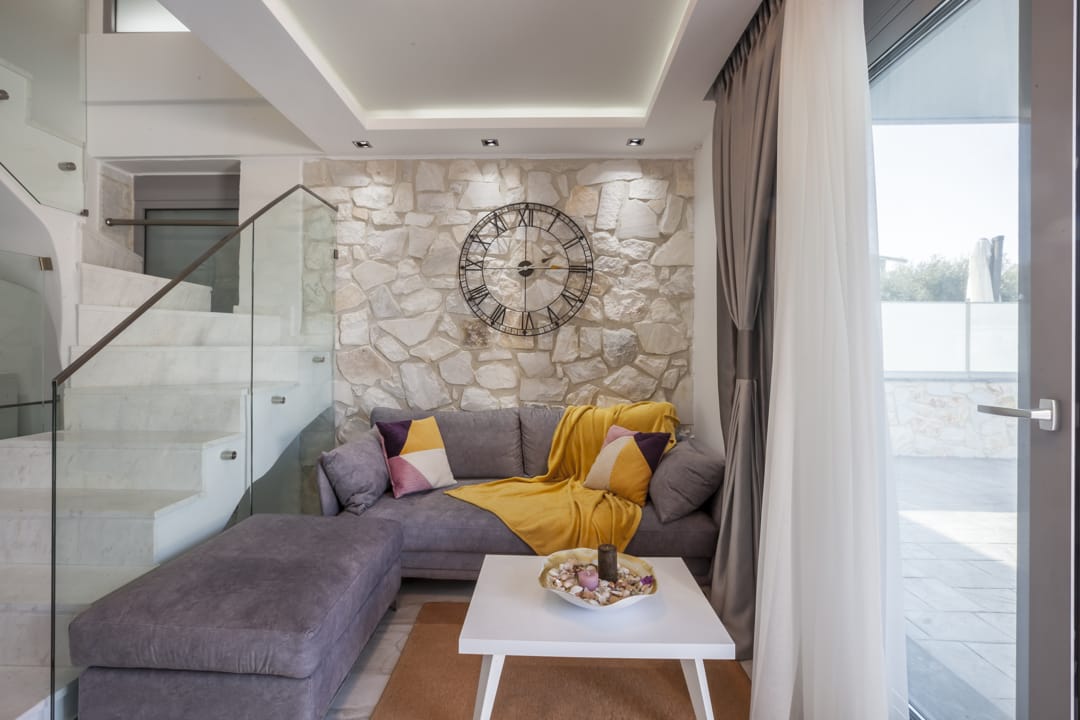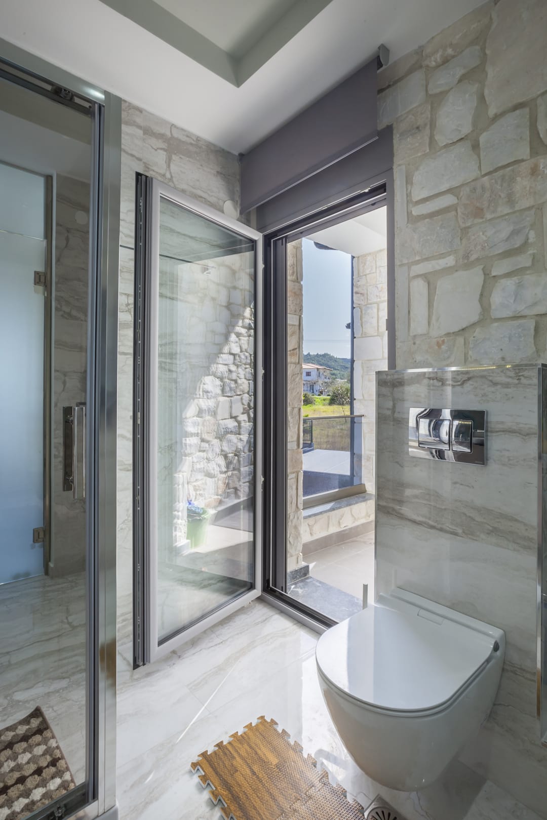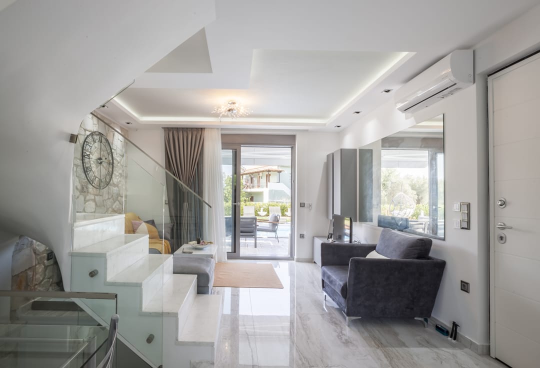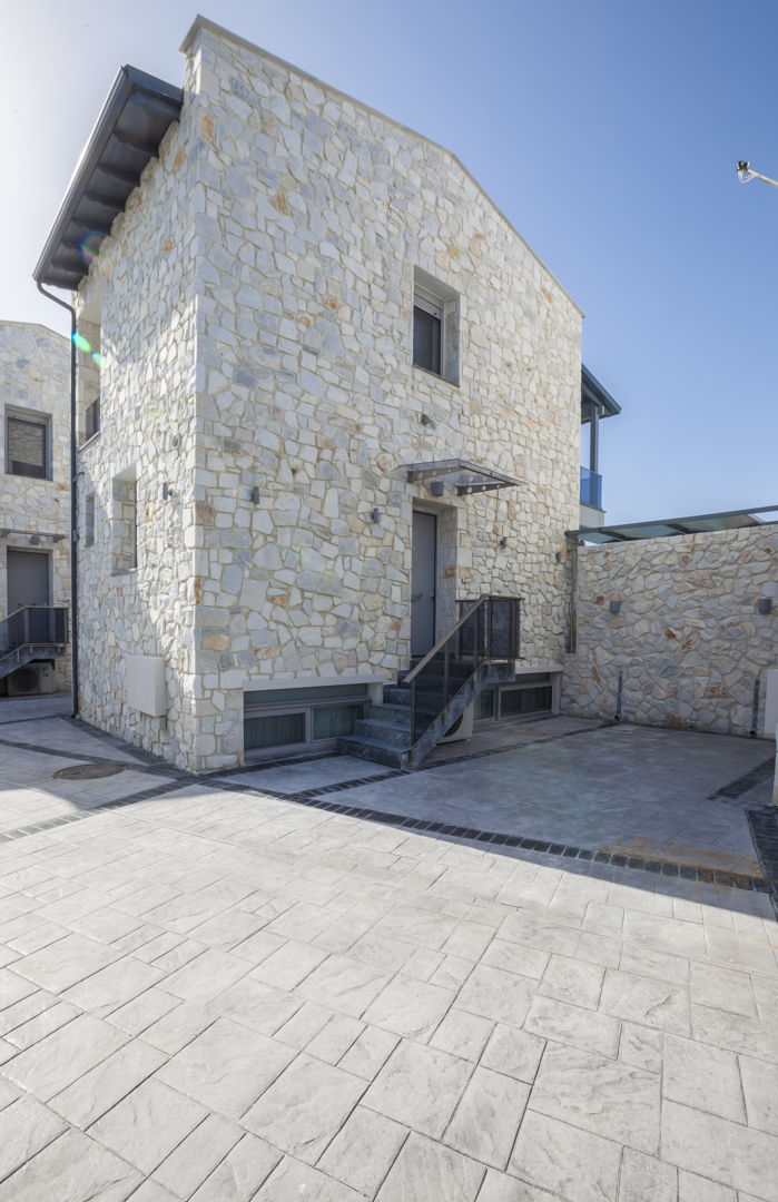 The villa is built of natural stone and is located in a complex of private villas, just 700 meters from the resort village of Hanioti. A town is a nice place for families and a relaxing holiday. However, young people will not be bored either, because there are several bars with music here. The village has a developed infrastructure with hotels, restaurants, taverns, shops, and pharmacies. Chanioti is famous also for its beaches. The coast is mostly strewn with small pebbles and stretches for several kilometers, awarded the Blue Flag.