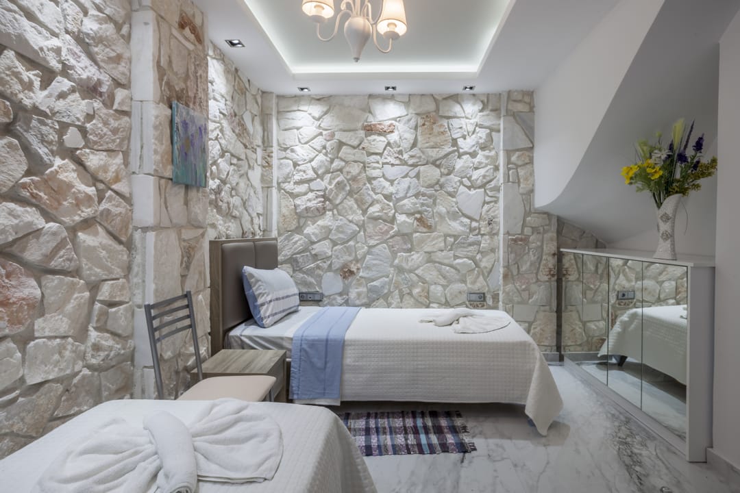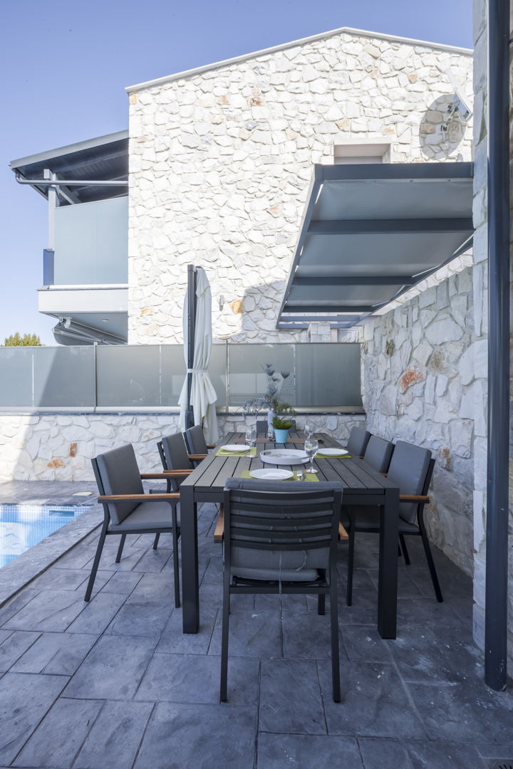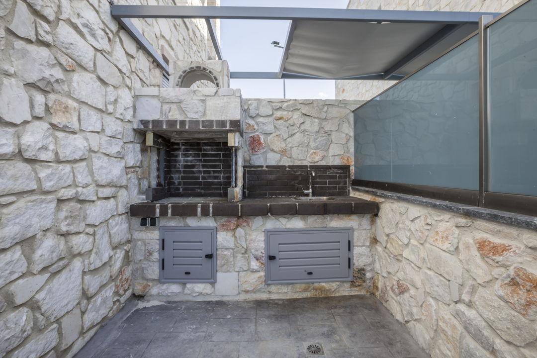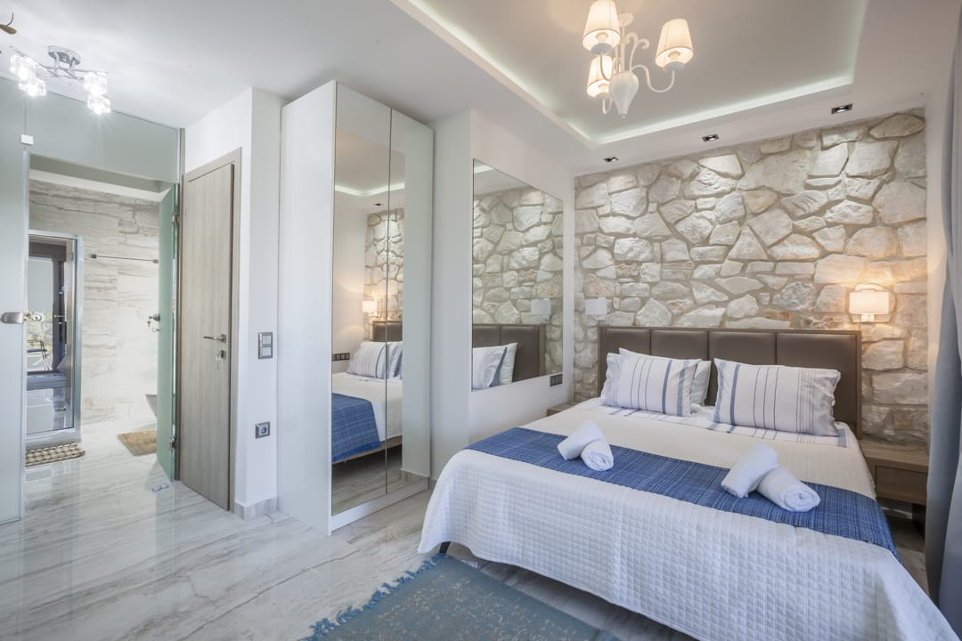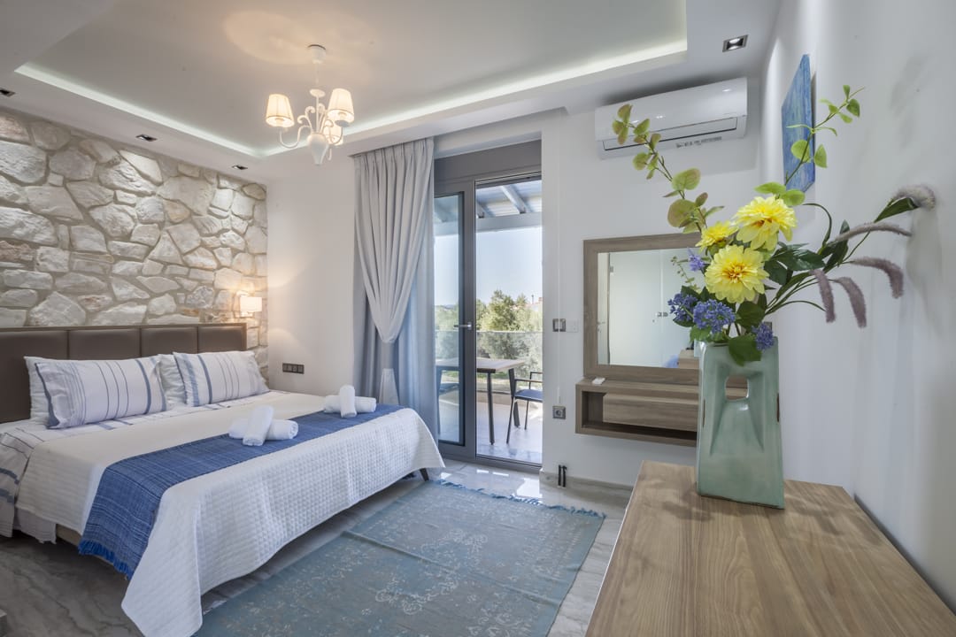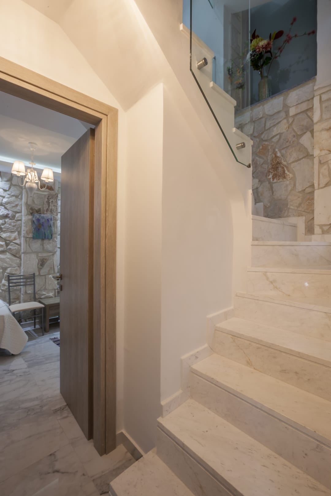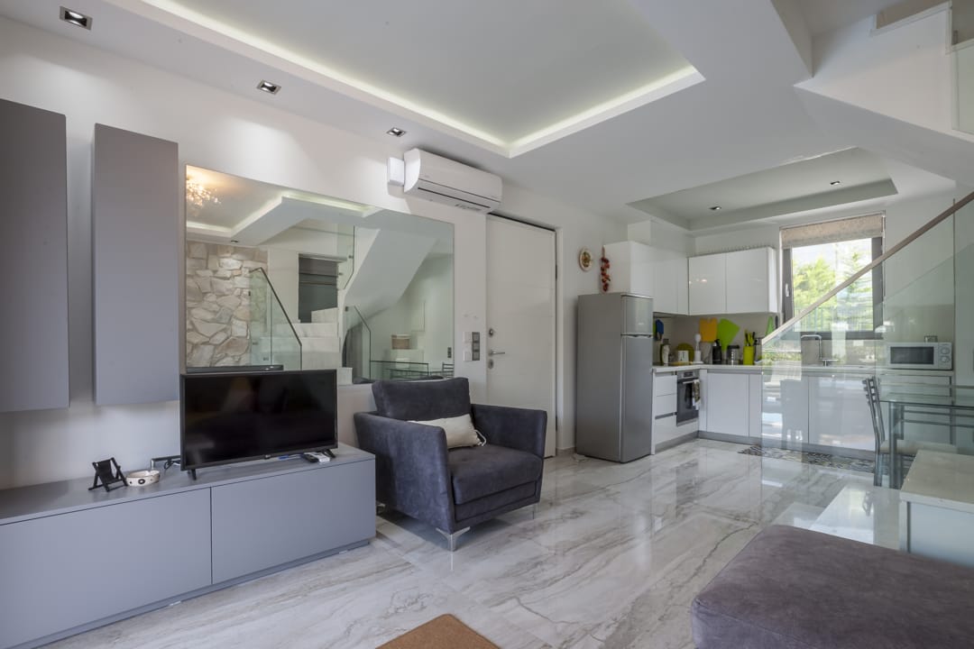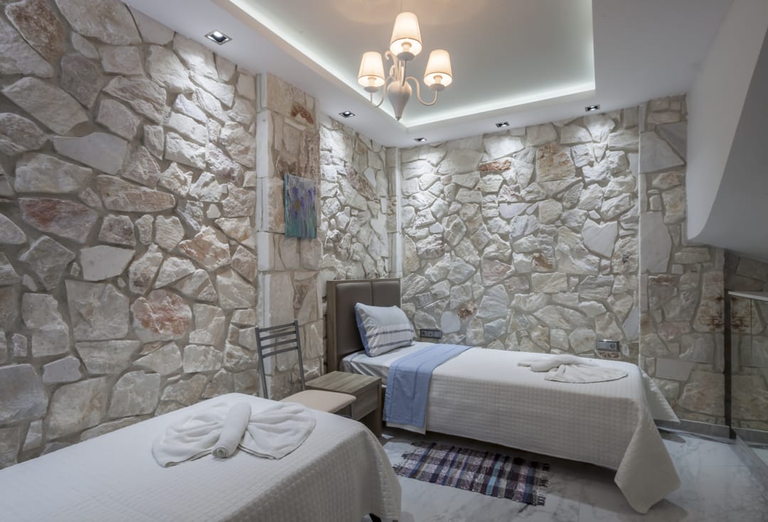 The villa is built of natural stone and is located in a complex of private villas, just 700 meters from the resort village of Hanioti. A town is a nice place for families and a relaxing holiday. However, young people will not be bored either, because there are several bars with music here. The village has a developed infrastructure with hotels, restaurants, taverns, shops, and pharmacies. Chanioti is famous also for its beaches. The coast is mostly strewn with small pebbles and stretches for several kilometers, awarded the Blue Flag.