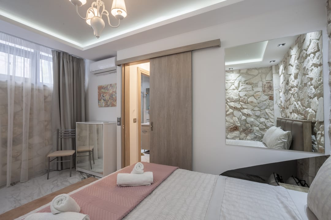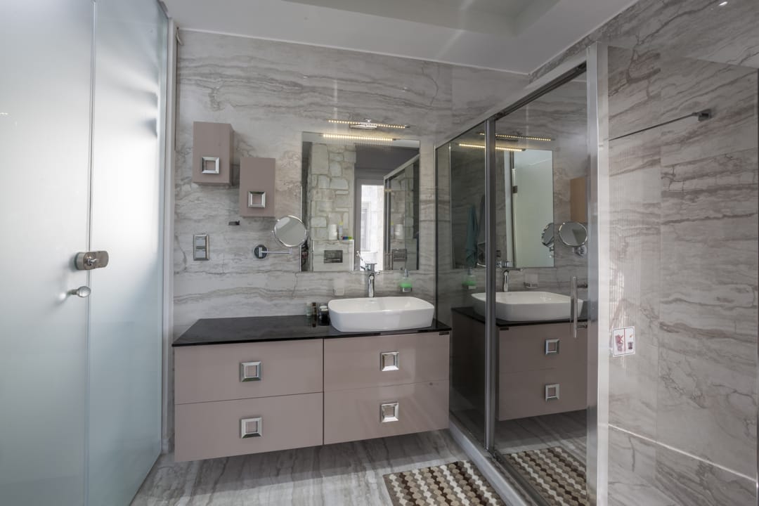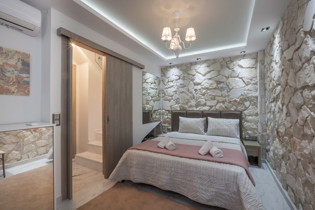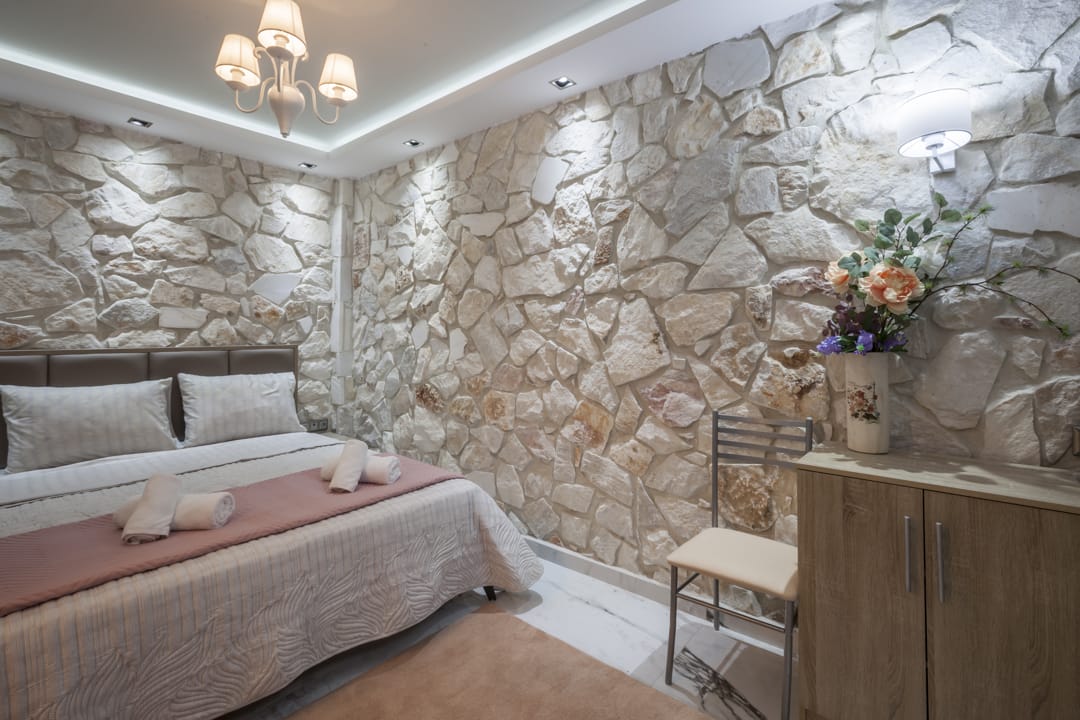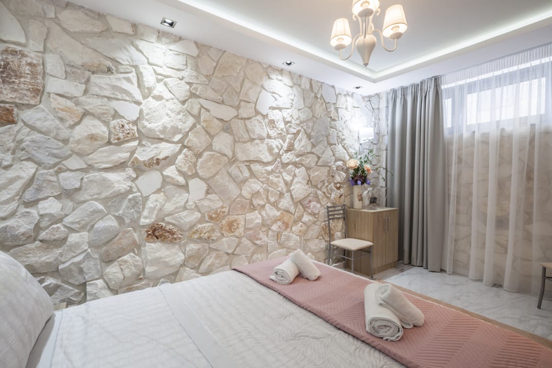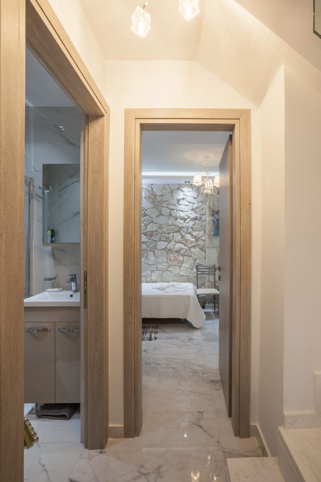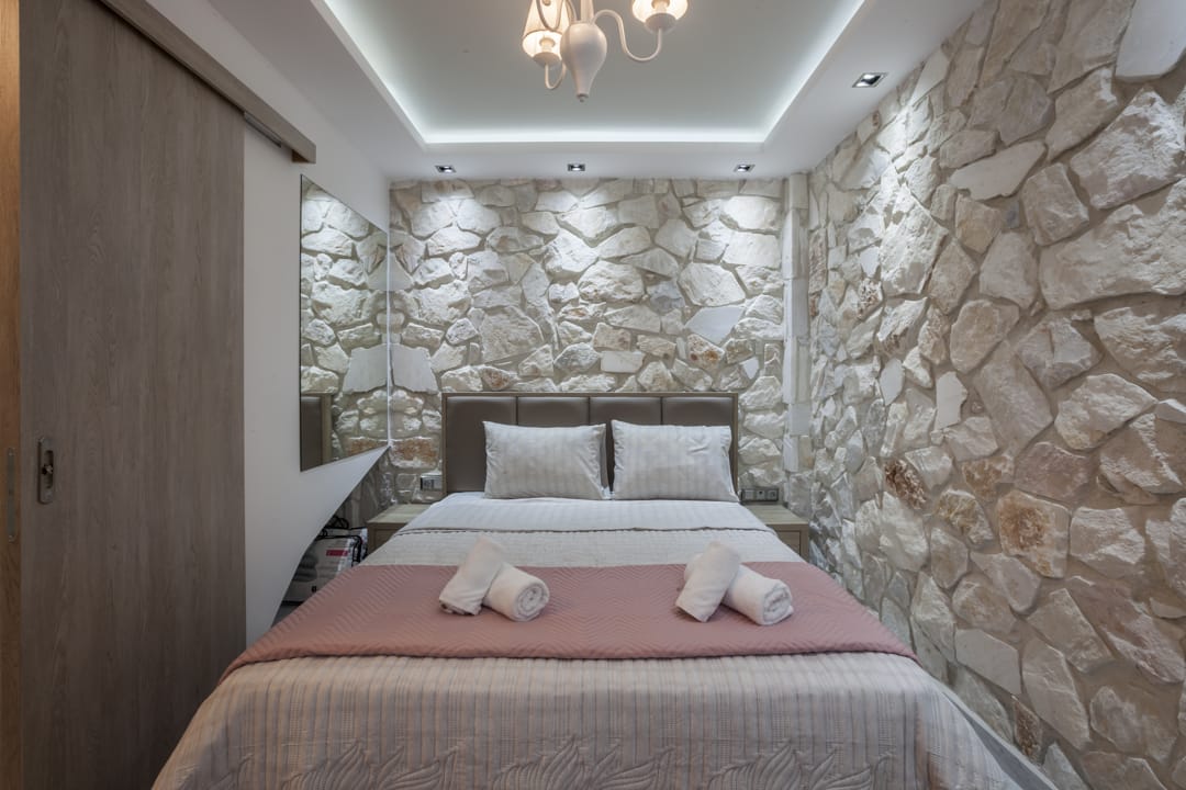 The villa is built of natural stone and is located in a complex of private villas, just 700 meters from the resort village of Hanioti. A town is a nice place for families and a relaxing holiday. However, young people will not be bored either, because there are several bars with music here. The village has a developed infrastructure with hotels, restaurants, taverns, shops, and pharmacies. Chanioti is famous also for its beaches. The coast is mostly strewn with small pebbles and stretches for several kilometers, awarded the Blue Flag.