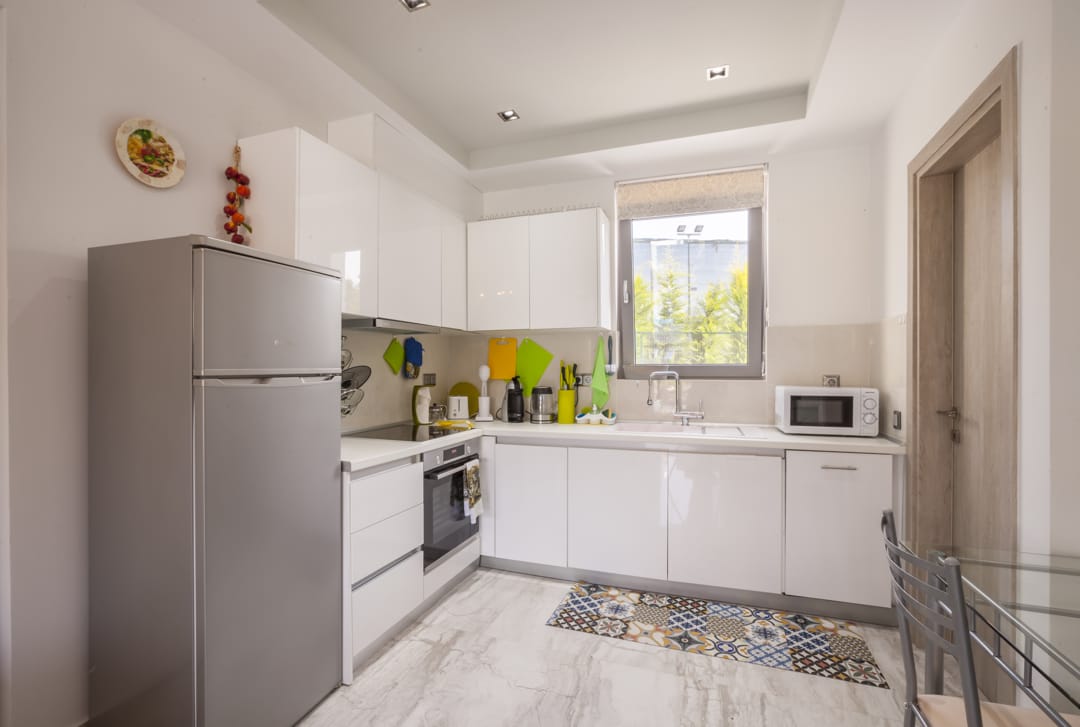- Refrigerator, stove, oven, dishwasher, microwave, kettle, coffee maker, kitchen utensils
