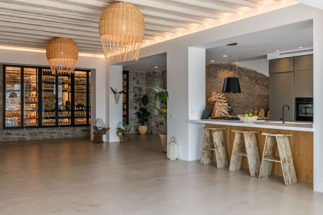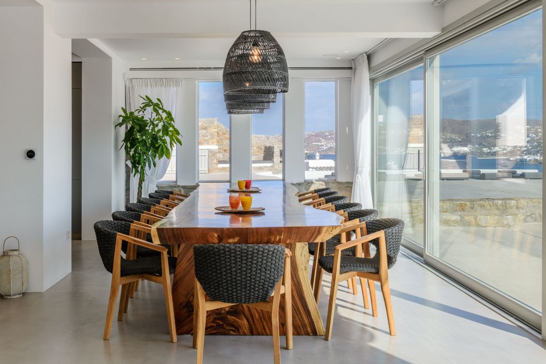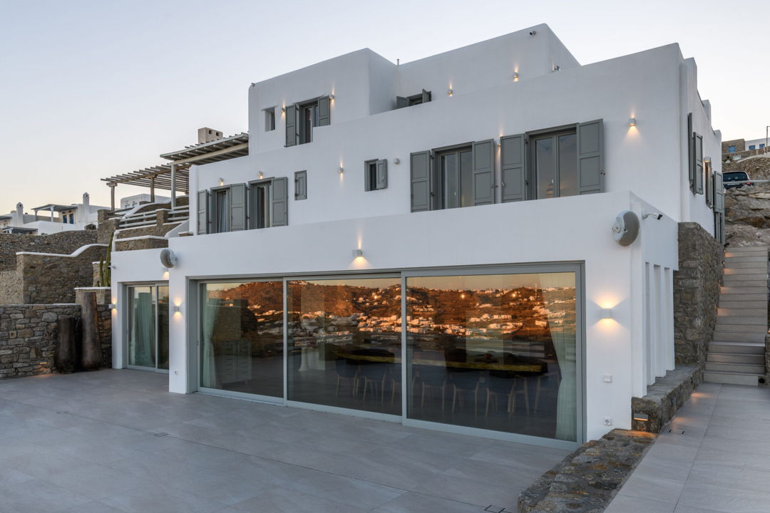 Luxury high-end Rovina Villa with 7 bedrooms and private infinity pool located only a few minutes away from Ornos and Mykonos Town, for rent.