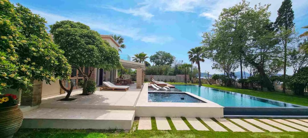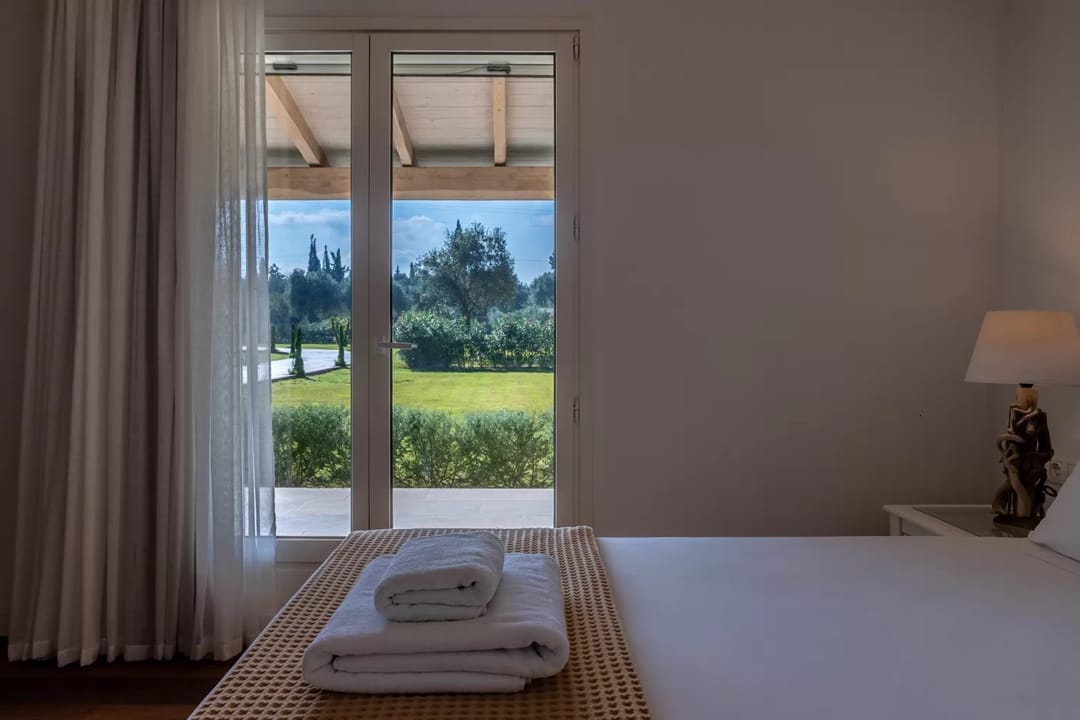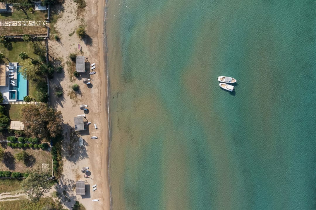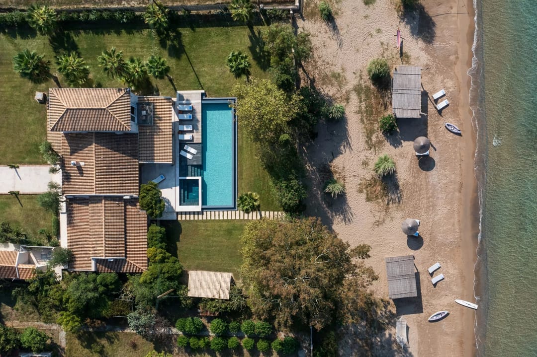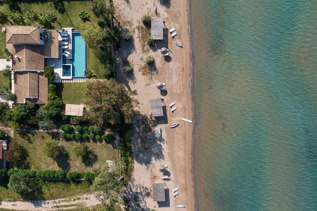 Strategically positioned next to the sandy beach, the villa ensures a constant connection with the sea. Open your estate’s door and let the gentle island breeze and the scent of fresh linen enhance your relaxation on the comfortable furniture. Indulge in a memorable dinner with loved ones in the refined dining room, or savor a glass of wine beside the chic fireplace. When you’re ready for a swim, follow the path to the private entrance of the sandy beach. Relax under your exclusive beach gazebo, lounge on the luxurious sunbeds, dip into the azure waters of the Ionian Sea, and enjoy a refreshing drink while your toes sink into the soft, golden sand.