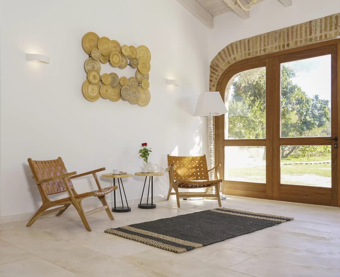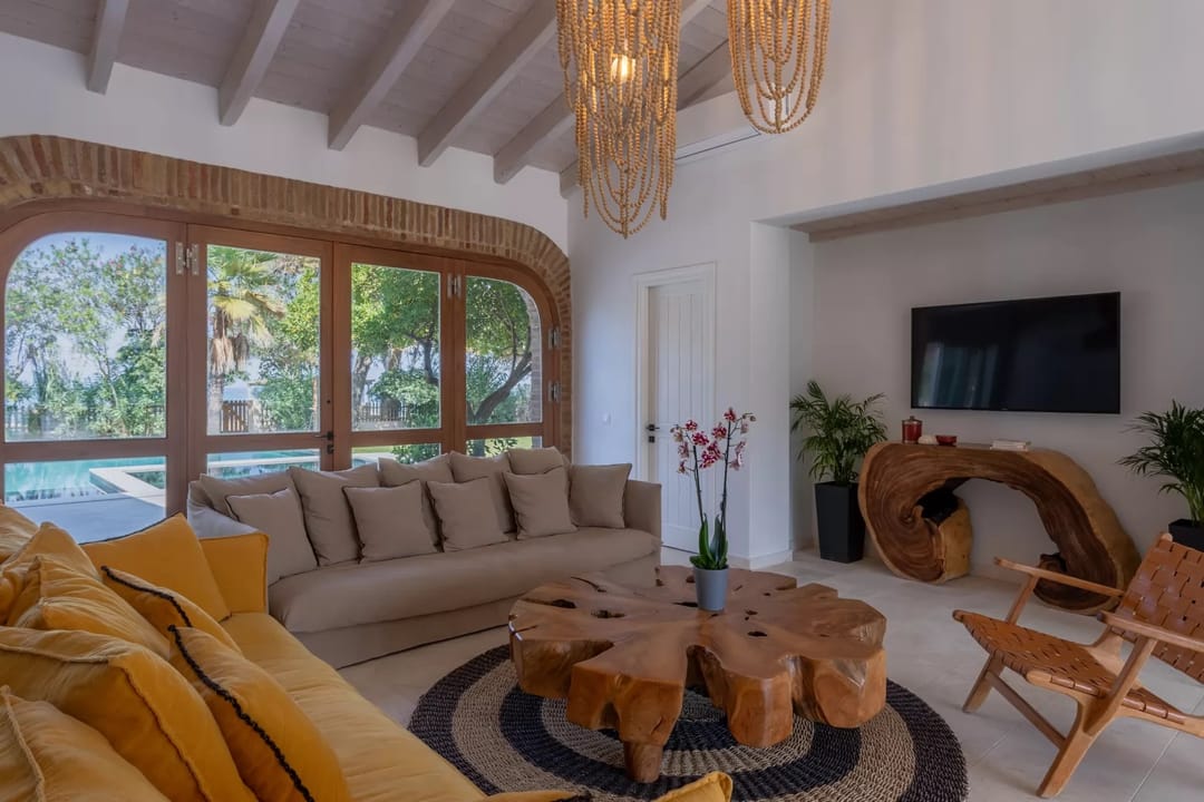 The villa is situated within an exclusive beachfront estate comprising three finely crafted villas, nestled in a landscape characterized by ancient olive trees.