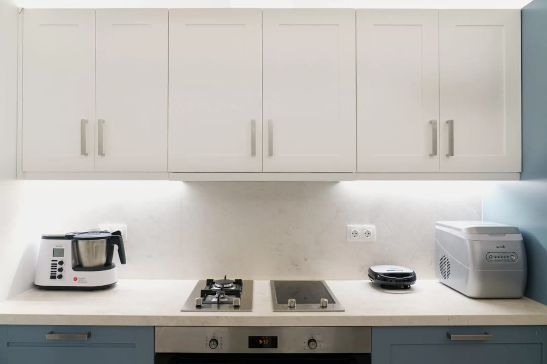 - Stovetop, refrigerator, ice machine, dishwasher, microwave oven, blender/mixer, juice extractor, Nespresso coffee machine, filter coffee machine, toaster, electric kettle