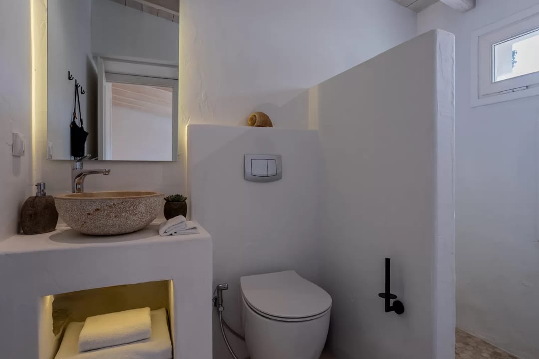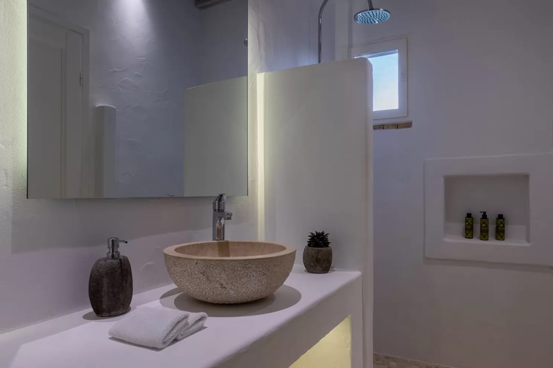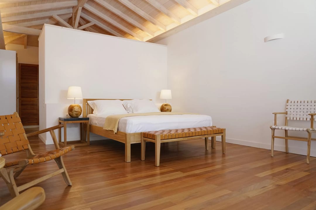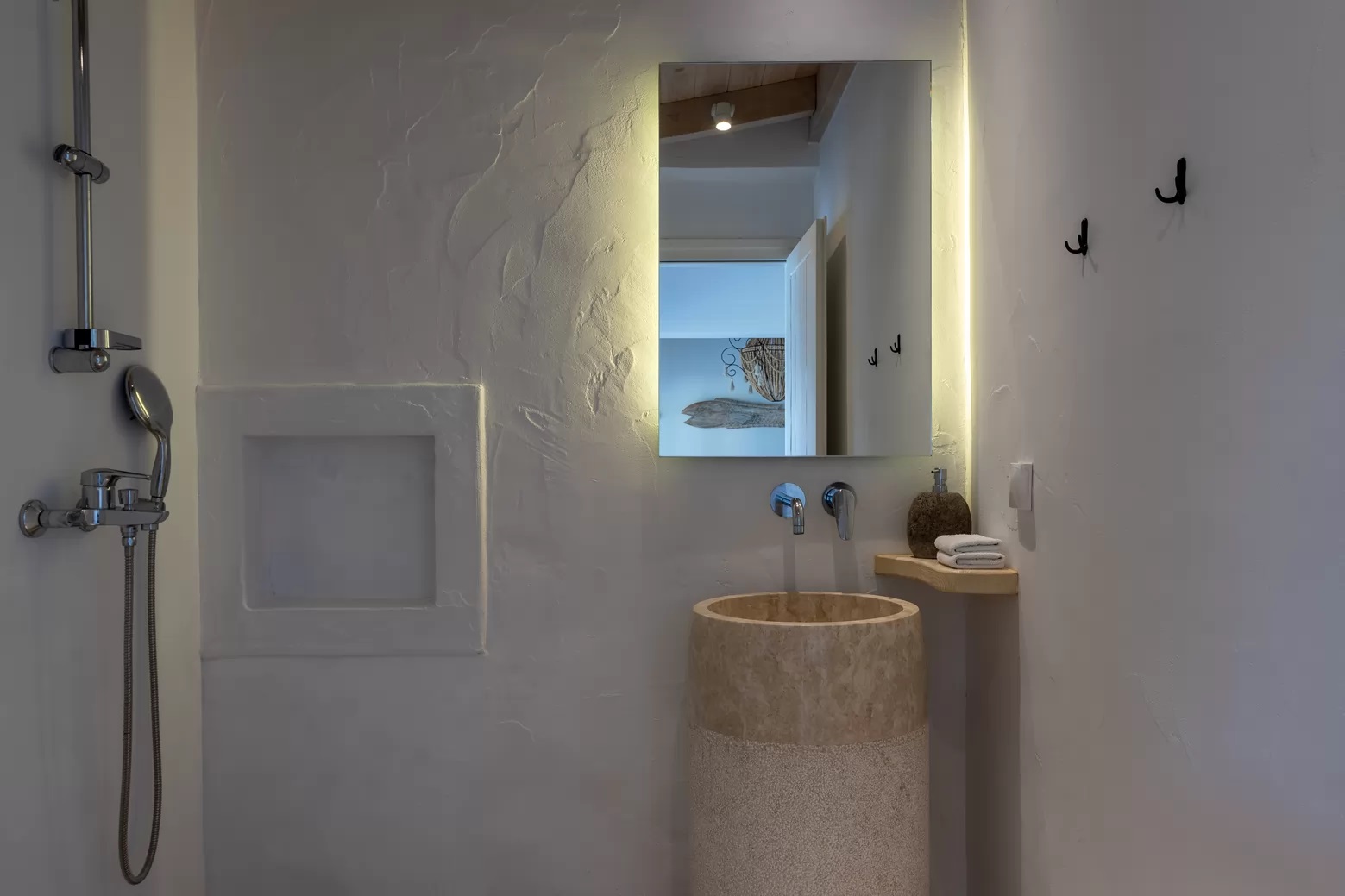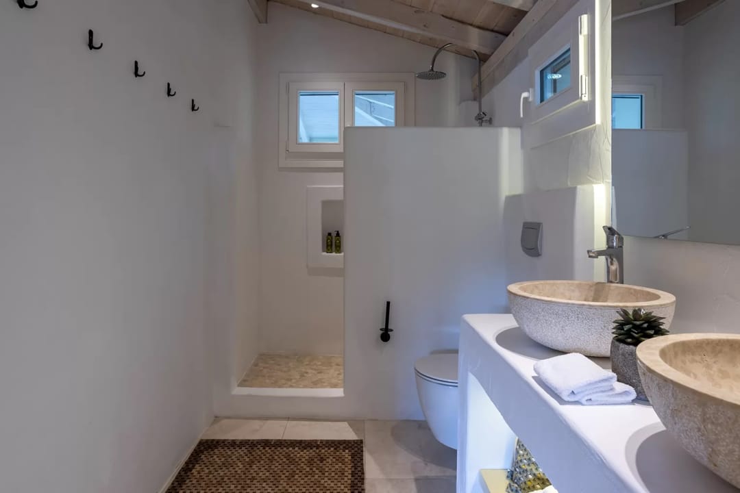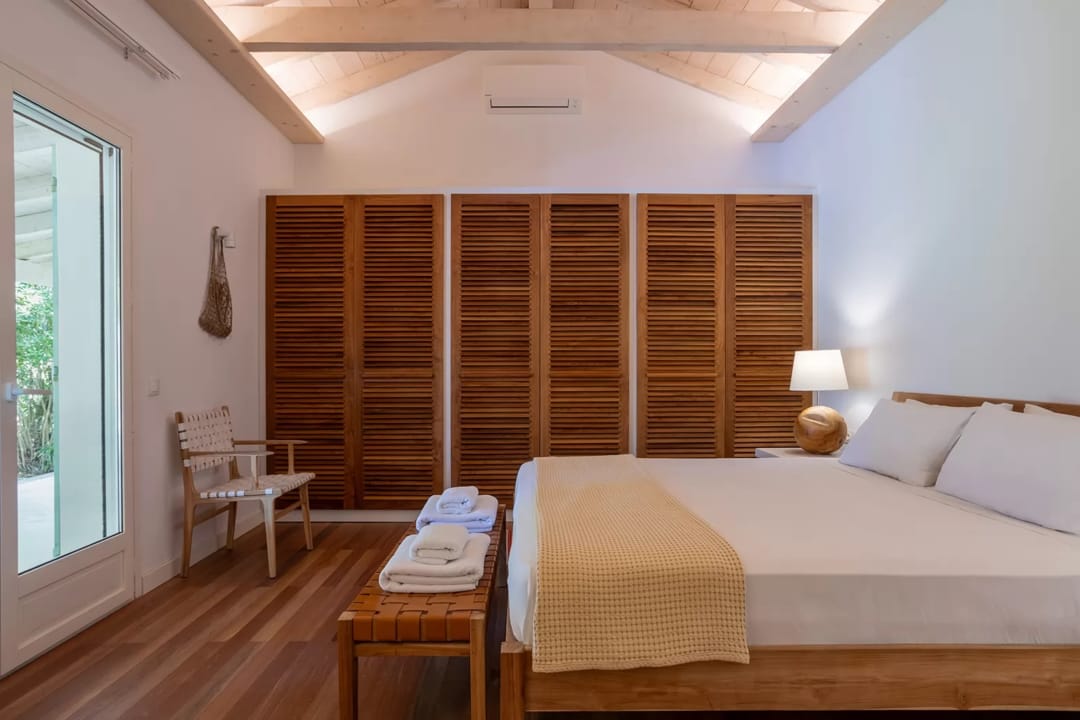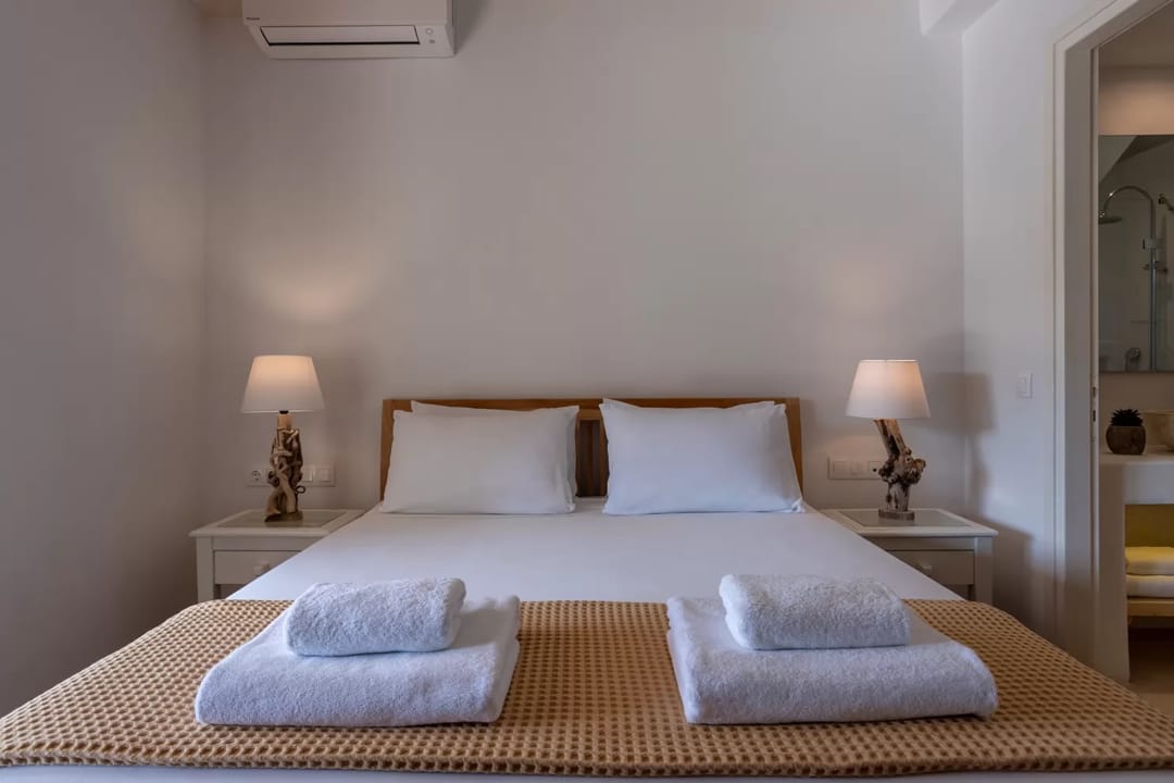 The villa features teak wood floors and furnishings in all bedrooms, elegant Greek marble, and design accents with natural earth tones. The combination of wood and stone, along with warm lighting, creates a welcoming atmosphere perfect for every relaxed moment of your stay.