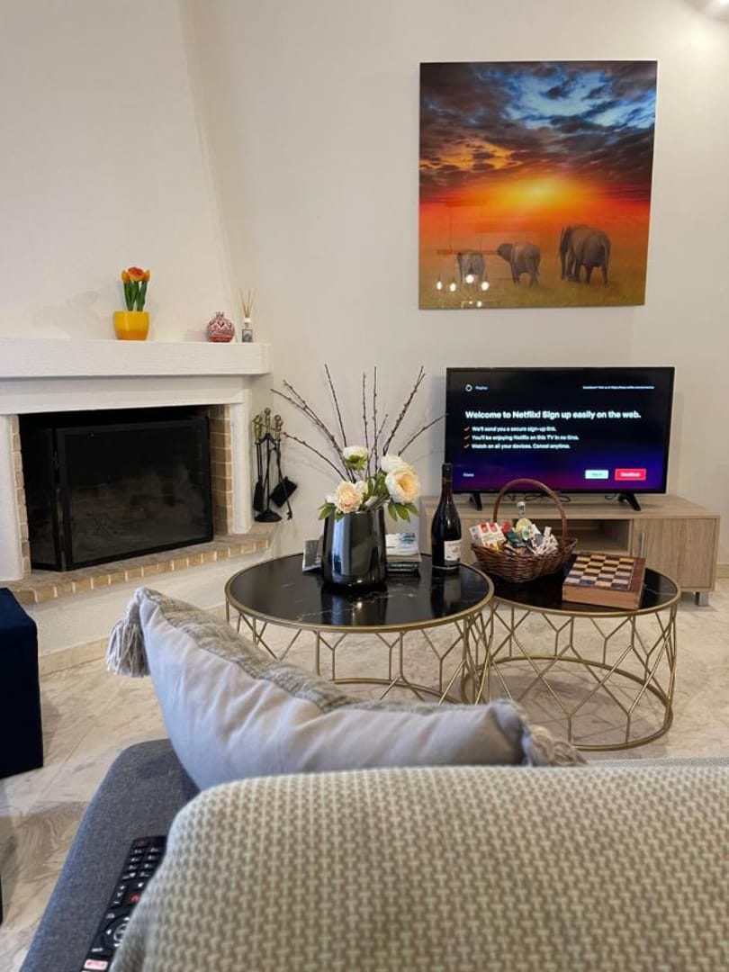 - Living room with fireplace, TV, and two-seater sofa that becomes a bed